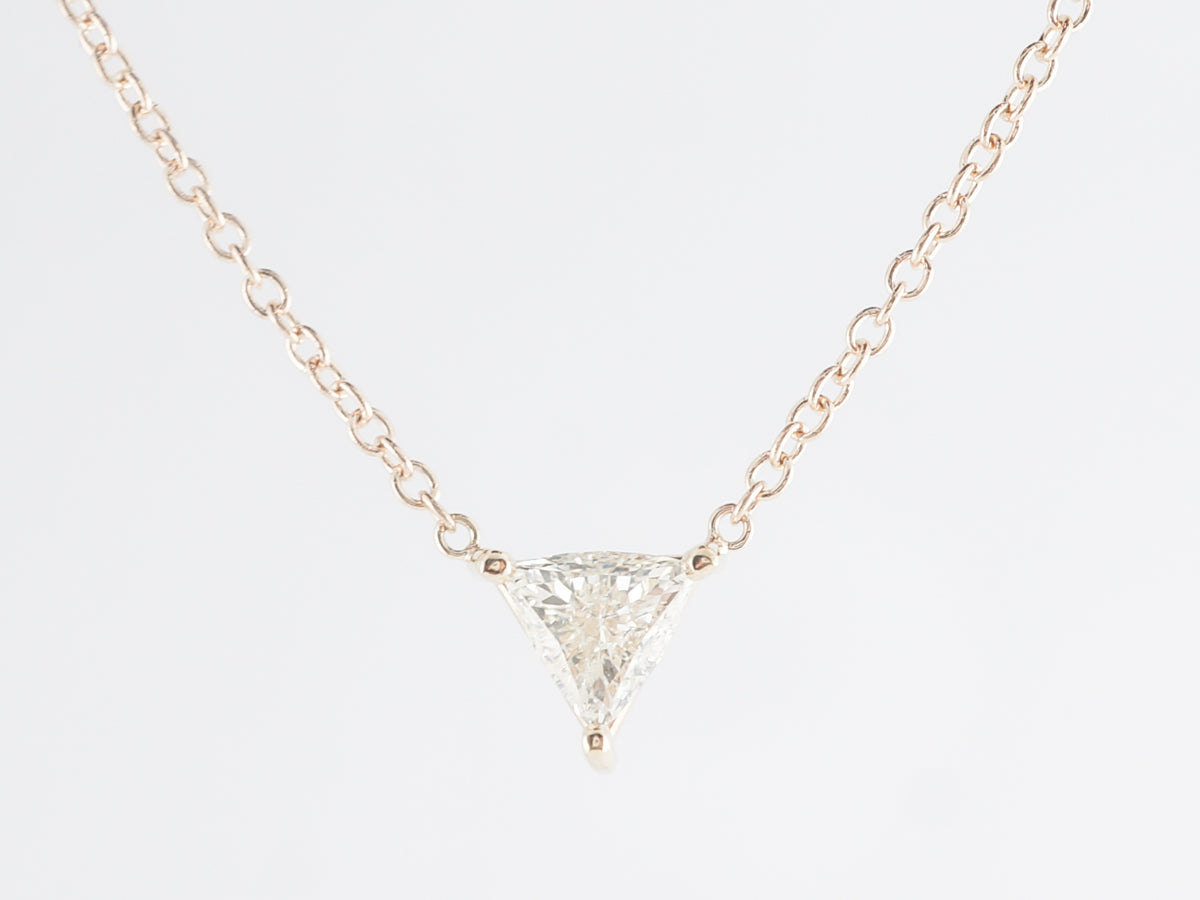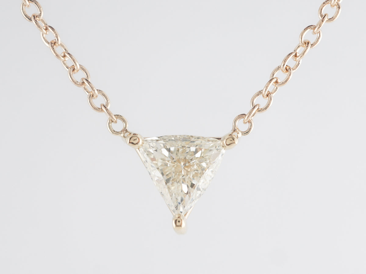 This beautiful pendant necklace features a .57 carat trilliant cut diamond set in 14 karat yellow gold. Set with a prong on each corner, the beautiful symmetry of the trilliant cut is a beautiful to behold at the end of the simple gold chain. A simple and clean design that will look great with just about anything.