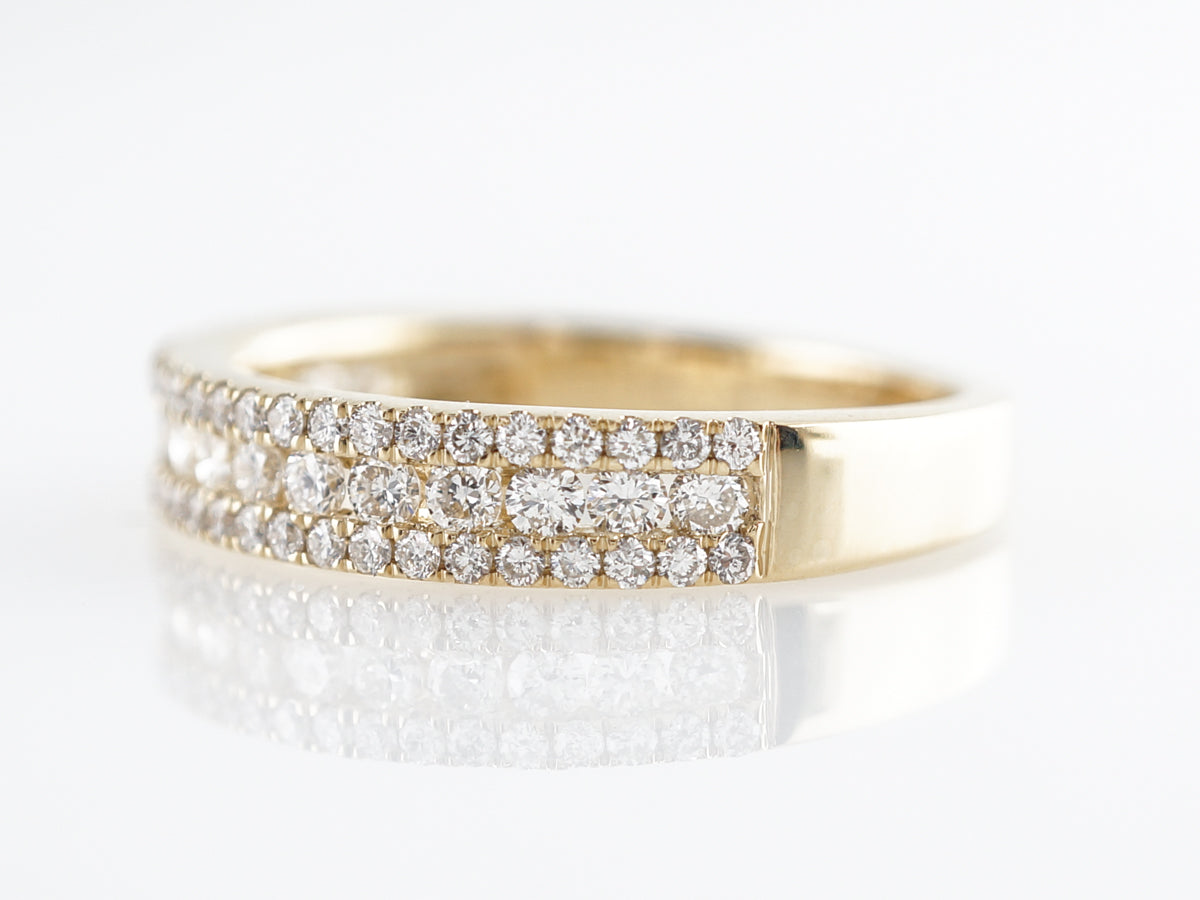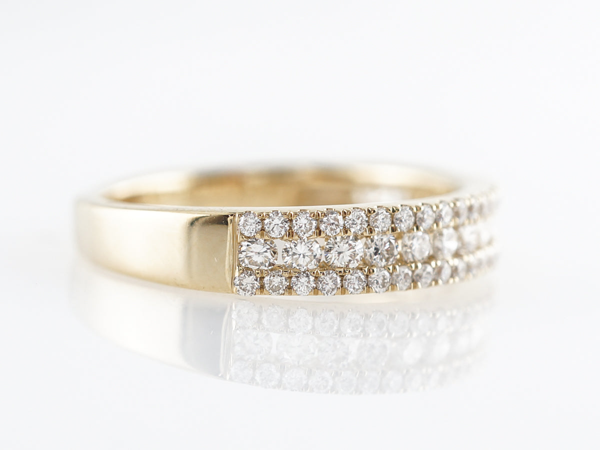 Triple Row Diamond Wedding Band in 14k Yellow Gold. This modern diamond wedding band features .64 carats of round brilliant cut diamonds set in 14 karat yellow gold. The band is relatively wide and holds three rows of diamonds across its top half. A larger diamond look than most wedding bands which could make this a great candidate for wear on the right hand!
