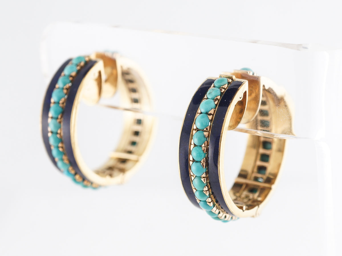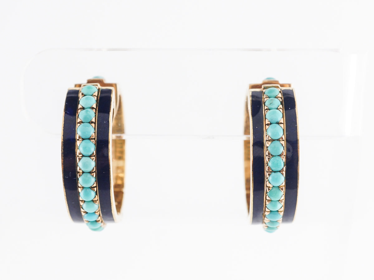 Thick Hoop Earrings w/ Turquoise in 18k Yellow Gold. Such a beautiful color palette in these turquoise and enamel hoop earrings done in 18 karat yellow gold. The large flat hoops hold the line of turquoise inside the dark enamel borders, and let just a bit of gold peak out to create a stunning look. Not too heavy to make them uncomfortable to wear, but hefty enough to turn some heads!