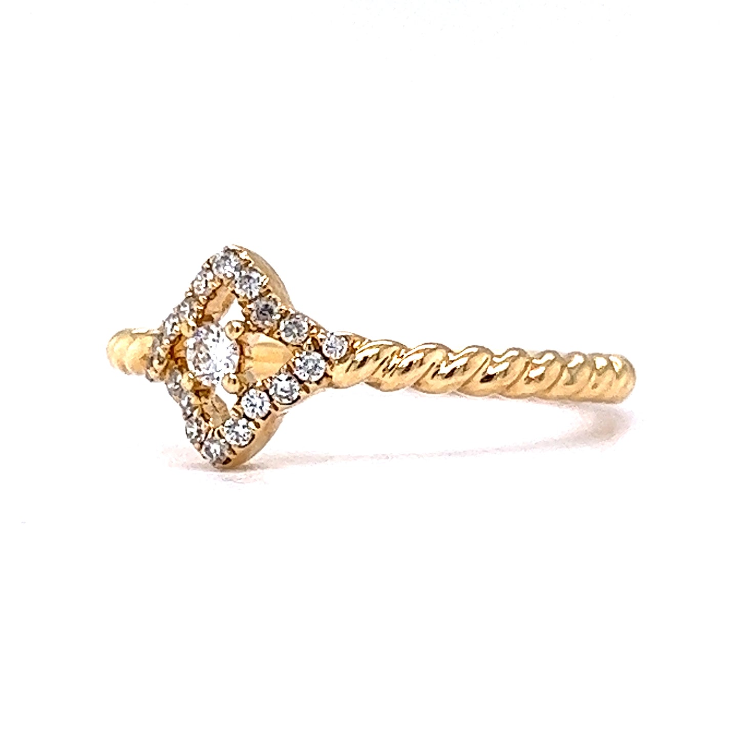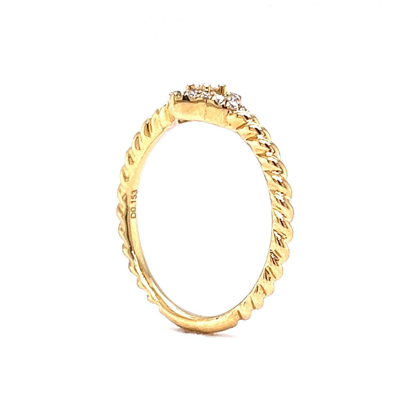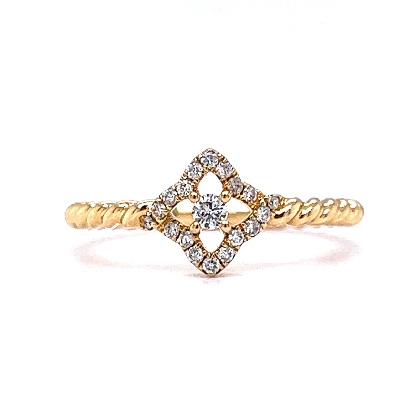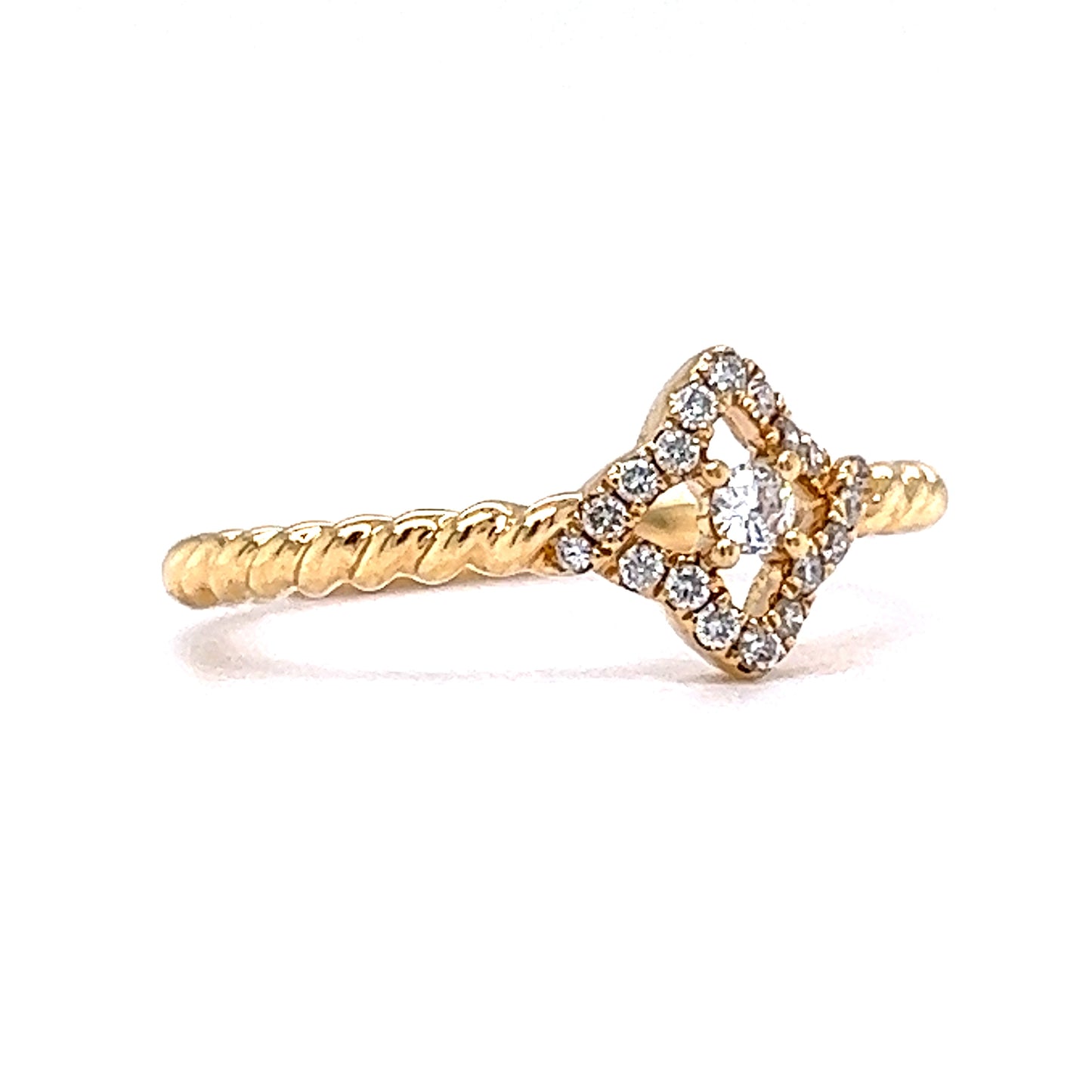 Dazzling with a twisted band – this elegant diamond stacking ring features a pave of Round Brilliant cut diamonds in 18 karat yellow gold. At the center, a .05 carat white Round Brilliant cut diamond sparkles, set in four prongs. A geometric halo of eighteen (18) accent diamonds glitter around the center stone. Finished in high polish 18K yellow gold, this stacking ring look fabulous with more Yellow Gold Stacking Rings or with White Gold Rings for a modern two-tone look!