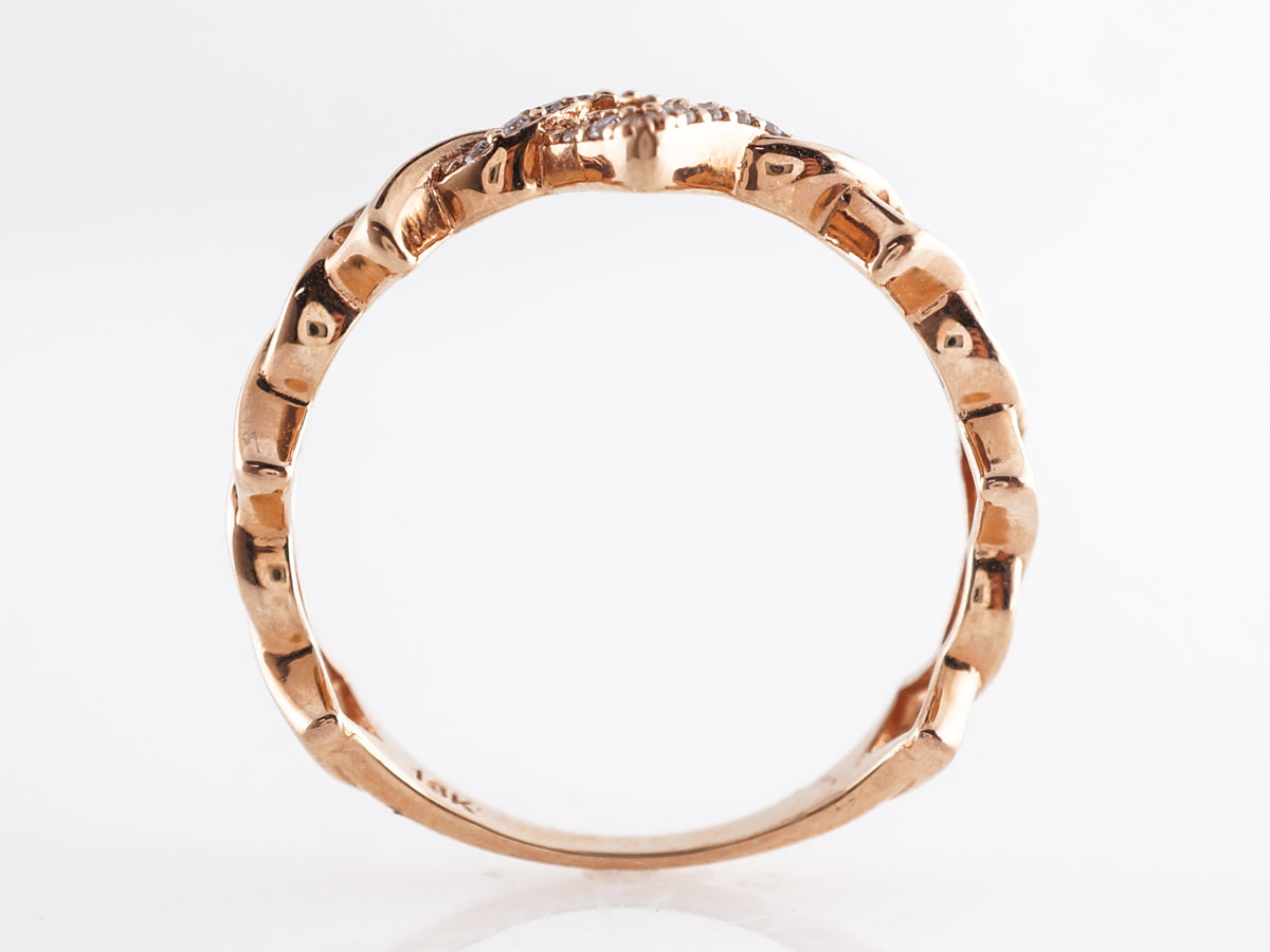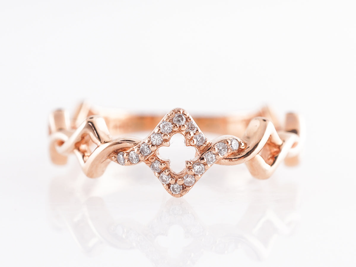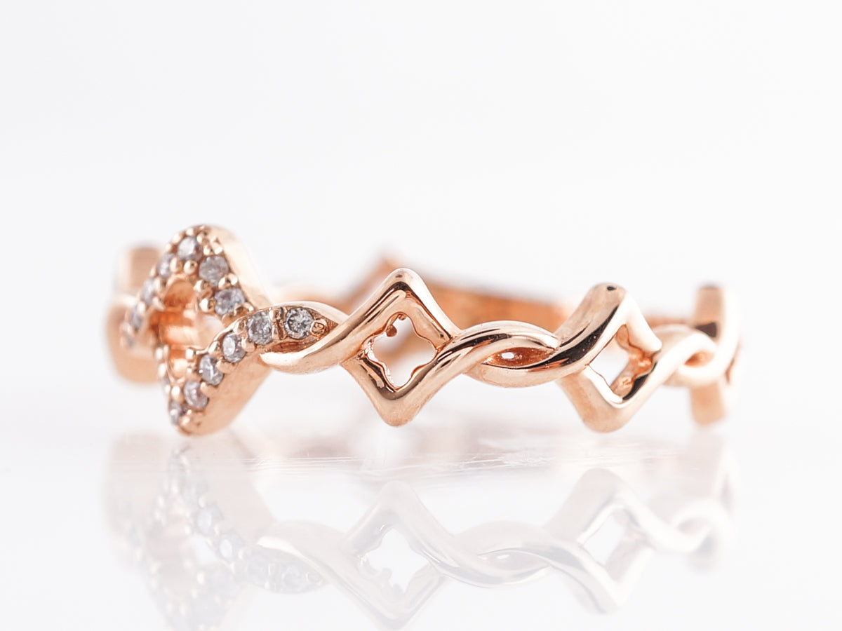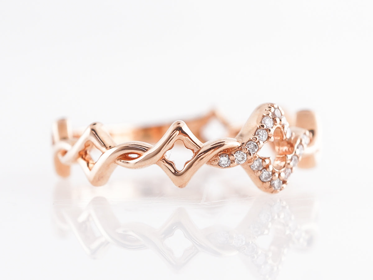 Twisted Clover Wedding Band w/ Diamonds in 18k Rose Gold. This interesting clover wedding band features .06 carats of diamonds set in 18 karat rose gold. The ring makes use of two parts of the shank interwoven to create lovely open sections with small diamonds interlaced. A great rose gold piece for either your right hand stack or paired with your engagement ring.