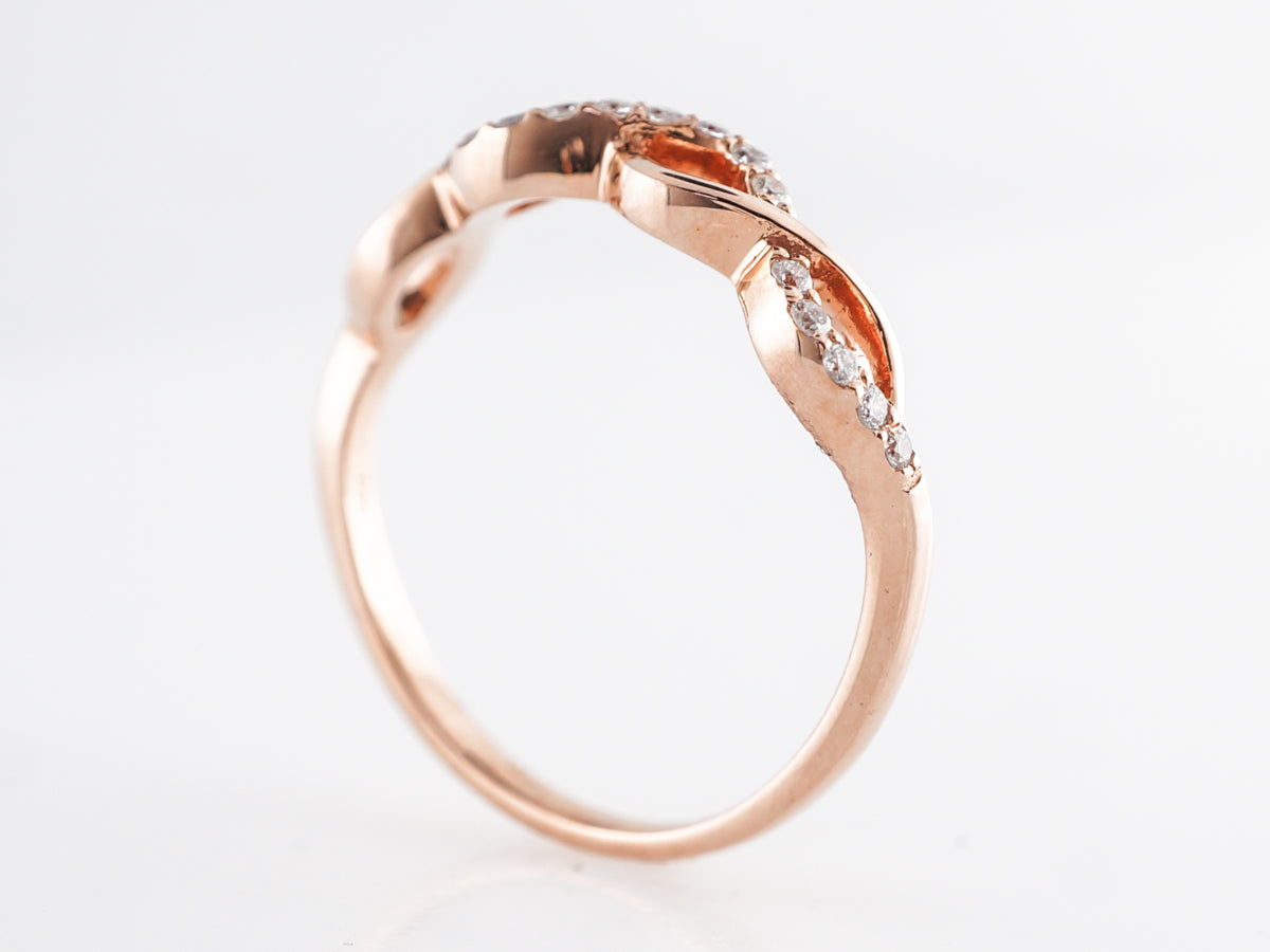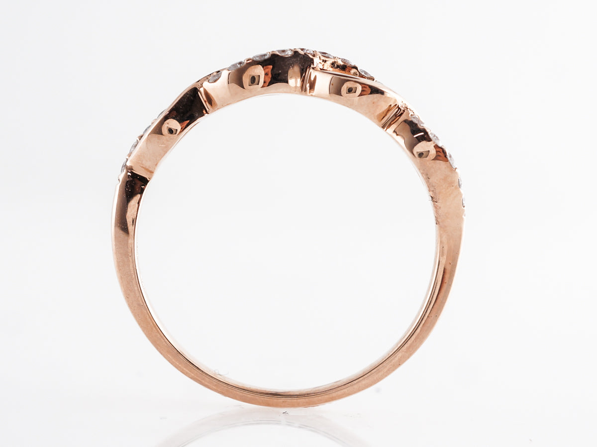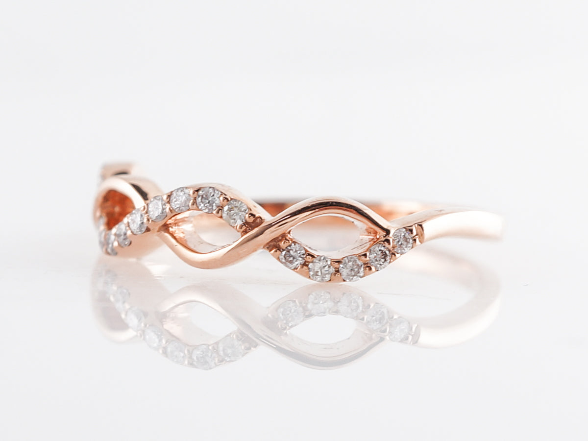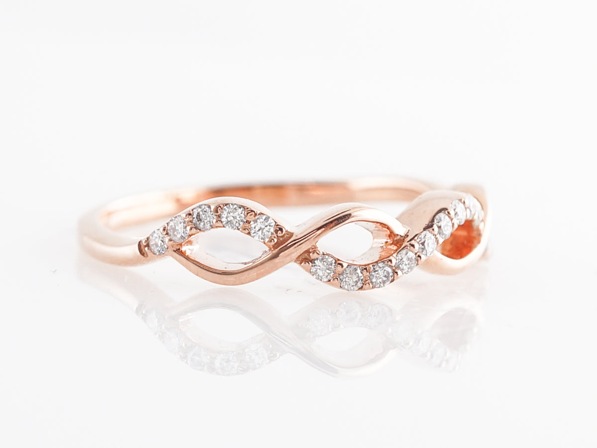 Twisted Wedding Band w/ Diamonds in 14k Rose Gold. This twisting rose gold wedding band features .14 carats of round brilliant cut diamonds. The ring is finished in 14 karat rose gold and has a mesmerizing overlapping twist design that creates a bold look for an otherwise dainty ring.