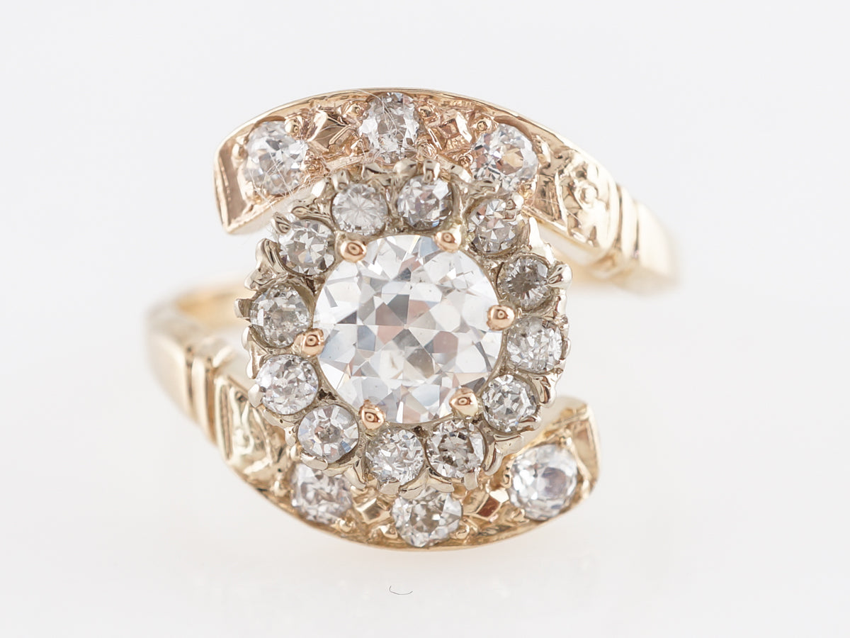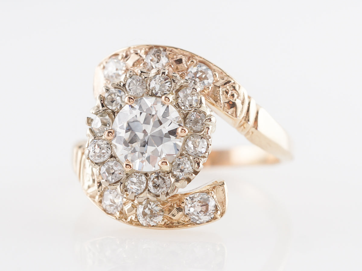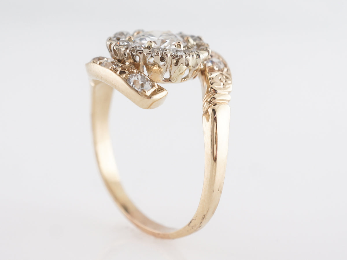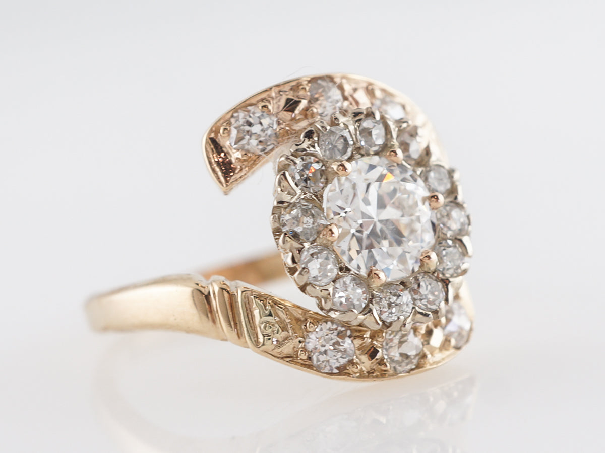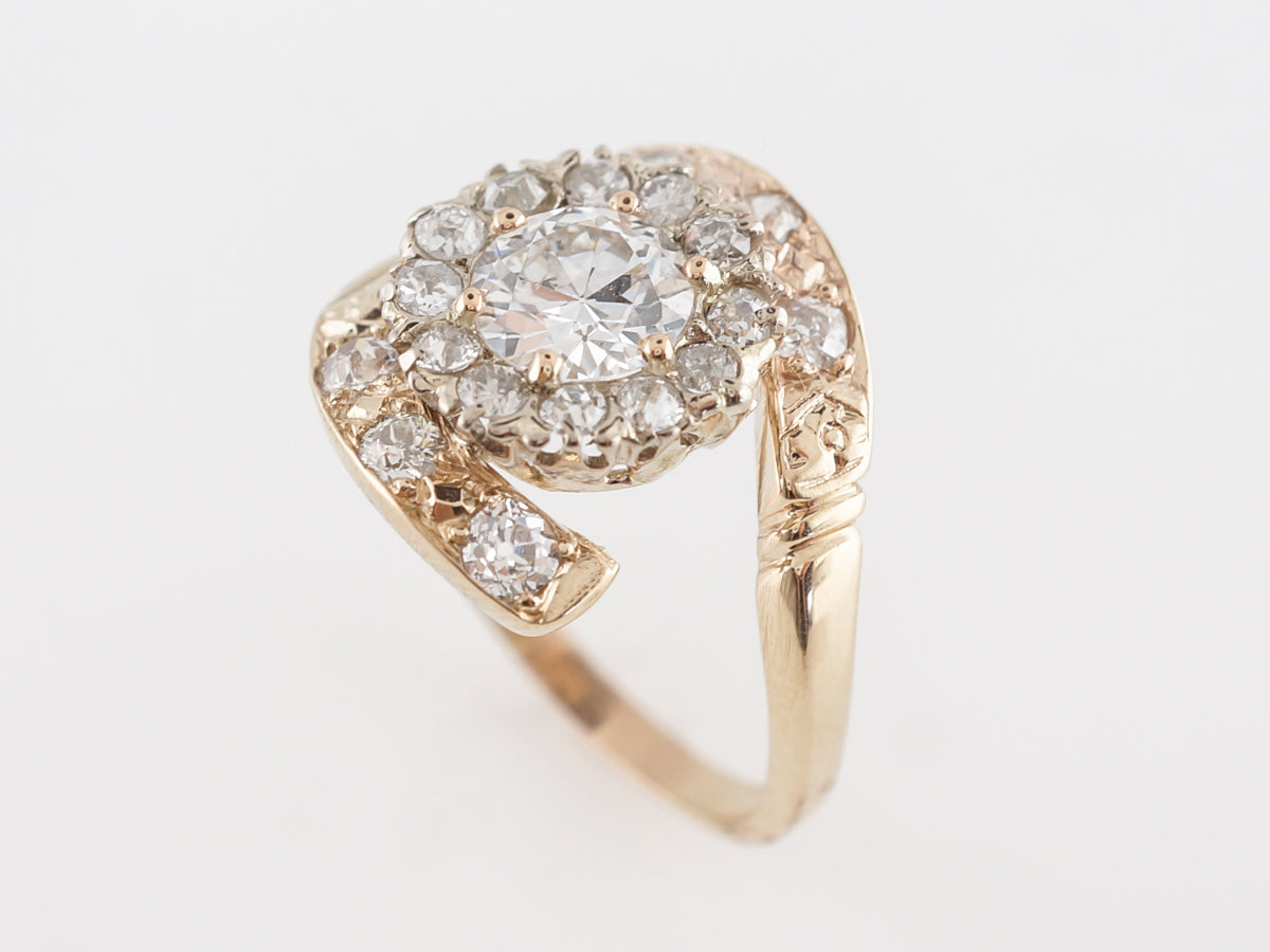 This spectacular engagement ring features a GIA certified .70 carat Old European cut diamond set in 14 karat yellow gold. Immediately around the center stone is a halo of smaller diamond accents, which is then hugged by a more substantial line of Old Mine cut diamonds as the shoulders twist around the center. Below the accent diamonds, the shoulders are adorned with neat engravings to further enhance this beautiful ring.