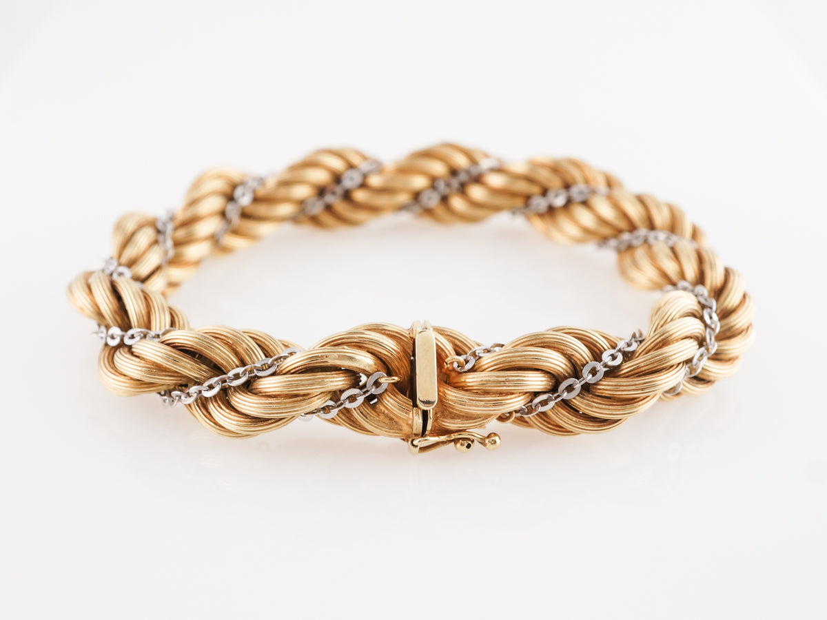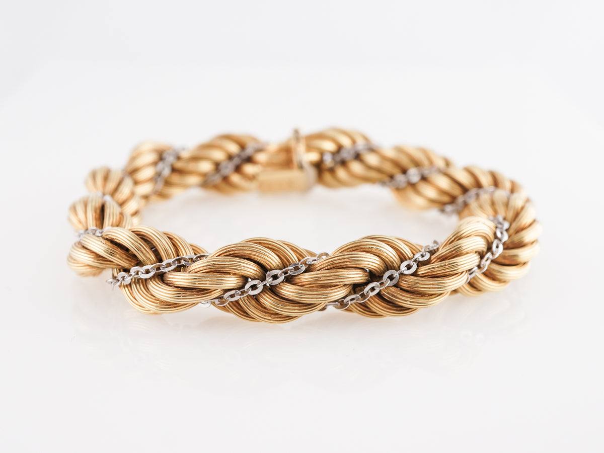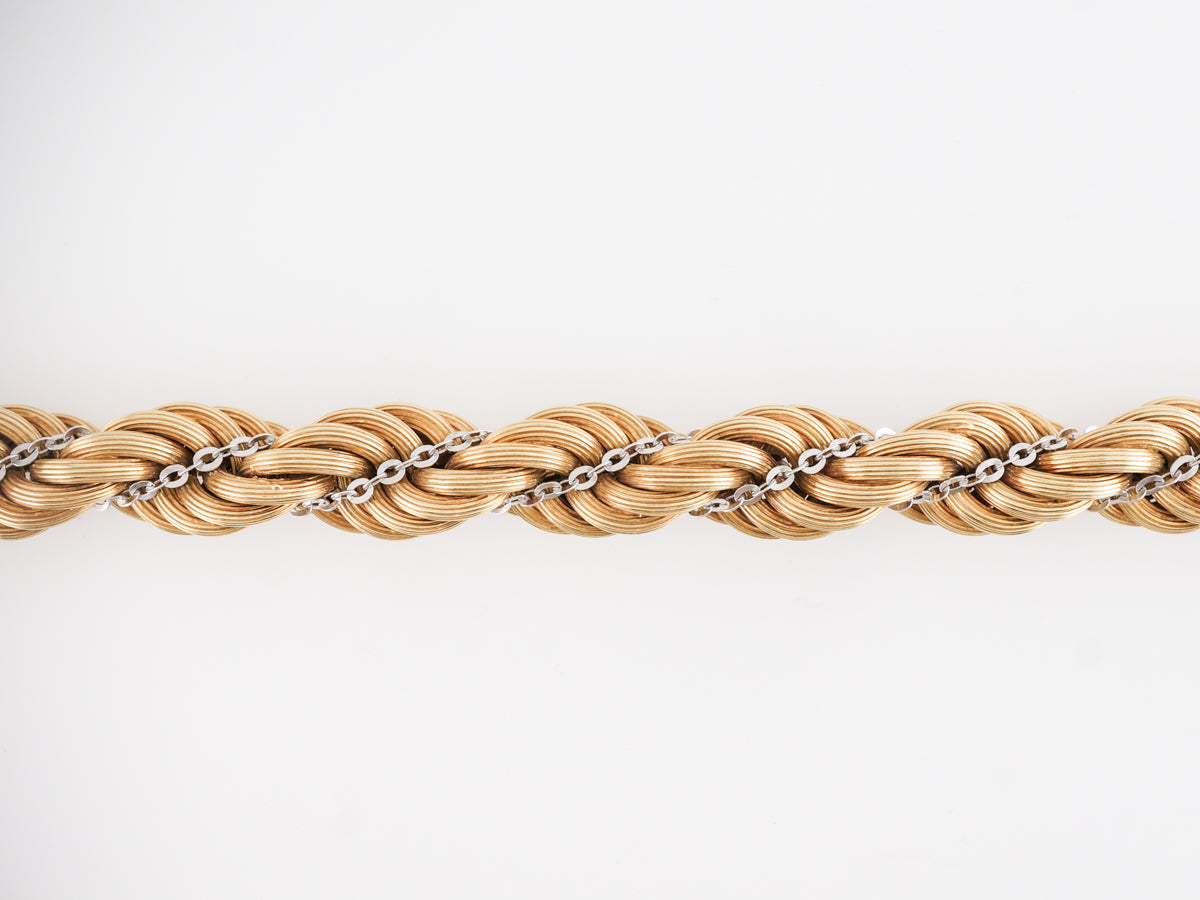 Two-Tone Braided Link Bracelet in 14k. This chunky modern bracelet is finished in 14 karat yellow and white gold. Weighing 32.1 grams, the large corded braids of this bracelet are paralleled by a flat link white gold chain that stays in the deeper part of the groove. The presence of the white gold chain provides a way to break up the color and creates a nice contrast of color, amid the contrast of textures. This bracelet measures 8 inches in length.