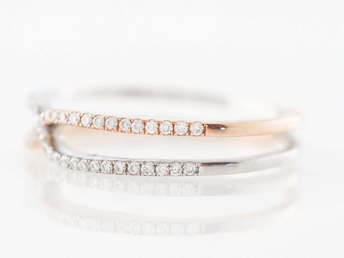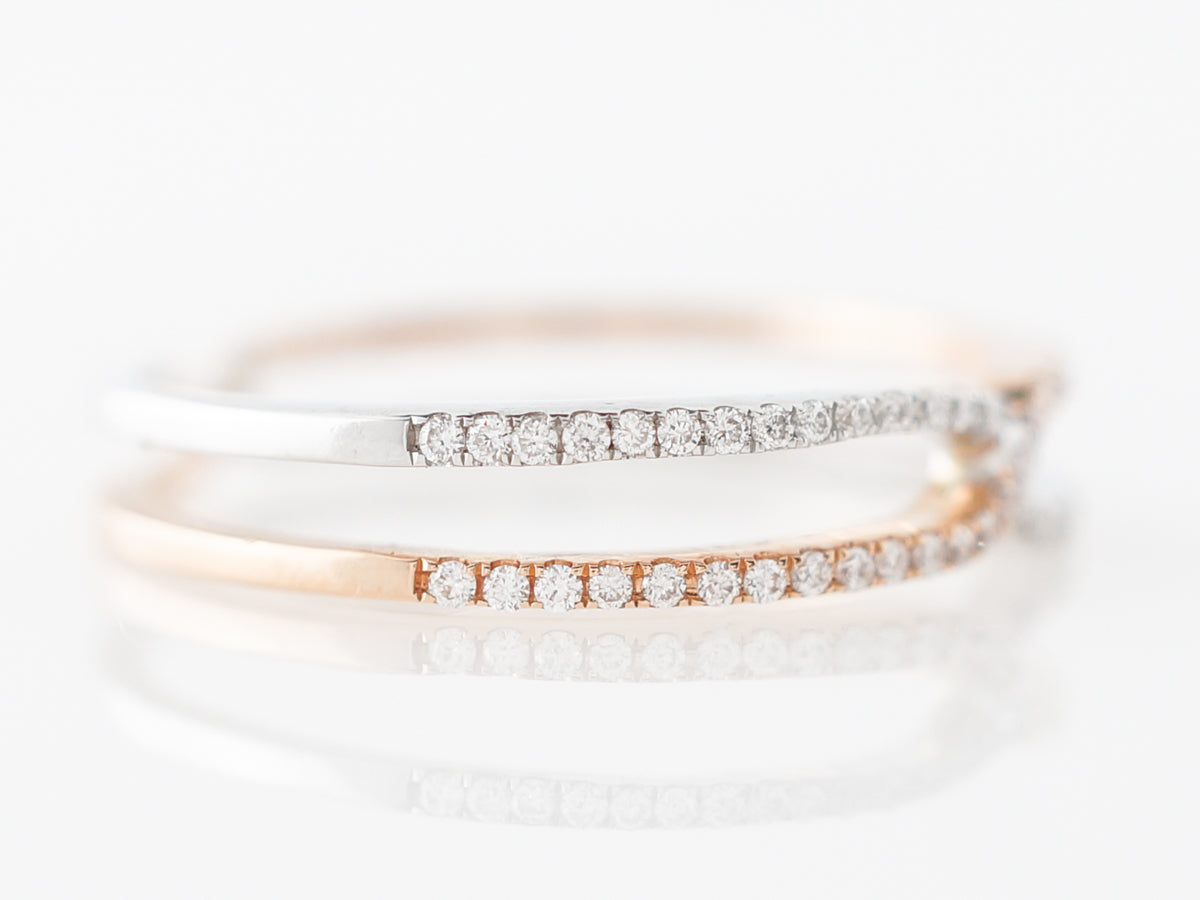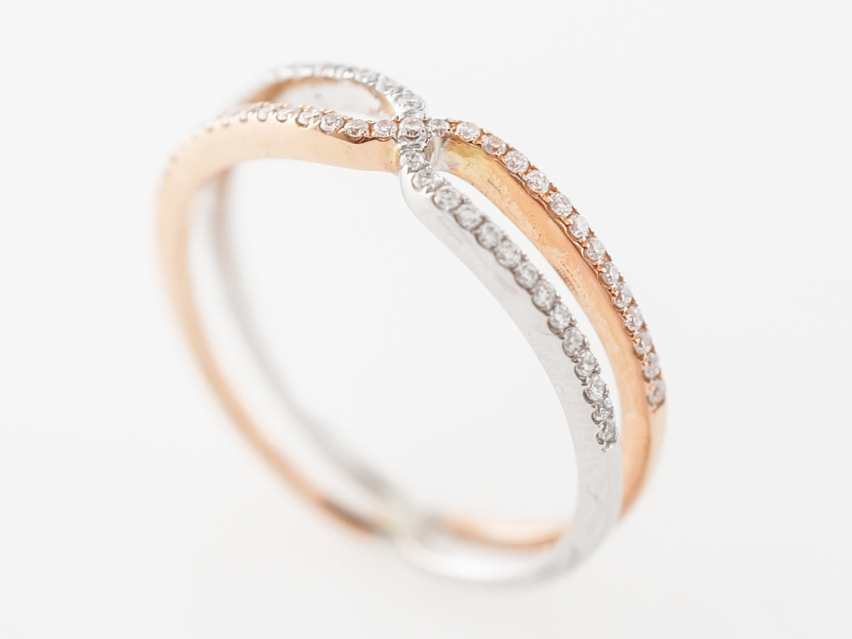 Two-Tone Diamond Ring in White and Rose Gold. This modern right hand ring features .57 carats of diamonds set in both white and rose gold. The top of the ring presents an all diamond appearance that shimmers at every turn of the hand. The criss-cross design adds a unique element to the design and allows the two-tone gold to shine!