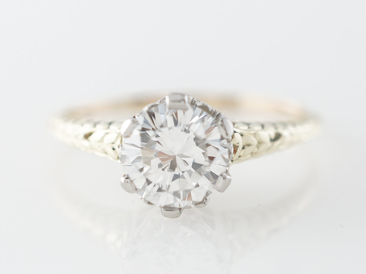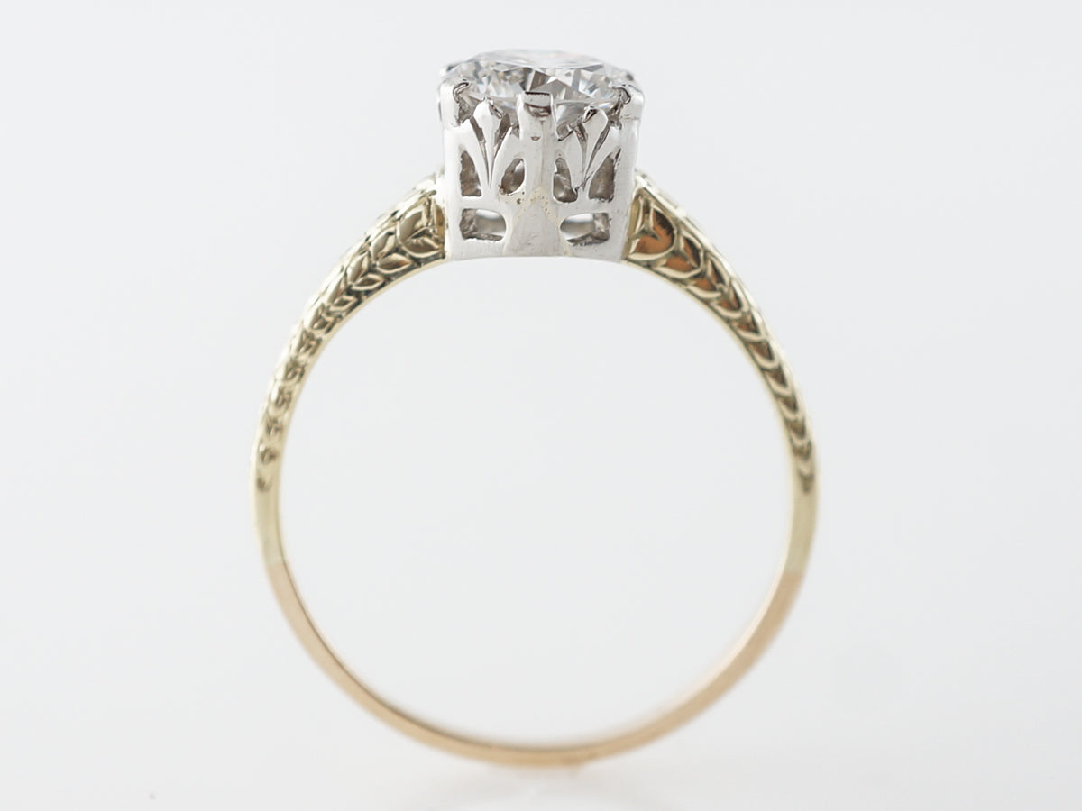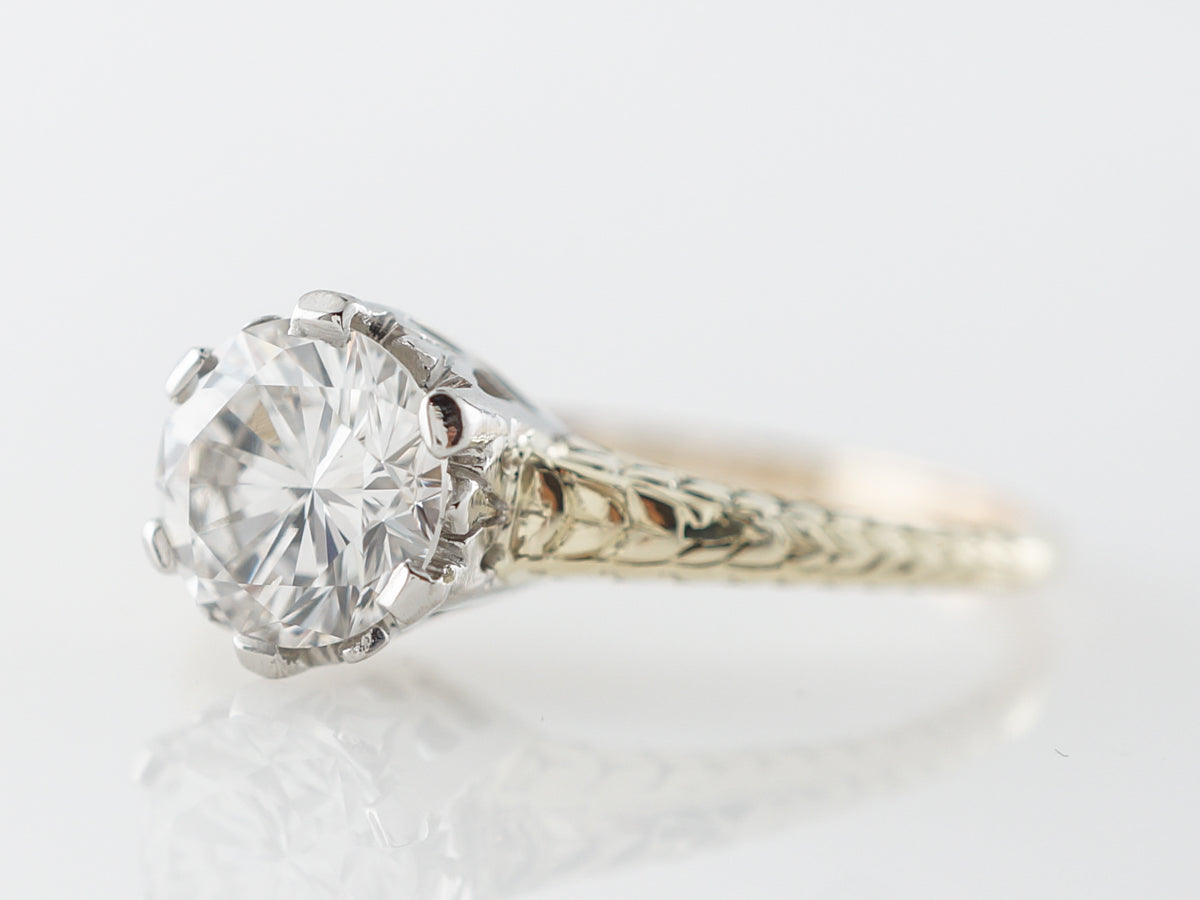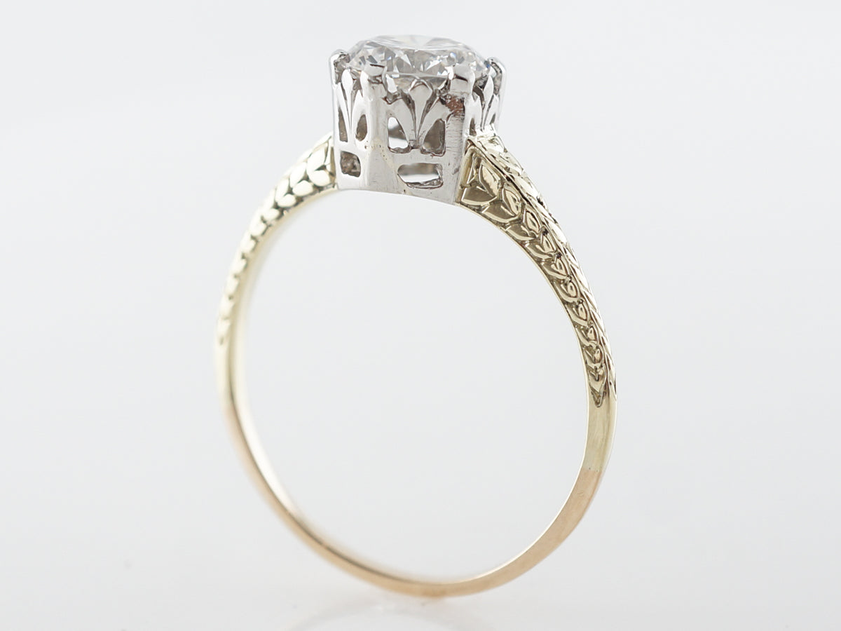 Two Tone Diamond Solitaire Engagement Ring in 14k. This diamond solitaire engagement ring features a .87 carat Round Brilliant cut diamond in a 14 karat white gold basket on a shank of 14 karat yellow gold. The yellow gold shank of this beautiful ring widens gently toward the head with its contrasting white gold. The shoulders feature a polished braided design, meeting the white gold basket with fine open work.