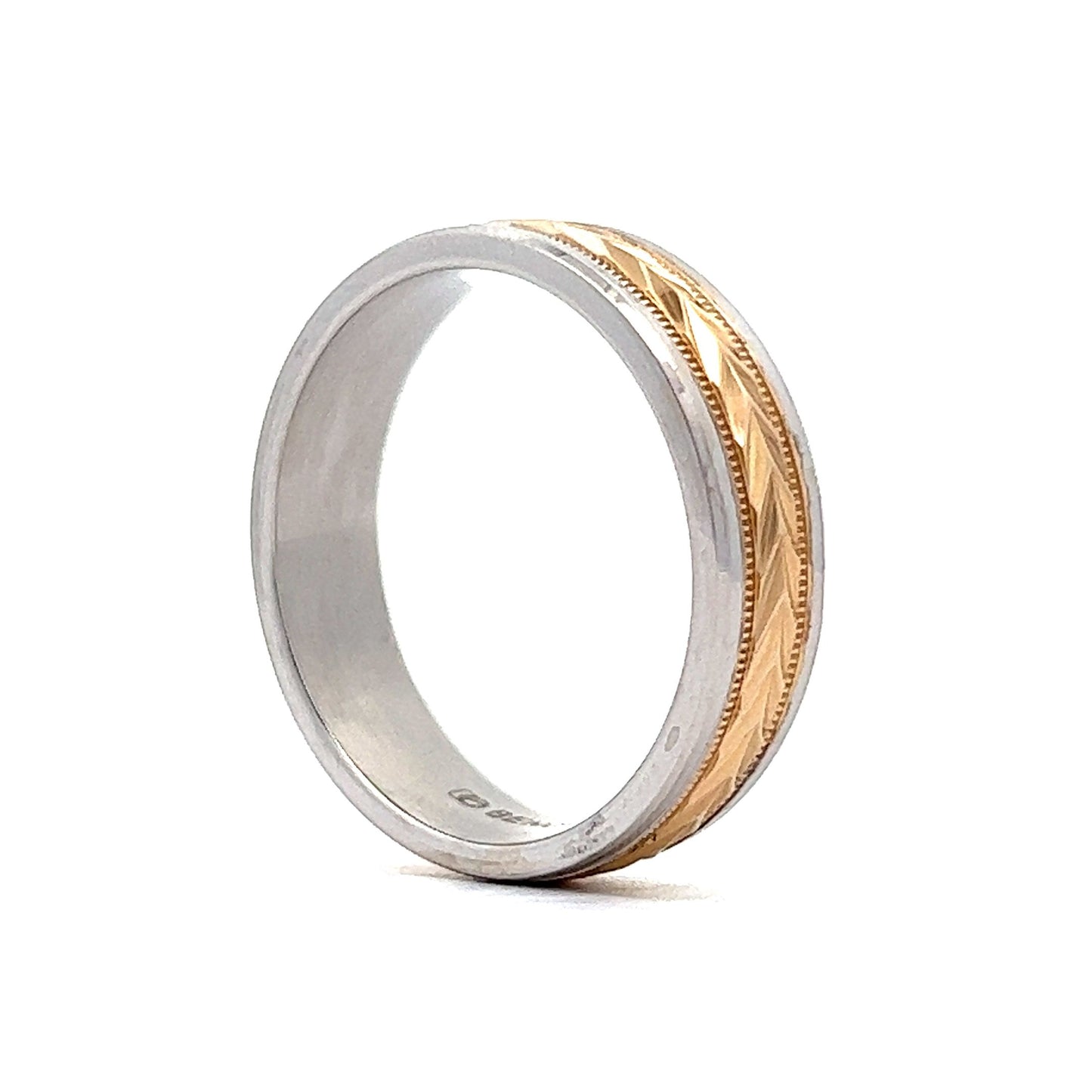 This modern men's two-tone wedding band features a sleek, beveled flat edge comfort fit. Crafted from 14 karat white and yellow gold, the band is polished to perfection and features a chevron pattern engraved along the entire length of the band. The polished gold accentuates the chevron pattern, creating a unique and eye-catching piece.