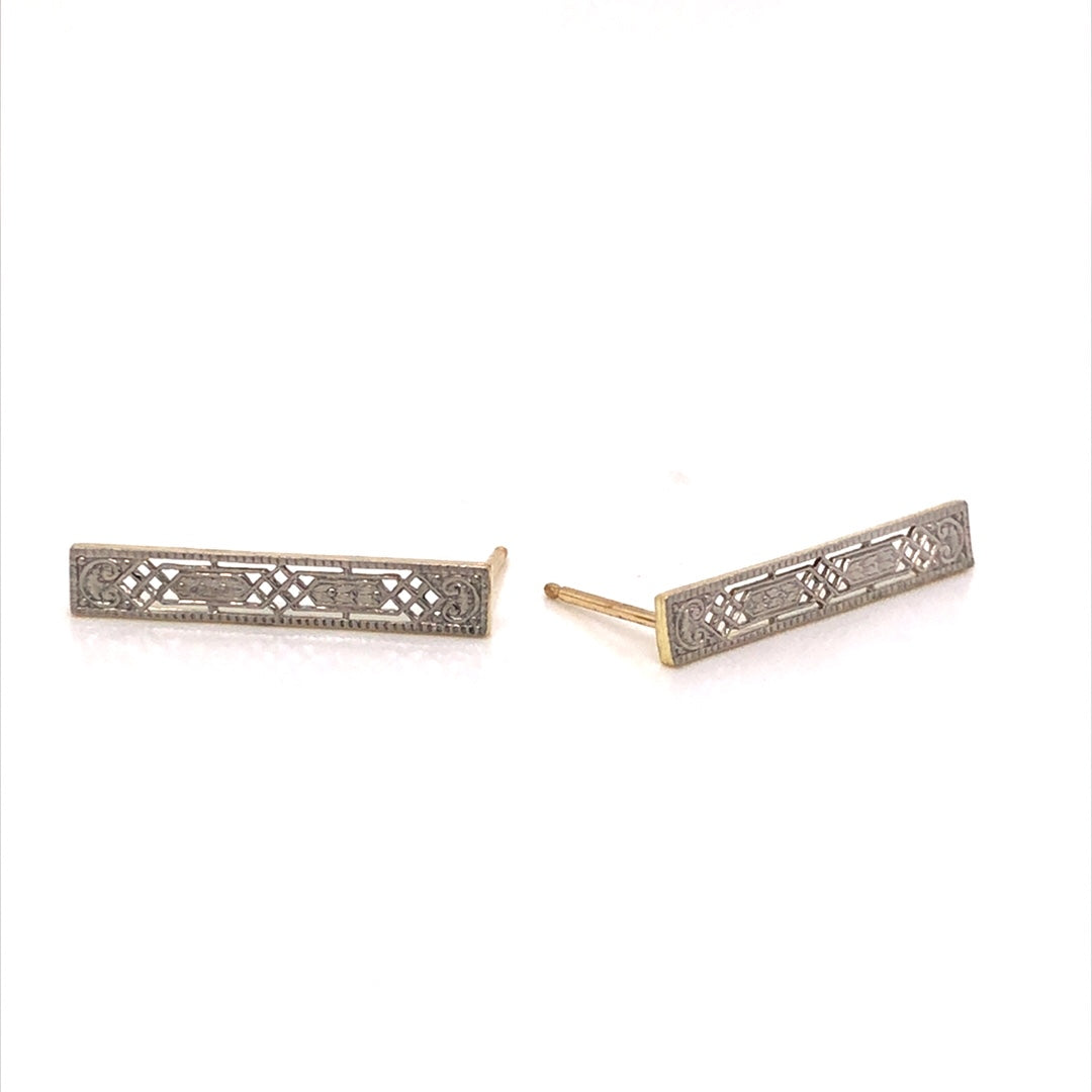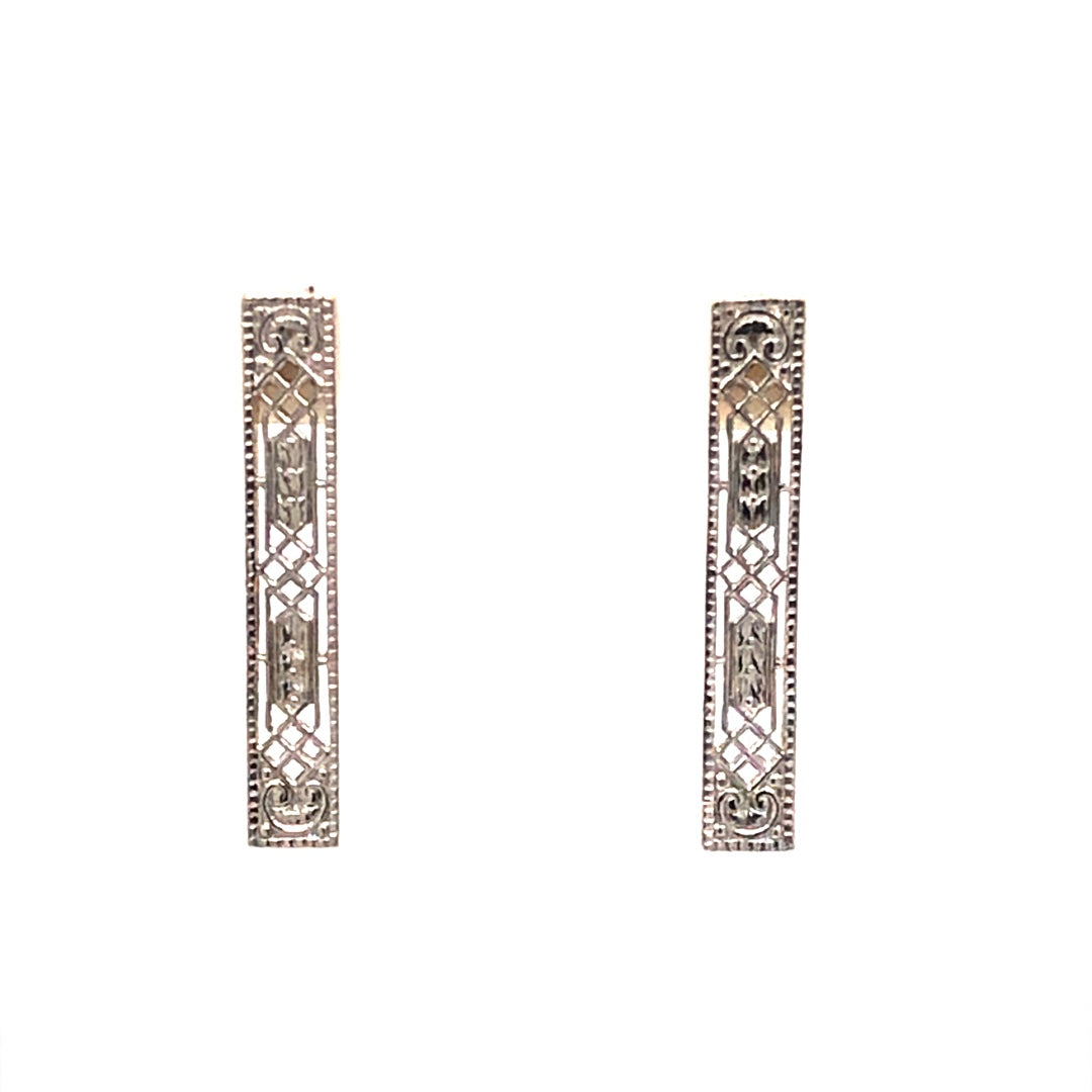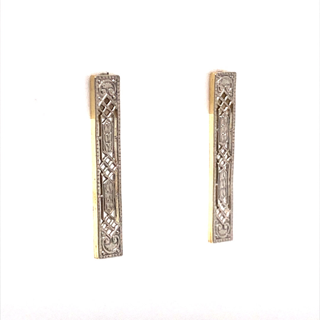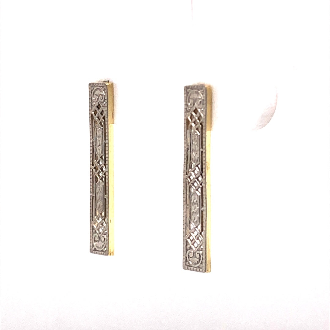 Hello, Art Deco! These shimmering two-toned filigree drop earrings feature an elegant design in 14 karat white and 14 karat yellow gold. Lightweight and gorgeous. The filigree metalwork showcases iconic Art Deco shapes into play. Set on 14K yellow gold backings, these architectural earrings will never go out of style. Measuring just ¾ inch long, these earrings are perfect for any special occasion.