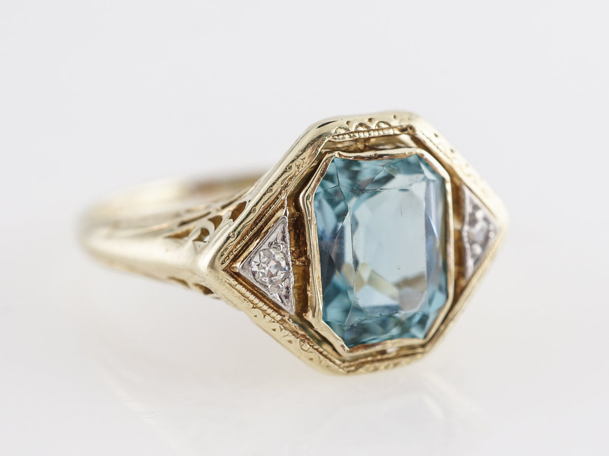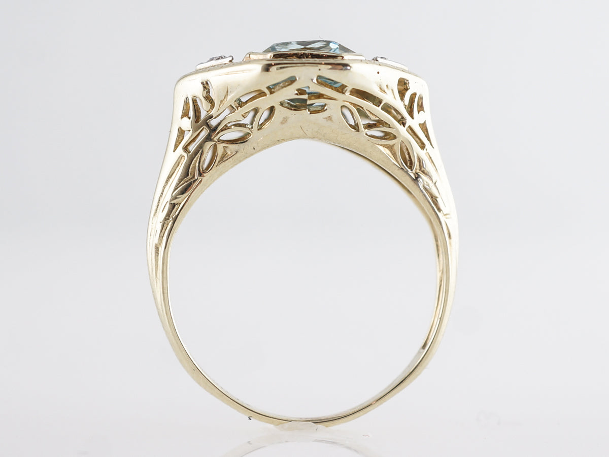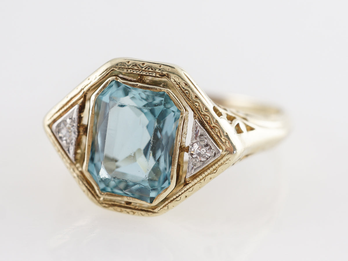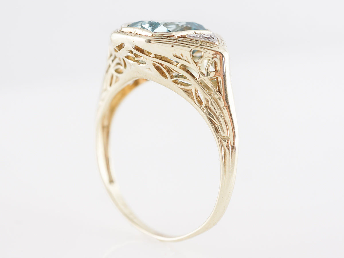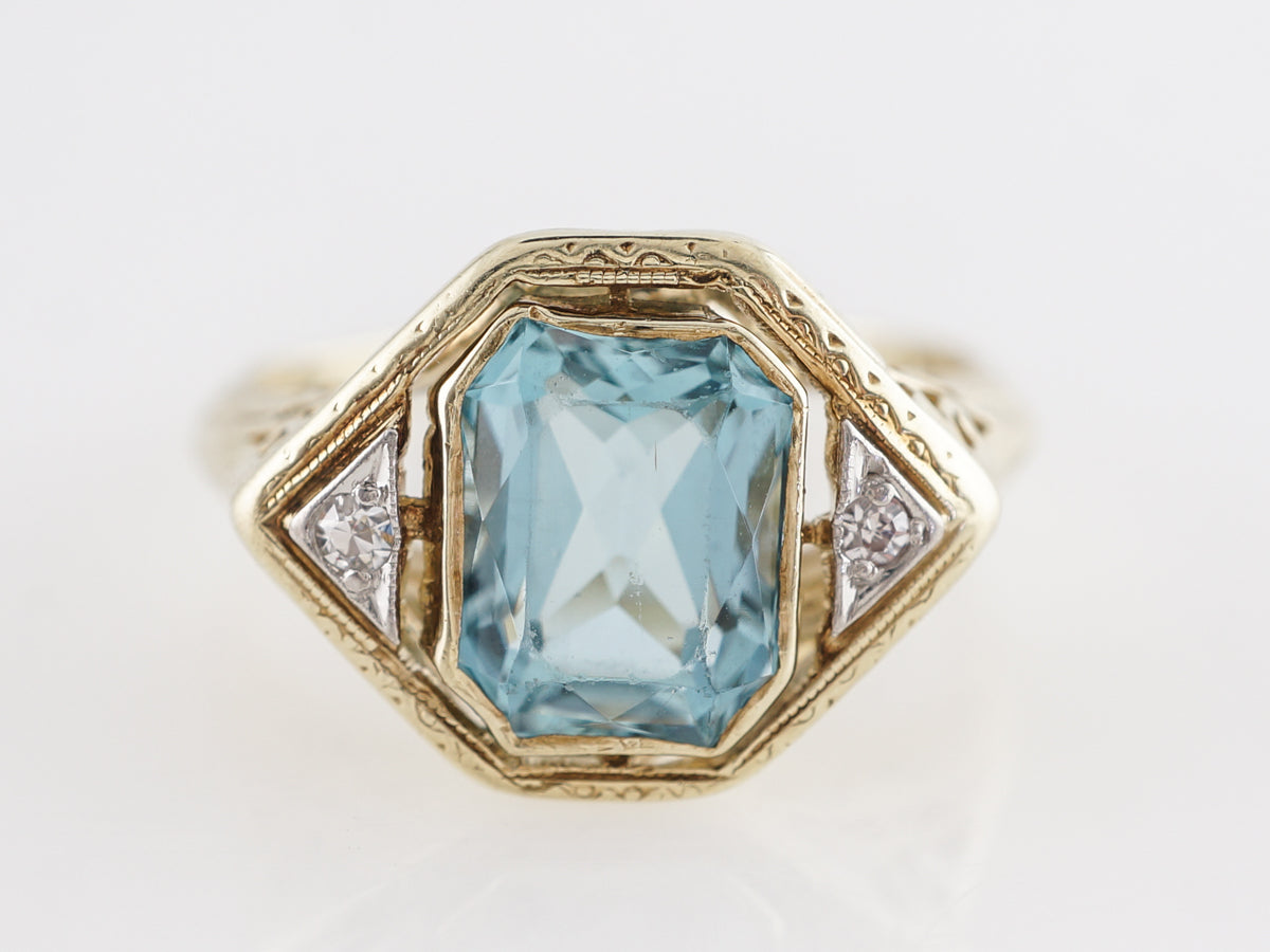 Two-Tone Floating Bezel Aquamarine Ring w/ Diamonds. The angular design of this fine right hand ring lends itself beautifully to the light blue emerald cut aquamarine set in 14 karat yellow and white gold. The aquamarine is bezel set and bordered by thin open spaces between the white gold triangular sections holding the diamonds. Lovely ornate engravings accent the yellow gold on the outer section of the mounting and all the way down the shoulders. The unique design, combined with the beautiful combination of colors, make this a very special right hand ring.