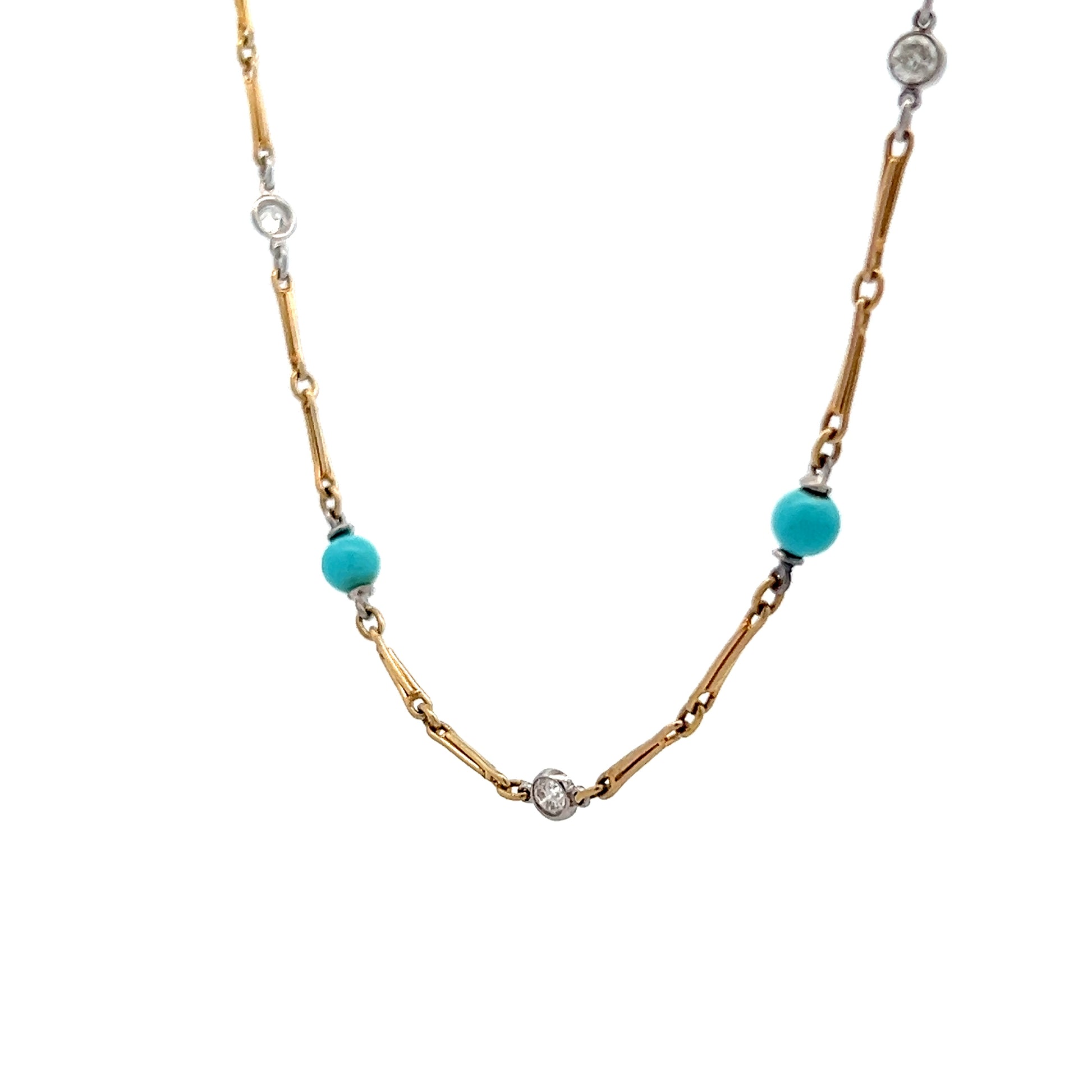 This two-tone necklace is made from 18k yellow gold with platinum settings and features elongated gold links alternating with turquoise beads. Ten round brilliant cut diamonds are bezel-set in platinum throughout the chain, each measuring 2.75mm for a total carat weight of .80 carats. The diamonds have SI2-I1 clarity, and H color grade, which appears white with minimal warmth.