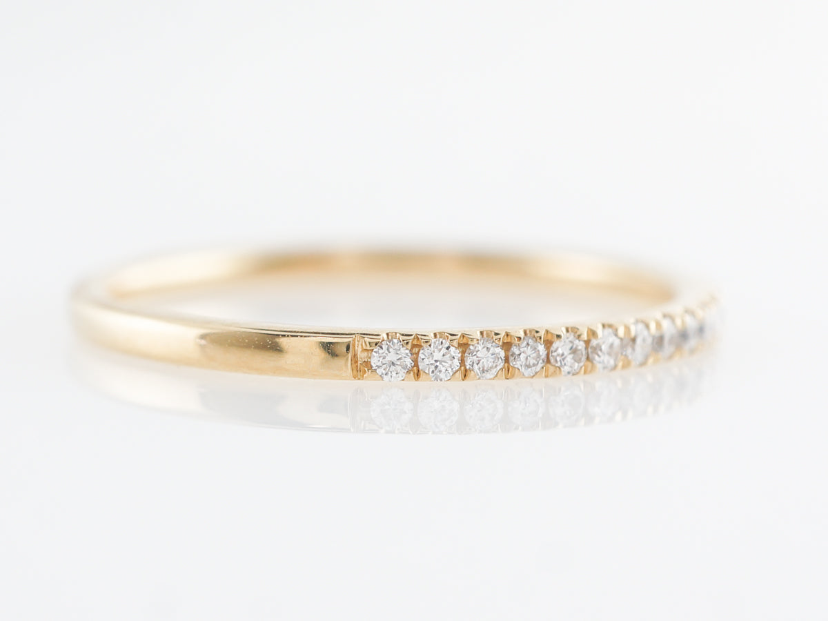 Ultra Thin Diamond Band in 18k Yellow Gold. This beautiful half-eternity wedding band features .13 carats of round brilliant cut diamonds set in 18 karat yellow gold. This would be a perfect addition to give a solitaire engagement ring a little extra sparkle, or could be worn on the right hand as a stacking ring.