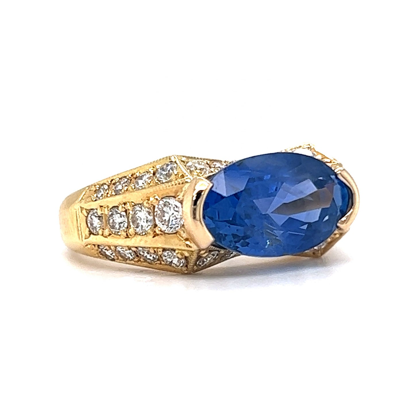 Dazzling in Ceylon Blue Sapphire! This geometric statement ring features a GIA certified unheated Ceylon sapphire and accent diamonds. A cocktail ring to remember. The impressive 4.72 carat oval cut sapphire scintillates when touched with light. A pave of thirty-two (32) near colorless accent diamonds decorate the 18 karat yellow gold band. Modern chic. This stylish ring features a Sri Lankan sapphire with a diamond gallery rail finished on a polished 18K yellow gold band. A fabulous gift for a special occasion. Sapphires symbolize wisdom and strength. A stylish piece to brighten up your jewelry collection!