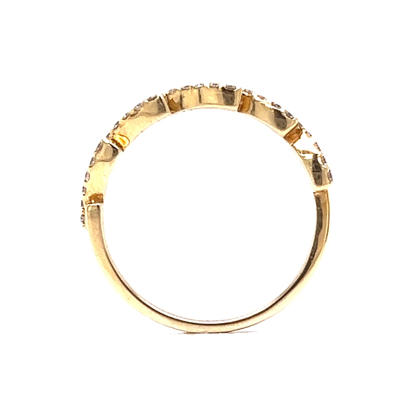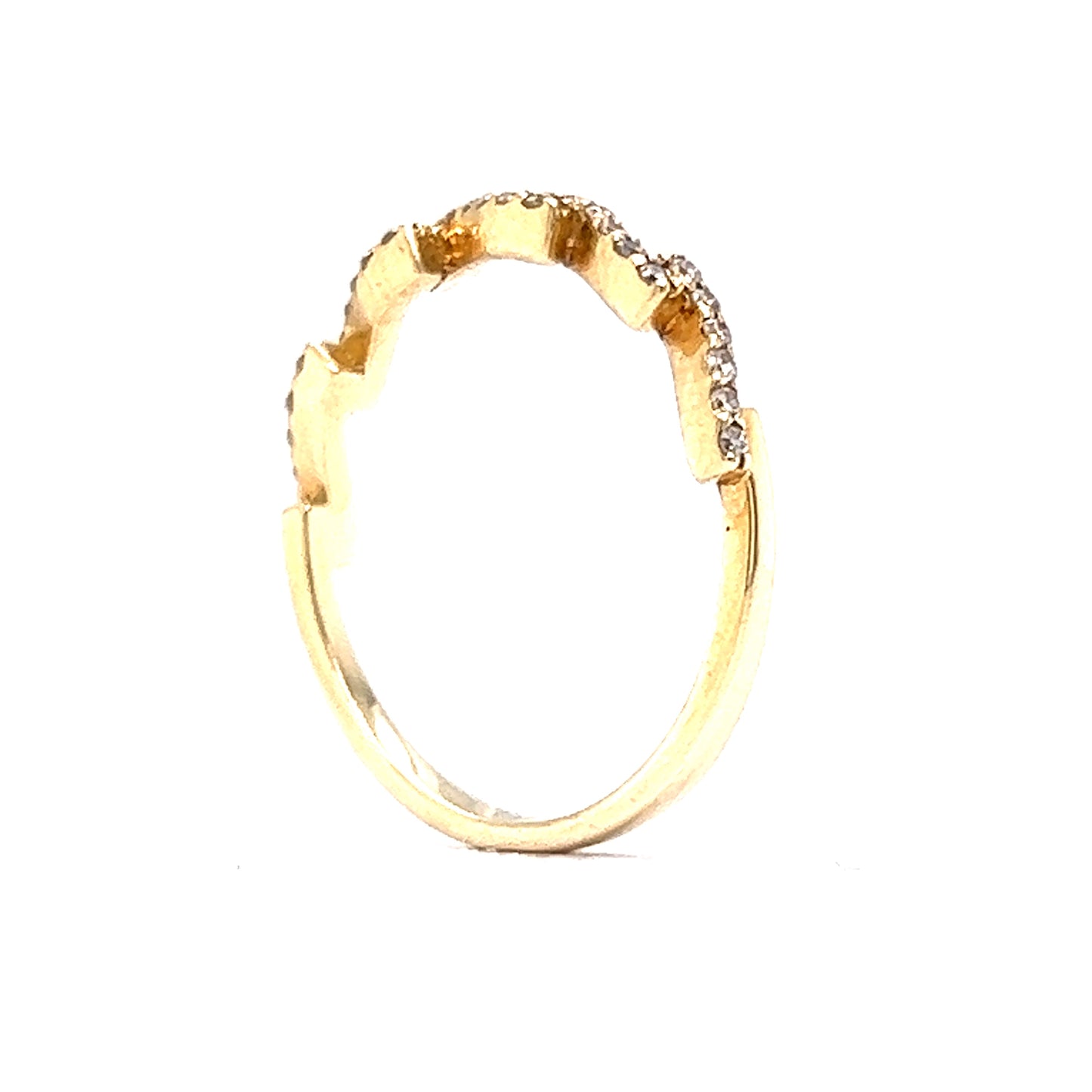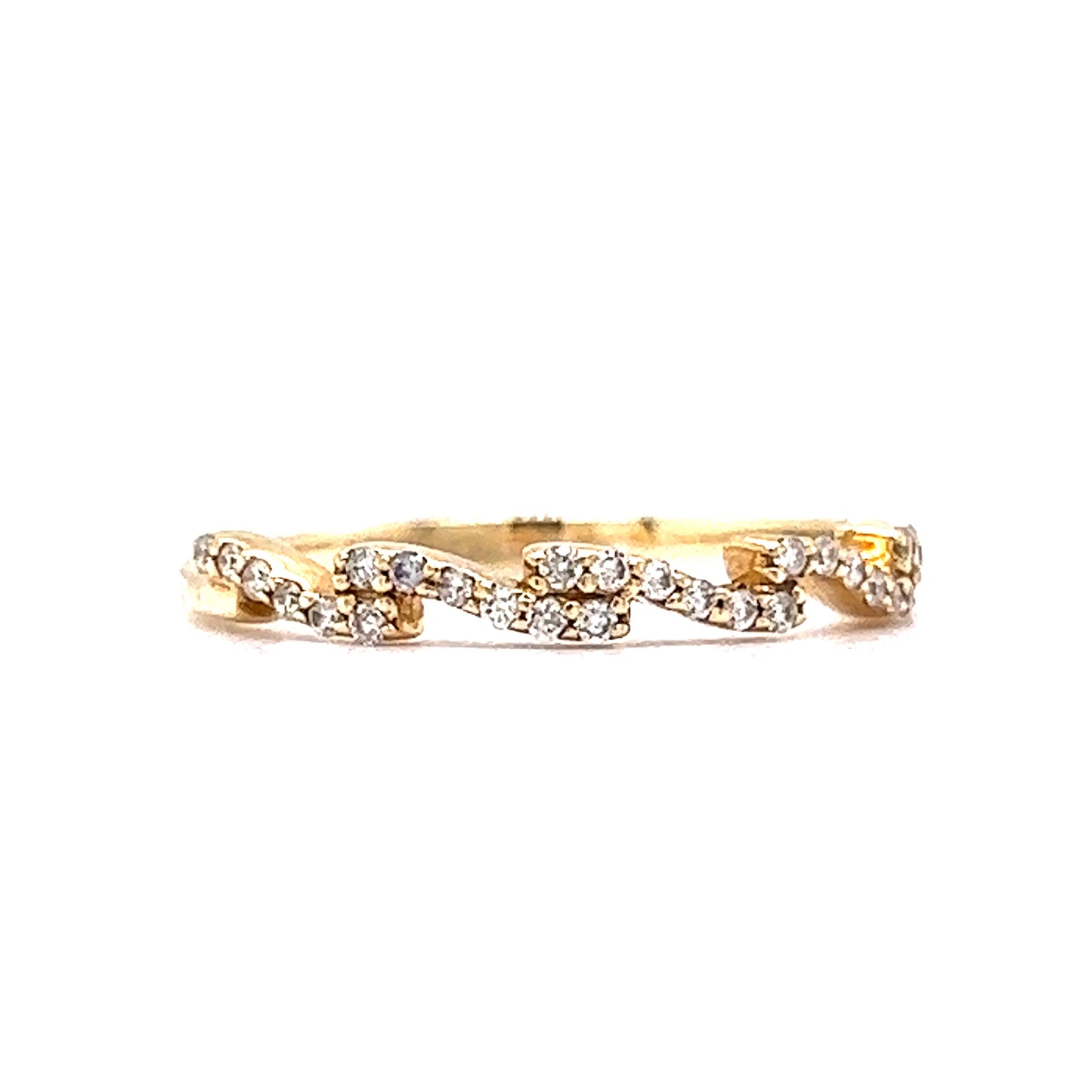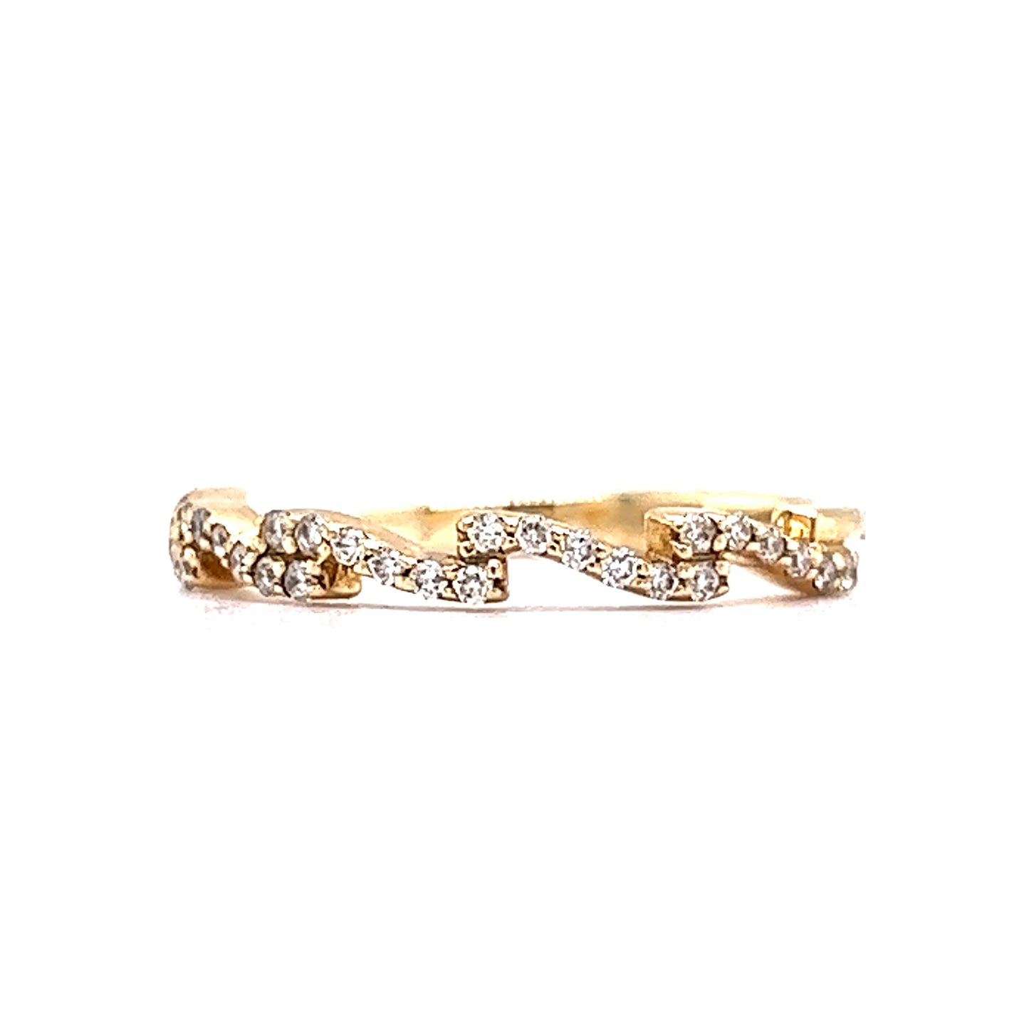 This modern wedding band features a total diamond weight of .16 carats on a wavy, 14k yellow gold band. The diamonds are brilliant and powerful in their charming, petite size. This wedding band measures 2.08mm above the finger and has a total weight of 1.40 grams. Chic sparkling. Great to stack with a solitaire engagement ring for extra diamond sparkle!