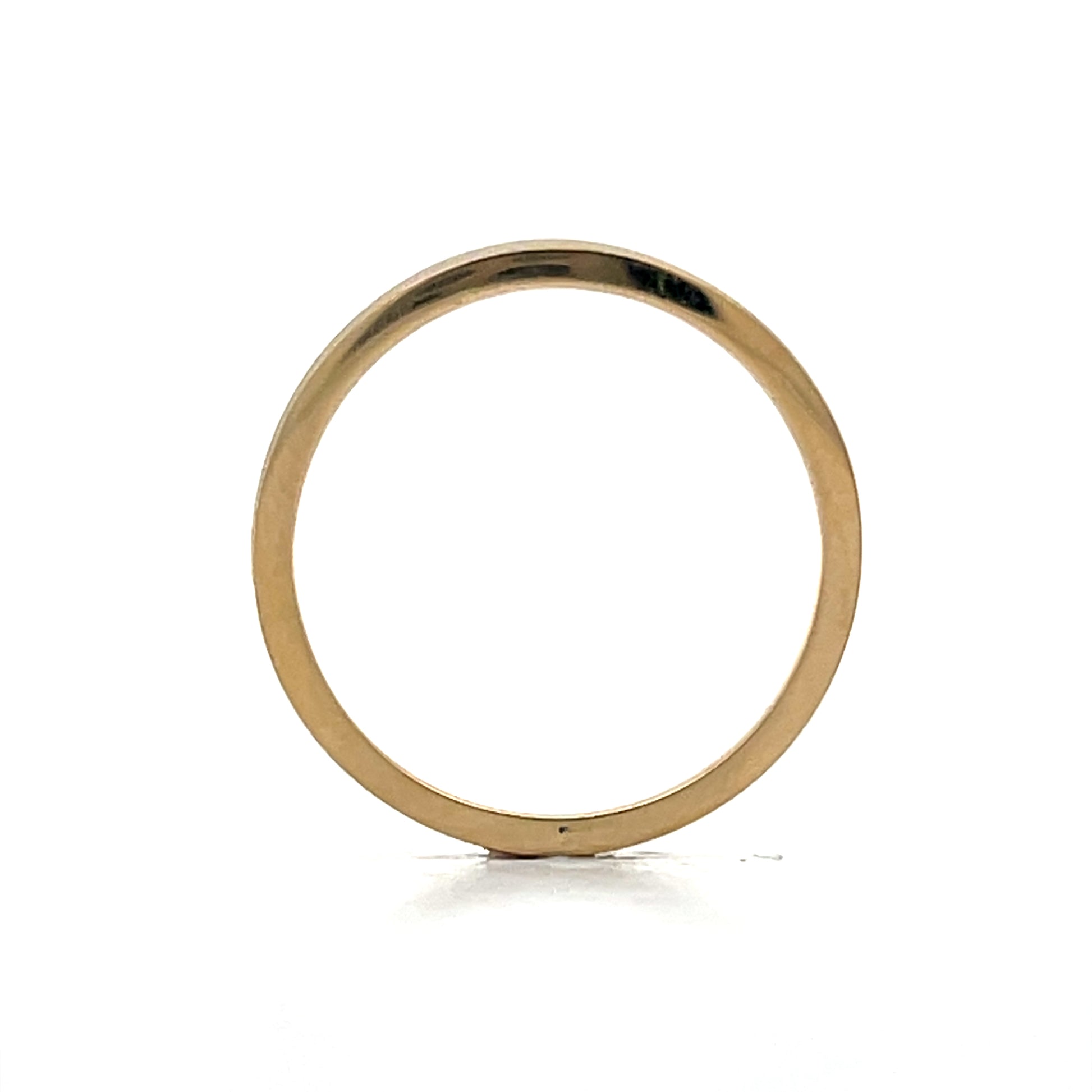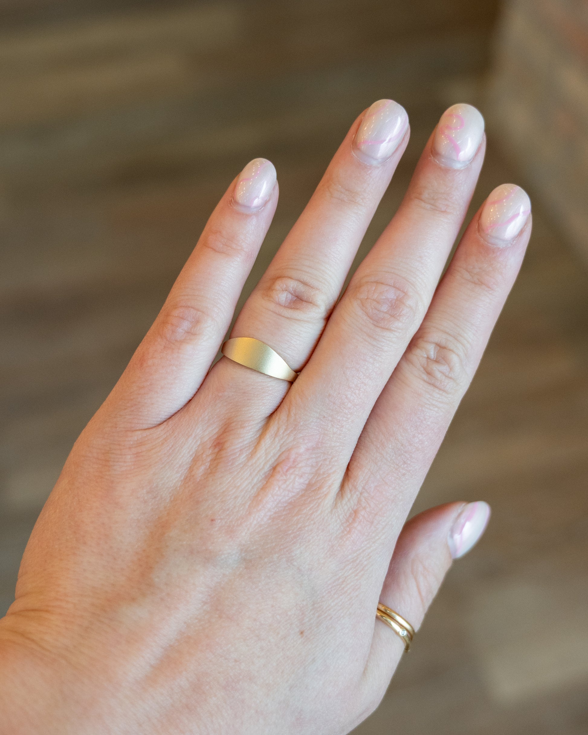 This 14 karat yellow gold signet ring features an asymmetrical design that breaks away from traditional styles. The ring has a brushed finish that gives the gold a subtle appearance rather than a shiny one. You can wear it alone or pair it with other rings to create different looks. The ring can be engraved with a message, initials, or date to make it your own. Both men and women can wear this ring, which combines the old-school signet style with a new asymmetrical shape.
