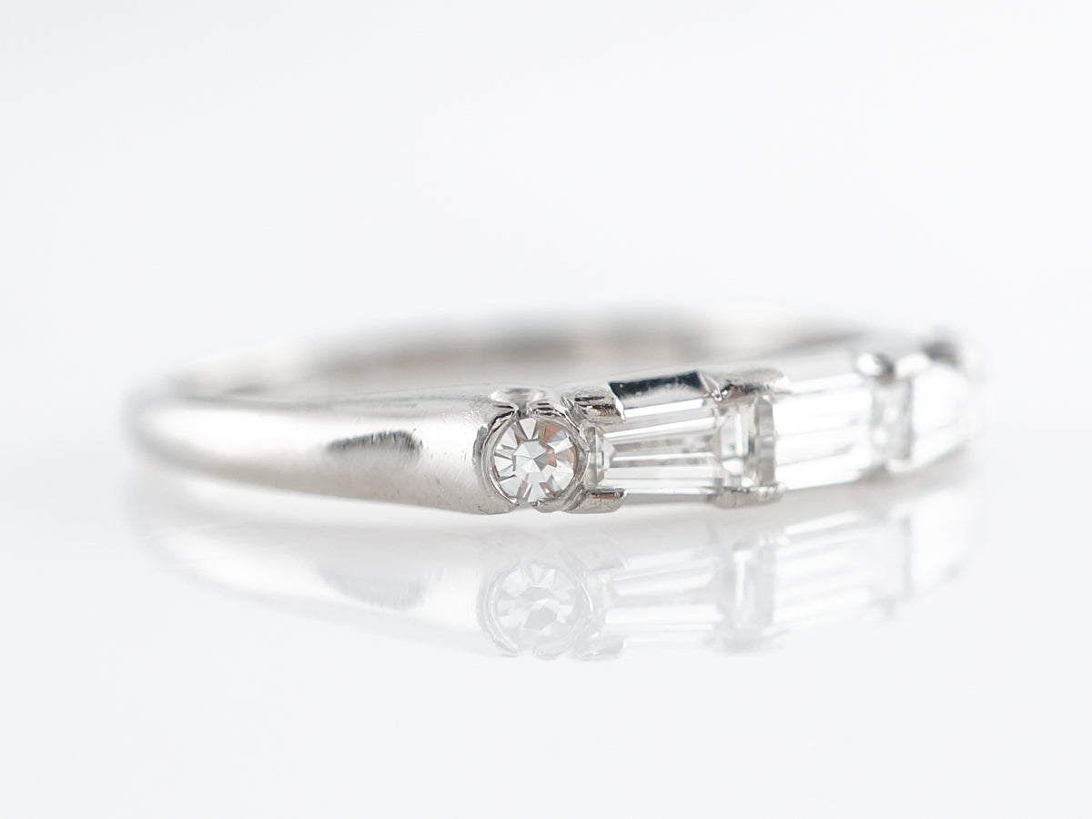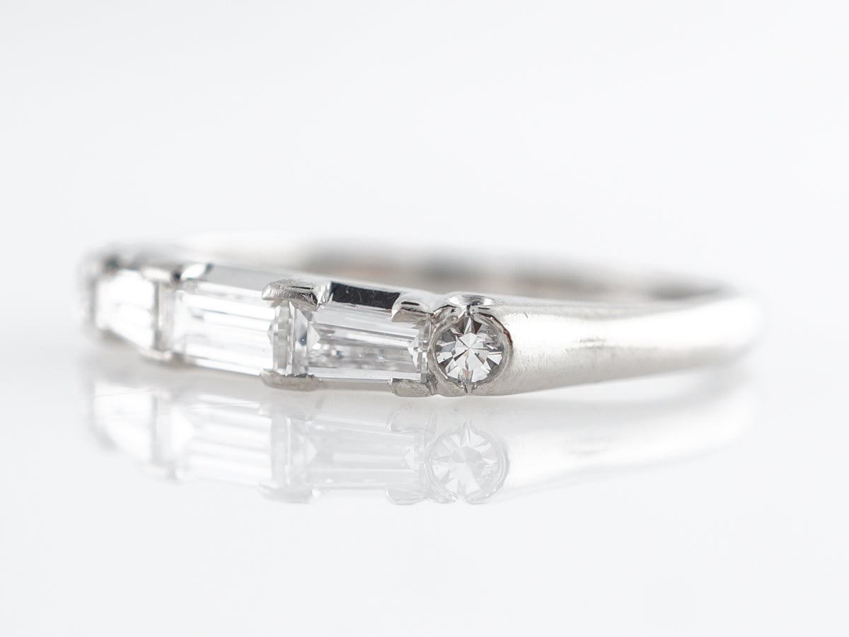 Various Baguette Cut Diamond Wedding Band in Platinum. This platinum ring features .37 carats of round and baguette cut diamonds across the top half of the band. With a unique look stemming from the baguettes being channel set in a line across the band and bordered by the round brilliant cuts, the ring will turn some heads. This ring would look great in a stack on the right hand.