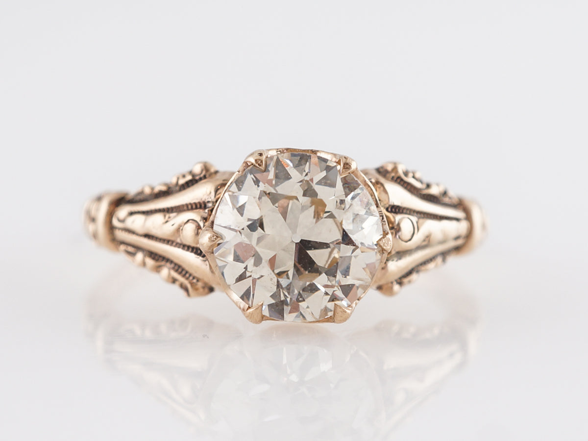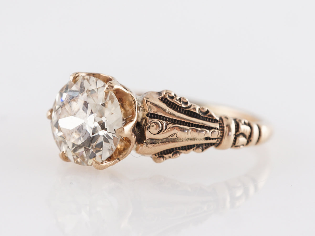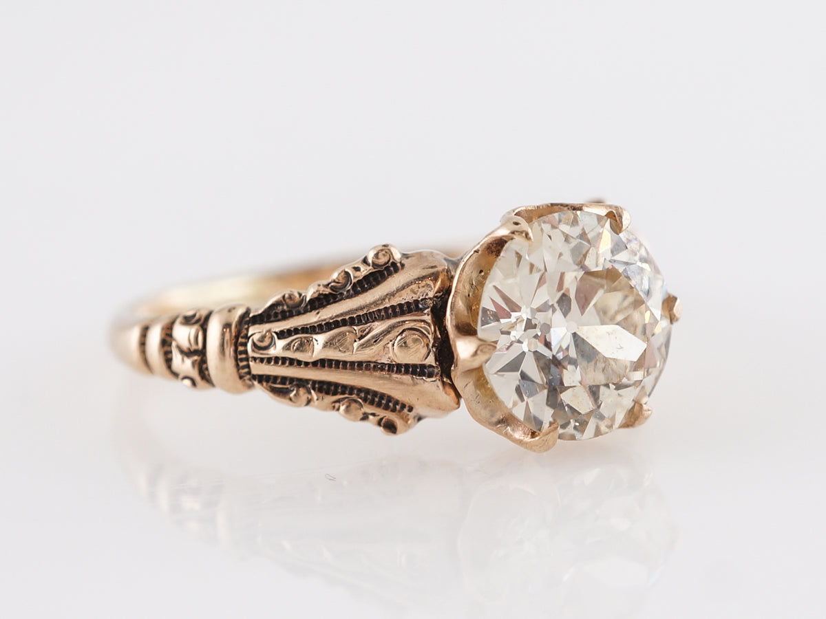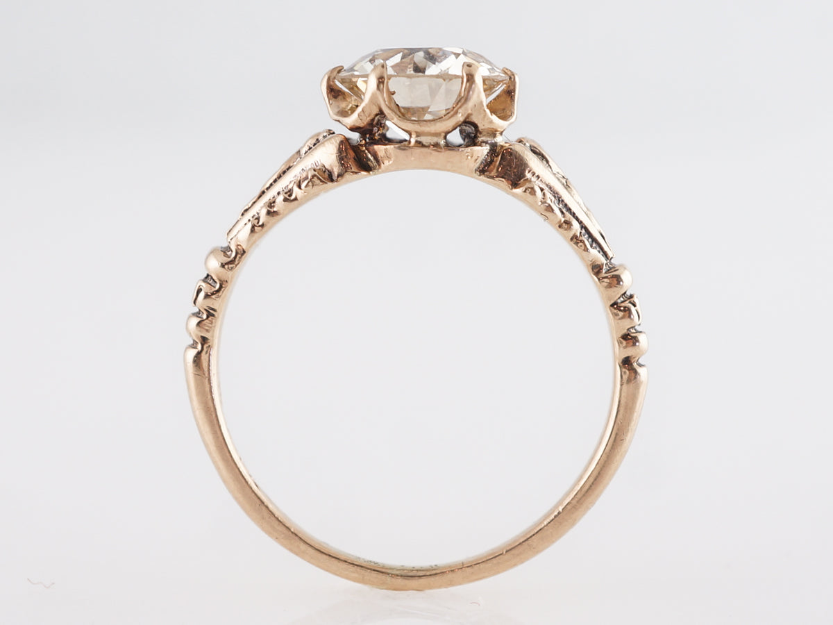 Victorian 1 Carat Engagement Ring in 14k Rose Gold. This beautiful Victorian engagement ring features a 1.21 carat Old European cut diamond set in 14 karat yellow gold. The fabulous center stone is set with six (6) prongs and rest above shoulders with ornate and deep engravings and grooves. The gold has a dark patina full of charm from the Victorian era.