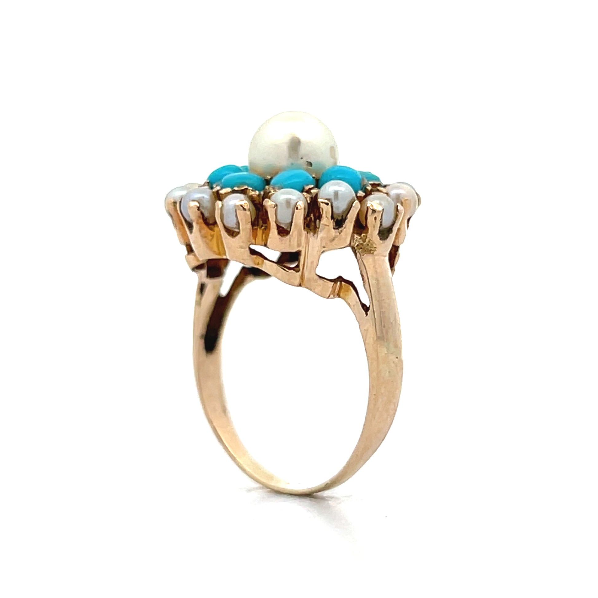 Victorian Antique Turquoise & Pearl Cocktail Ring in 14k