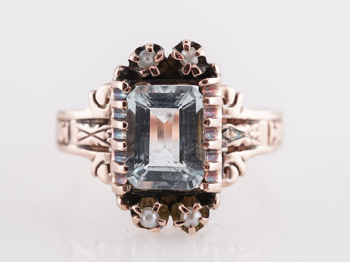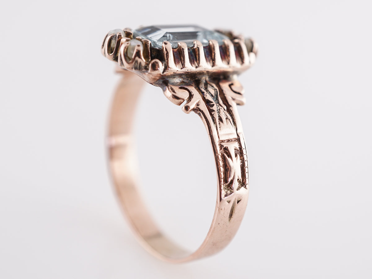 Victorian Aquamarine Cocktail Ring in 10k Rose Gold. This Victorian right hand ring features a 1.20 carat natural aquamarine on a 10K rose gold band. The center gemstone is a soft, icy, gray-blue aquamarine. From the silhouette, the shoulders of the band are detailed with engravings in 10K rose gold. Accented by four seed pearls in a multi-pronged setting, this rose gold ring is a work of art!