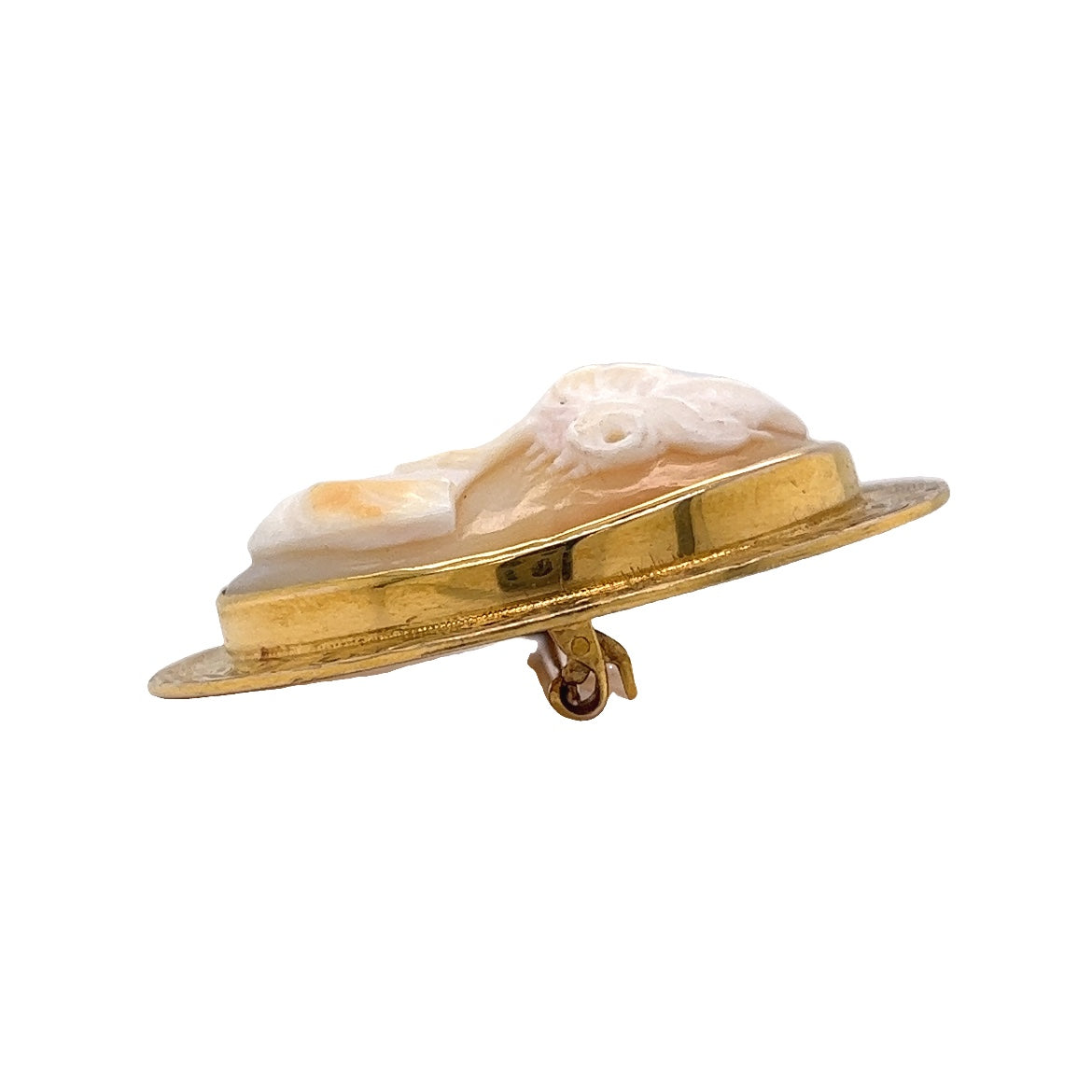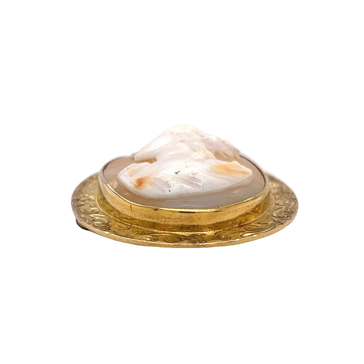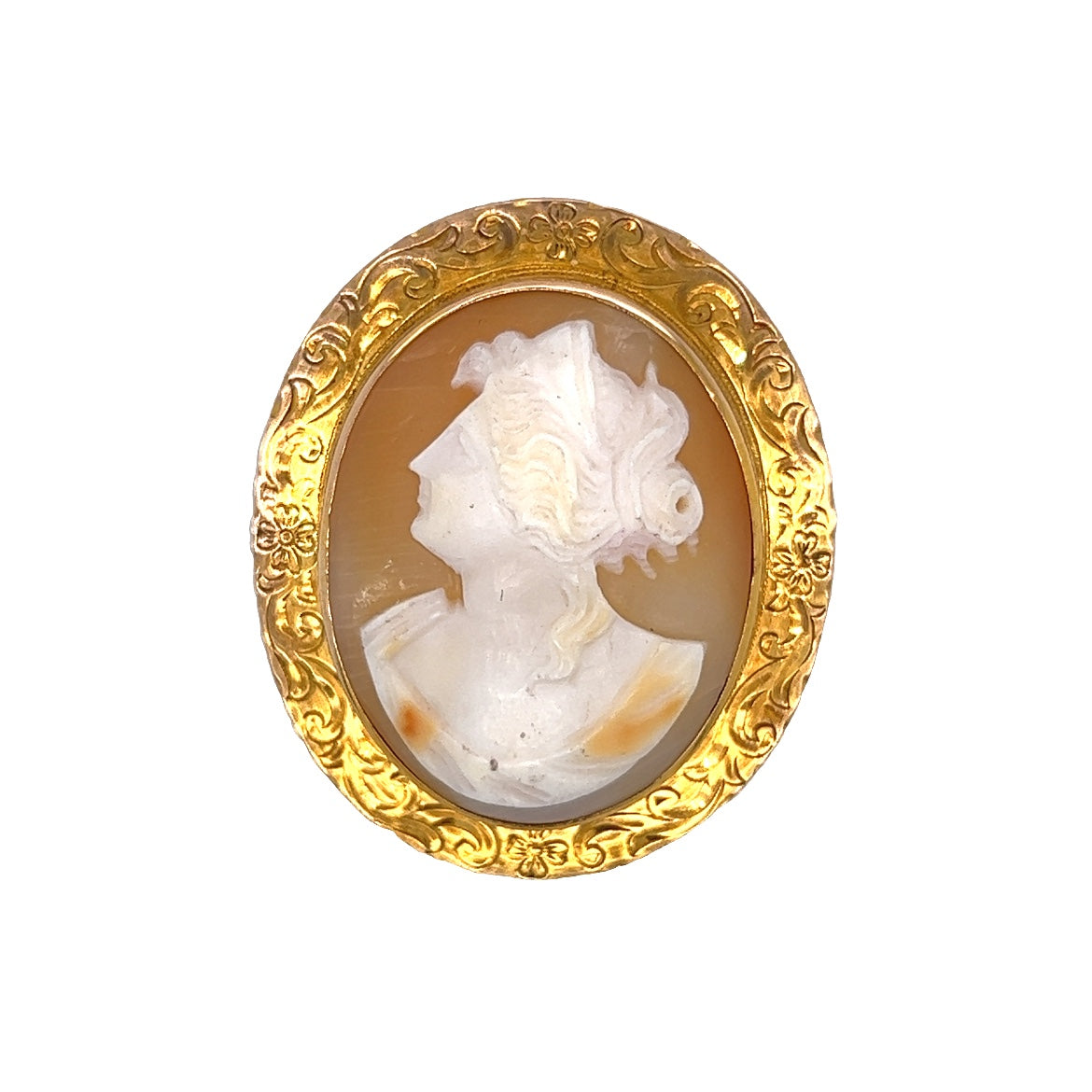 This Victorian brooch is 1.5 by 1.25 inches in size. The setting of the cameo profile is a seashell white engraving on a soft, pastel orange background. The Victorian frame is designed with flowers at each cardinal point. A charming composition that would make a heart-felt family heirloom!