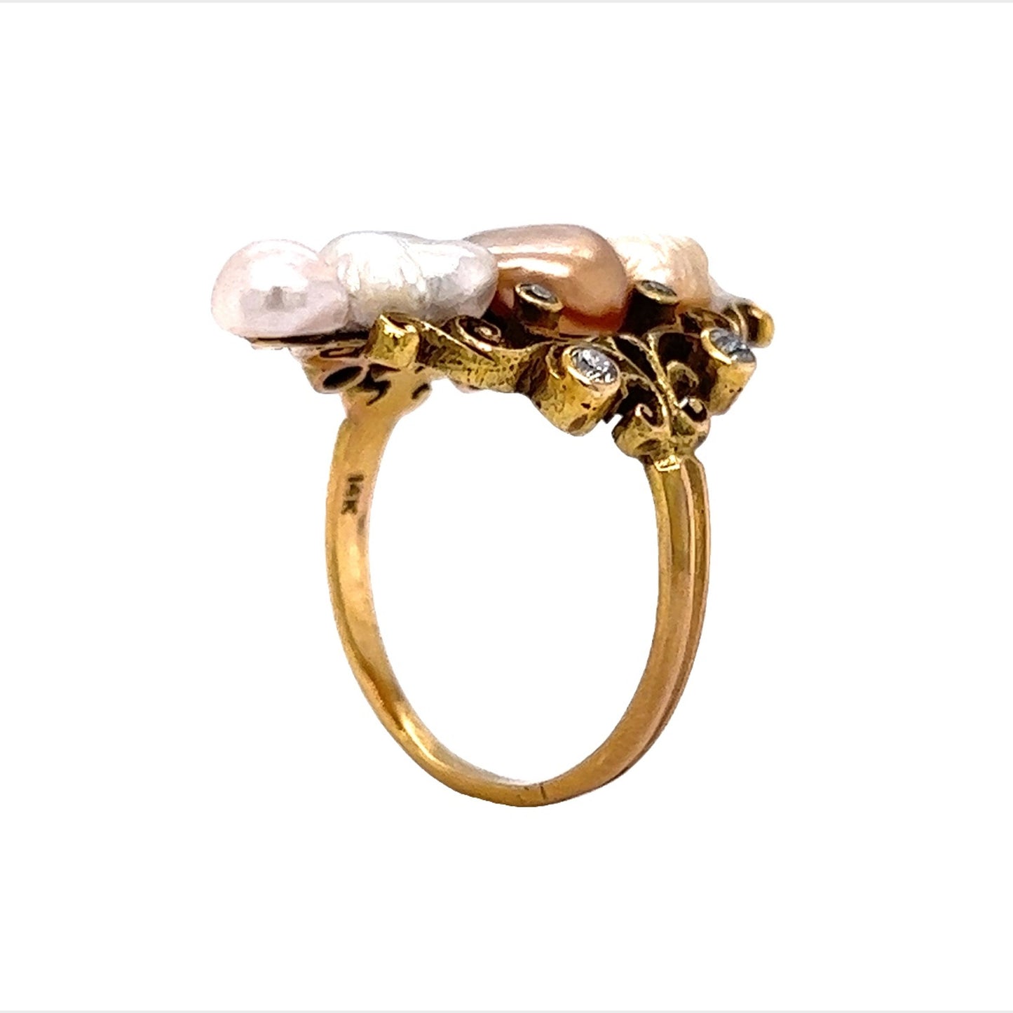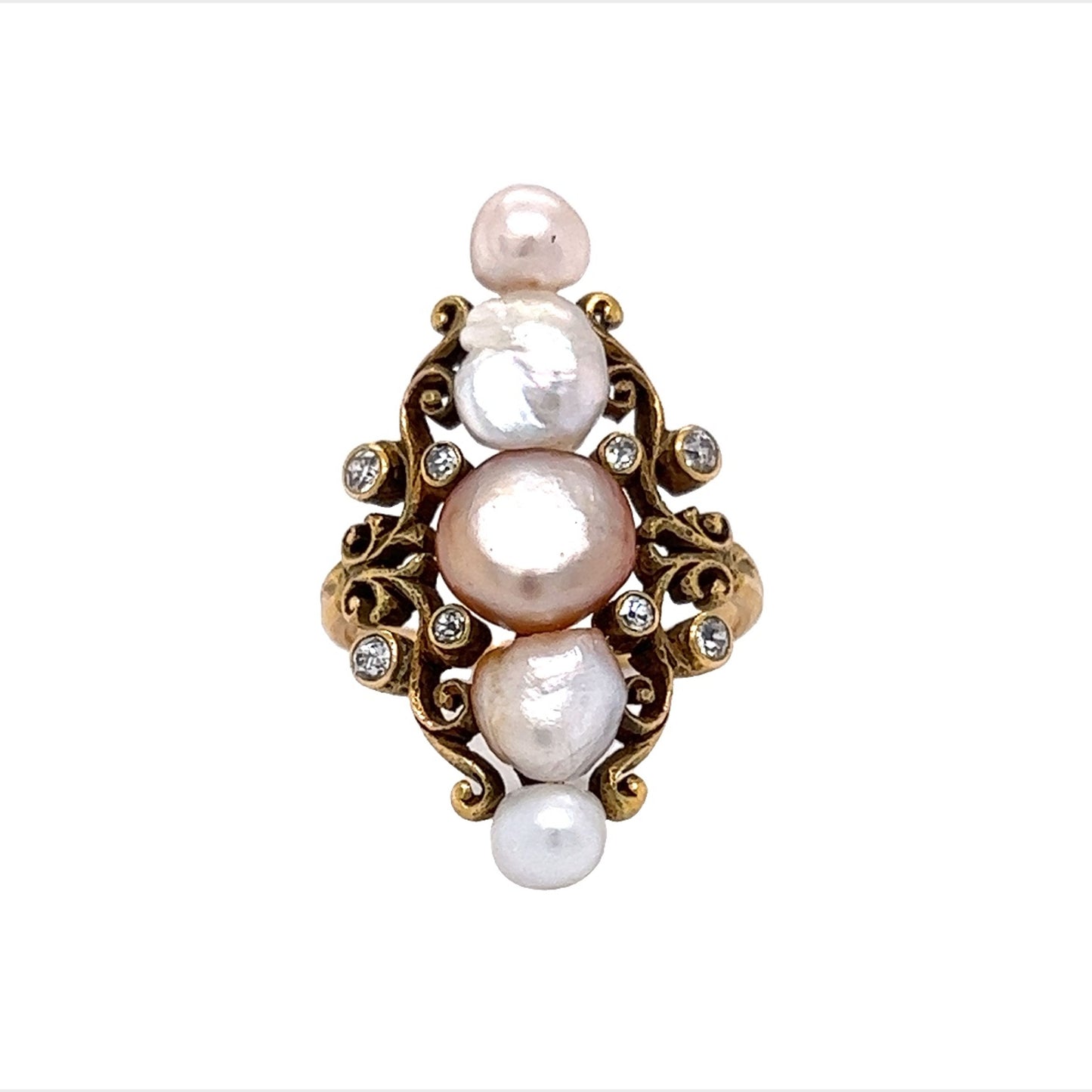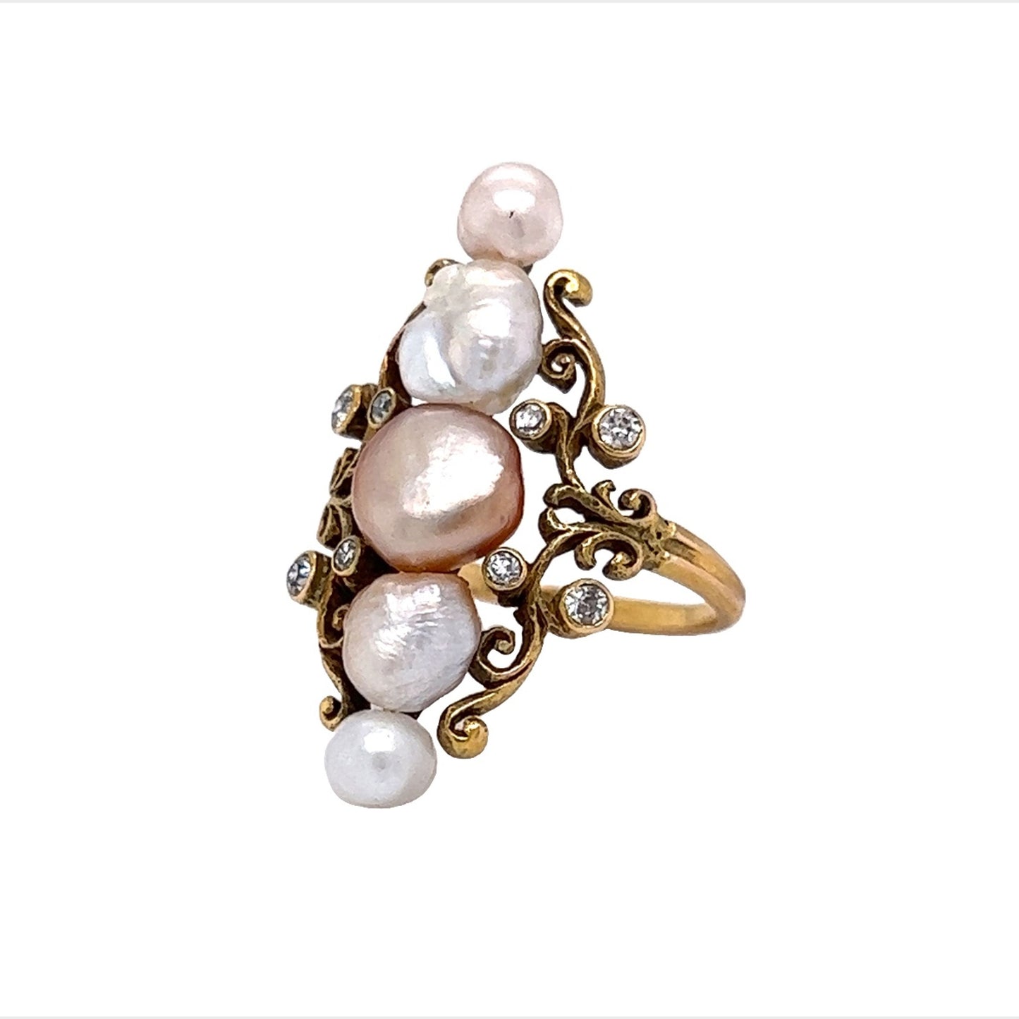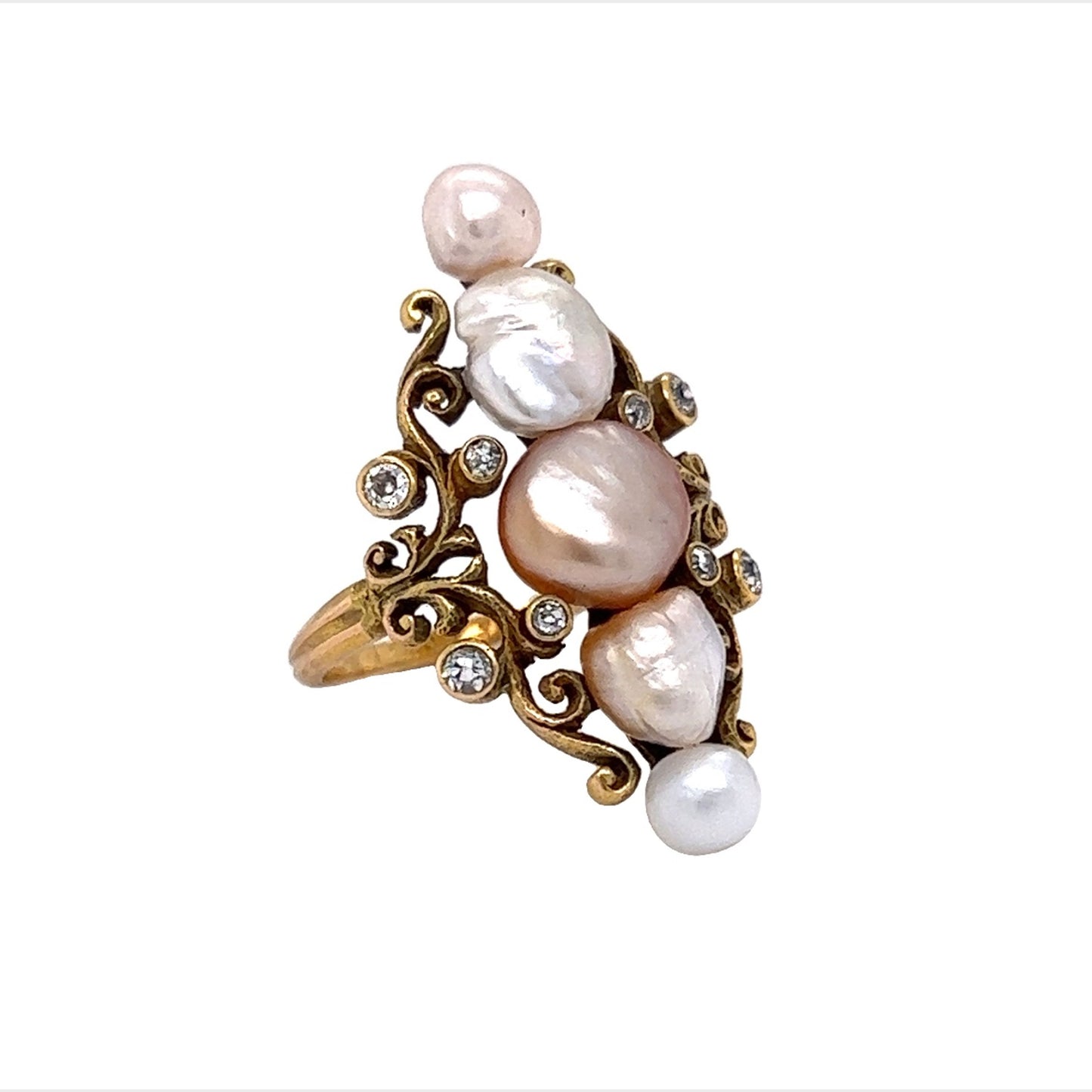 Victorian Diamond Ring w/ Keshi Pearls in Yellow Gold. This wonderful Victorian right hand ring features five (5) large Keshi pearls inside a swirling 14 karat yellow gold design adorned with diamonds. The metal work on this ring is a beautiful example of Victorian craftsmanship and does a fabulous job framing the pearls in an ordered way. This eye catching ring will be a favorite of yours for years!