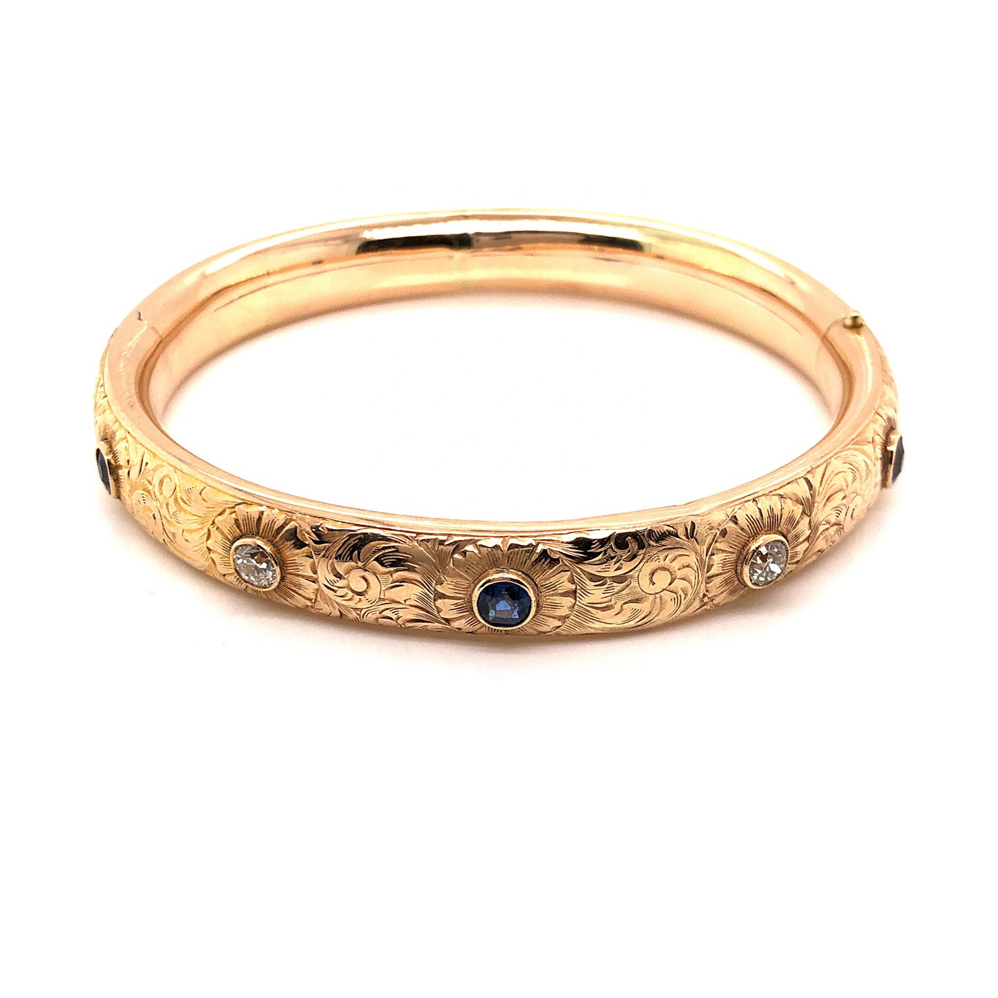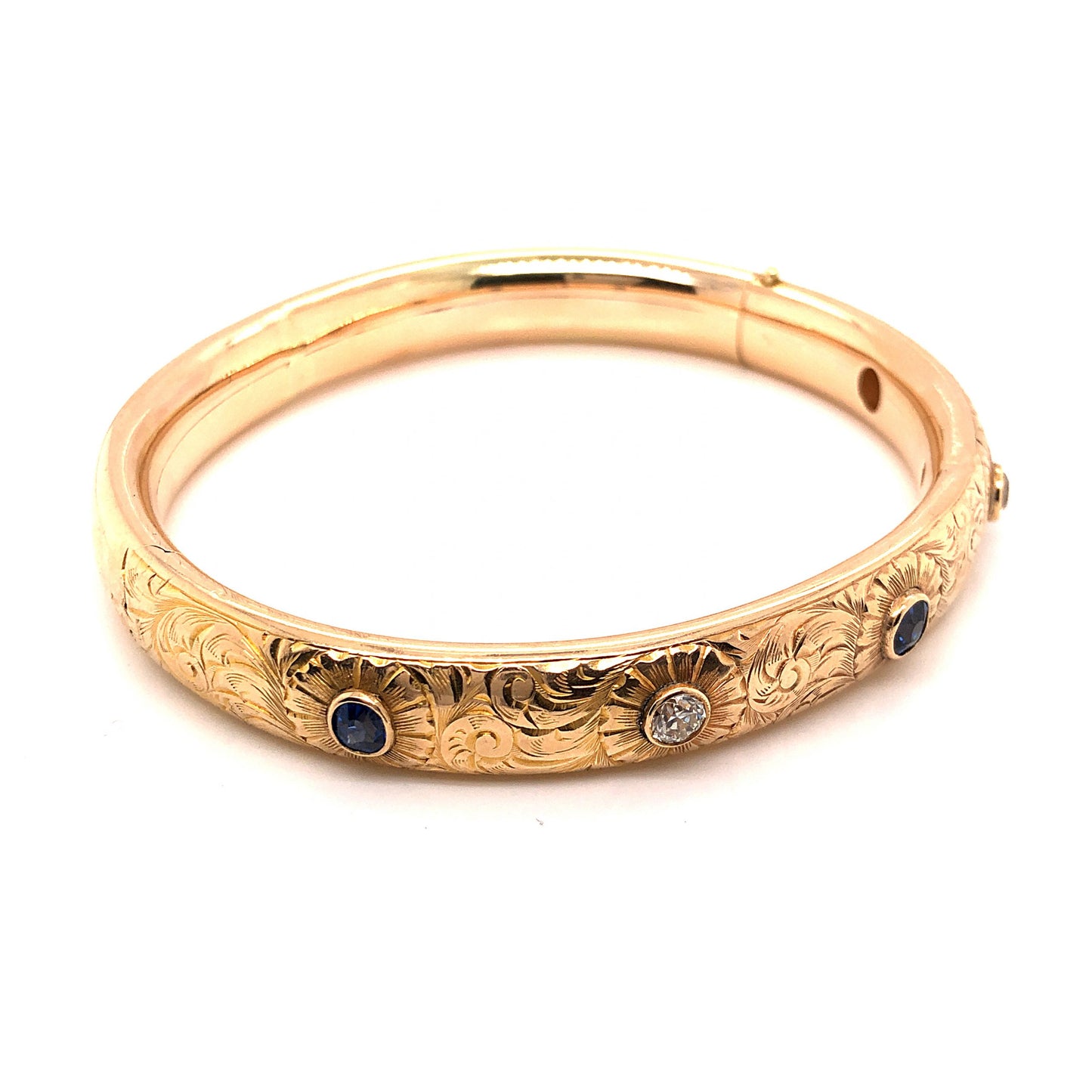 Victorian Diamond Sapphire Bangle Bracelet in 14k Yellow Gold. This Victorian bangle bracelet features .60 carats of diamonds and .99 carats of blue sapphires finished in warm 14 karat yellow gold. Two (2) .30 carat diamonds are bezel set in between three (3) .33 carat blue sapphires. The diamonds are near colorless, complimenting the royal blue hue of the sapphires. Each stone is bezel set in ornate, French-inspired flower engravings. This bangle bracelet will comfortably fit a size 7.5” wrist.