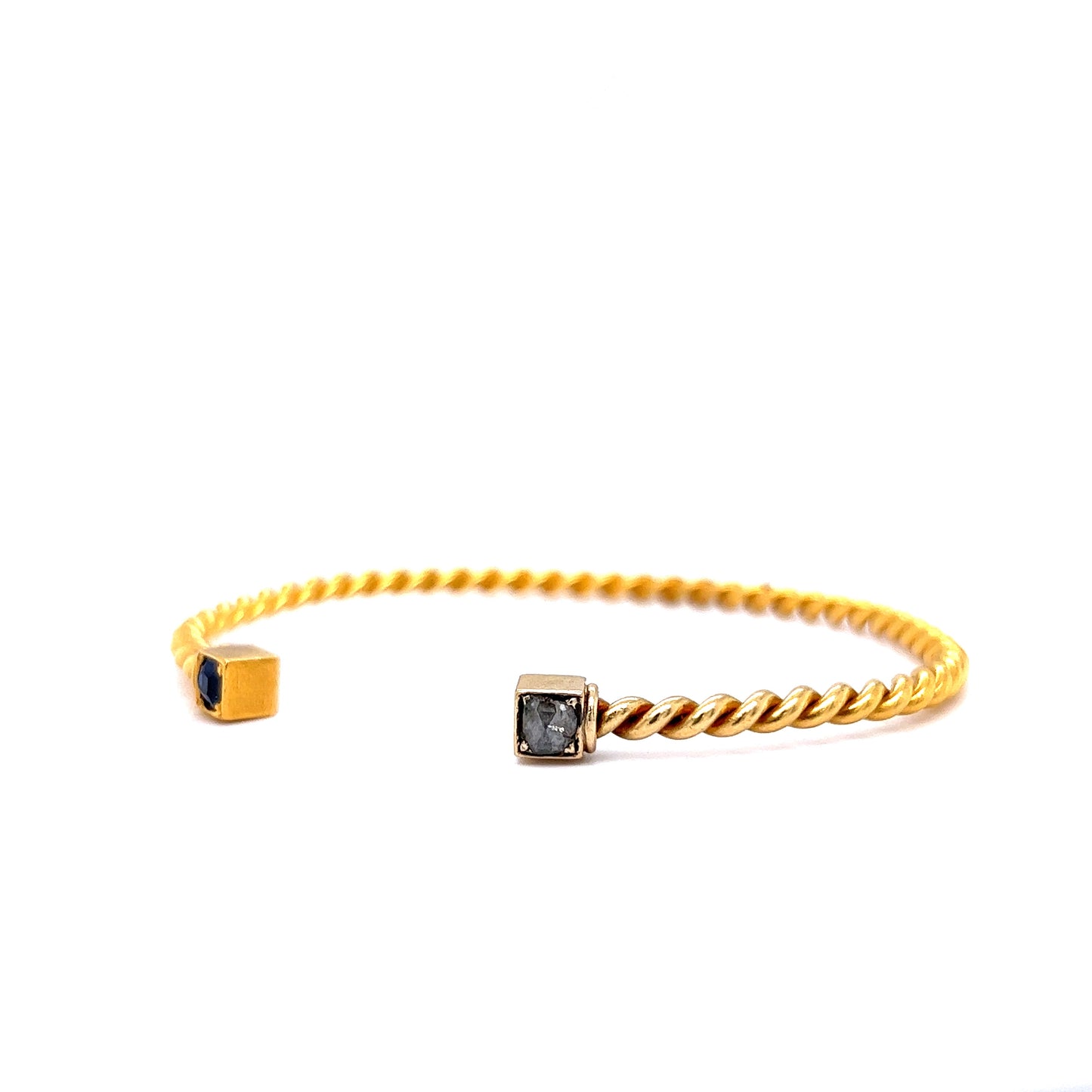 This stylish open cuff Victorian bangle features a .14 carat gray diamond and a .22 carat blue sapphire in 18 karat yellow gold. Modern for its time, the bangle has a textured, twisted rope design. The rose cut gray diamond and royal blue sapphire are mounted in box settings at the end of the cuff. Finished in radiant 18 karat yellow gold, this fabulous bangle is the perfect everyday accessory!