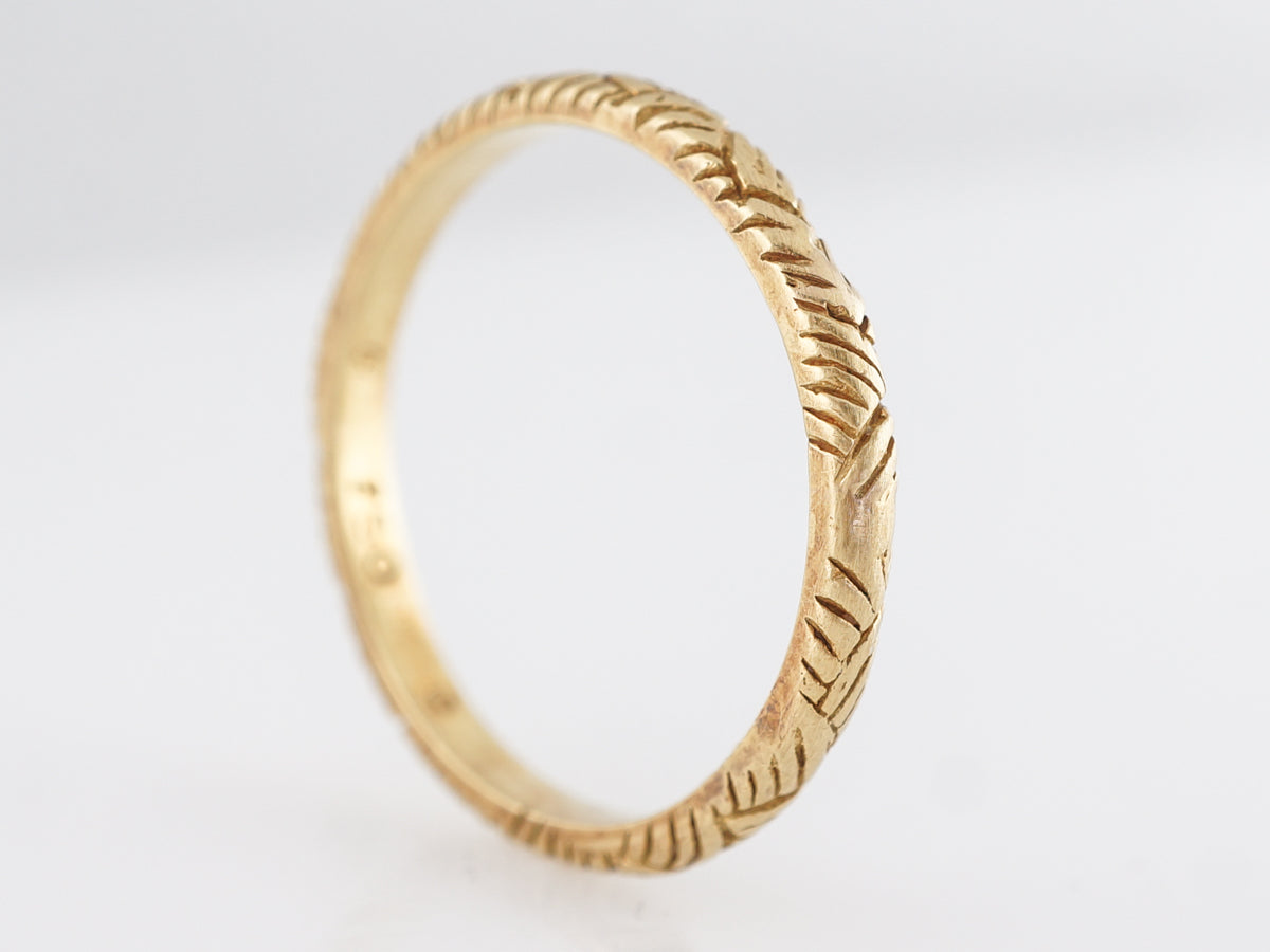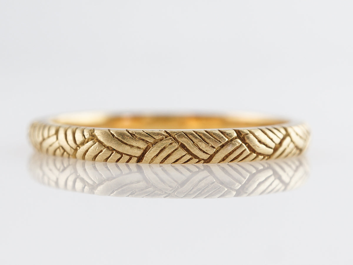 Victorian Engraved Wedding Band in 18k Yellow Gold. This original Victorian wedding band features engraving around the entirety of the band. Finished in 18k yellow gold with lovely overlapping sections that resemble a braided rope. This fine vintage wedding band is the perfect addition to your vintage engagement ring.