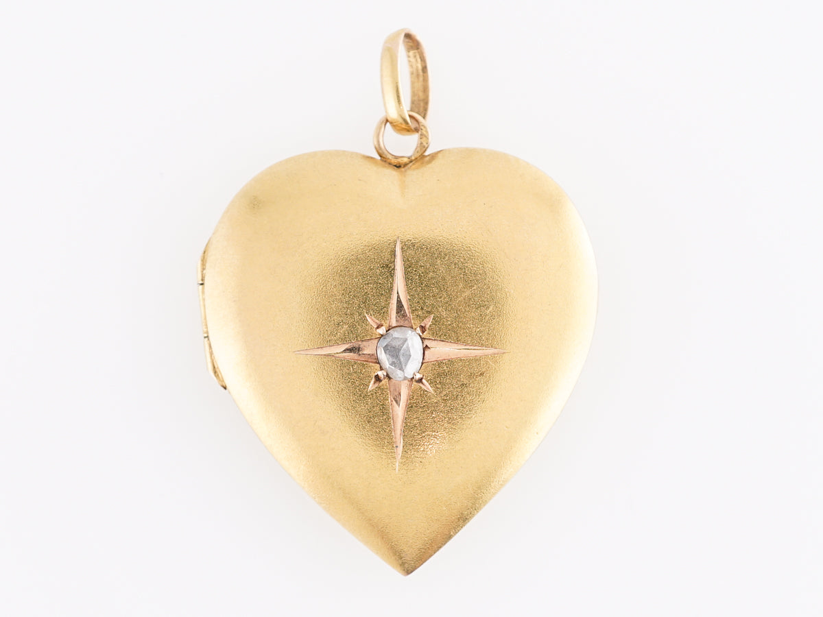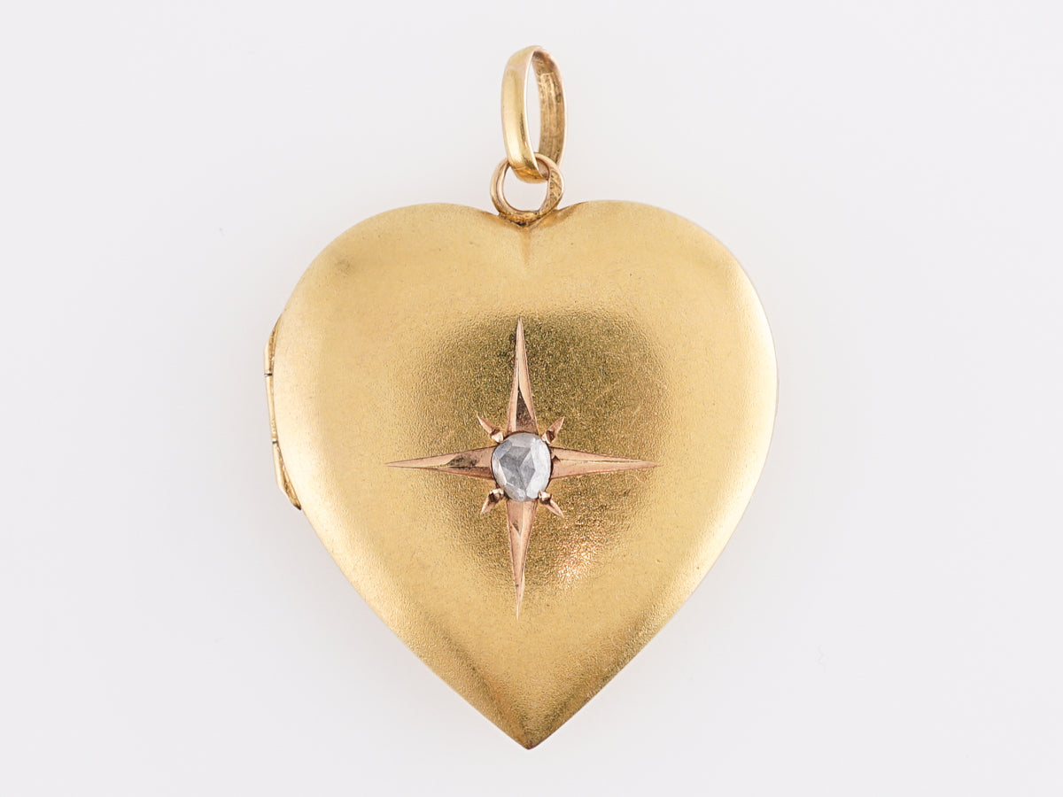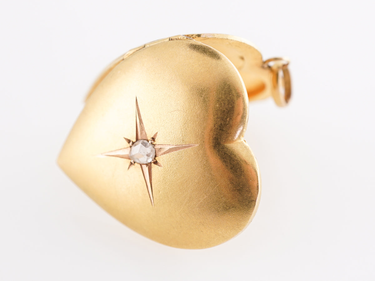 Victorian Heart Locket w/ Rose Cut Diamond in 14k Yellow Gold. This beautiful Victorian heart-shaped locket features a rose cut diamond weighing .15ct. The precision of the diamond cut resembles a rose, recreating a narrowing spiral of facets on this petite genuine natural diamond. The variation in shape creates a touch of extra brilliance at the center of this 14k yellow gold locket. A star embellishment punctuates the center of the locket and inside the pendant lays a hollow nest where a picture could be placed. The total weight of this vintage locket is 5.1g.
