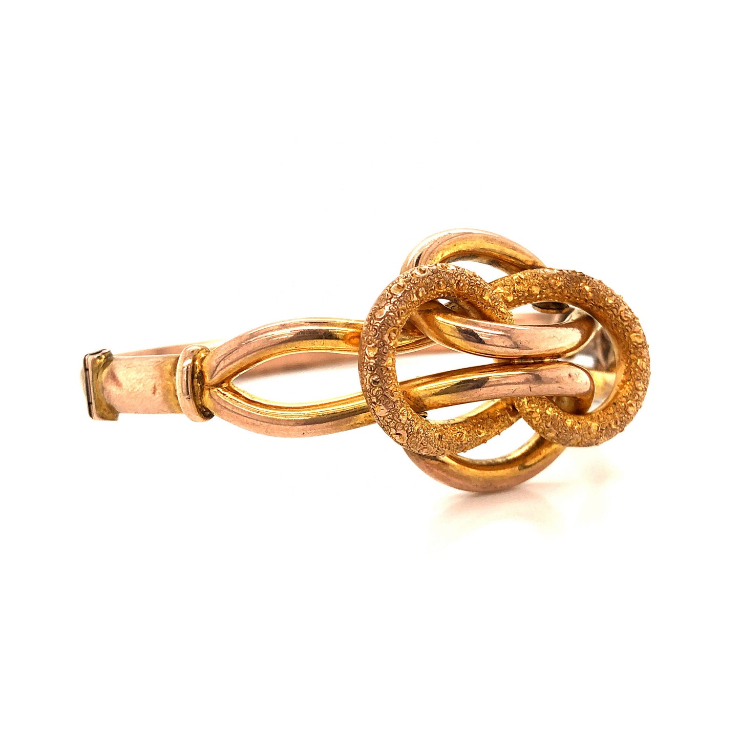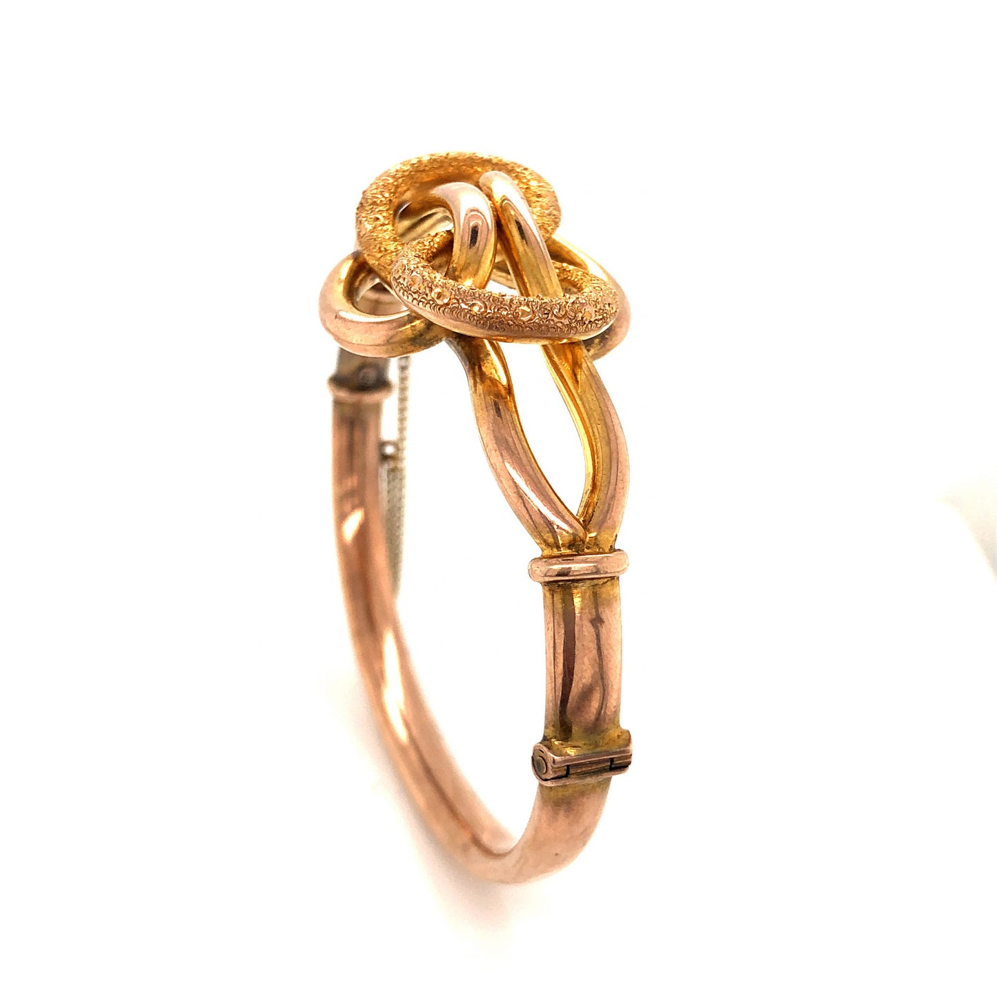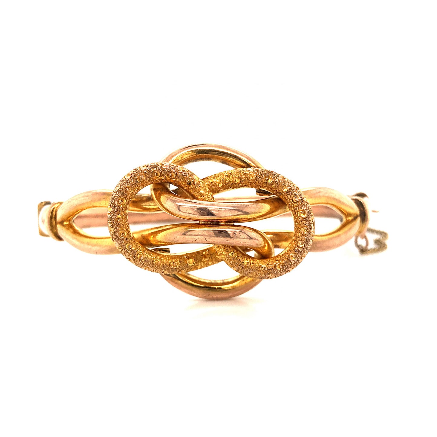 Symbolizing love and commitment, this Victorian knot bangle in 10 karat yellow and 10 karat rose gold is a unique treasure! Perfect for petite wrists, this bracelet has a structured knot design with soft Victorian-era engravings for added texture and style. A perfect piece for any jewelry lover!*
