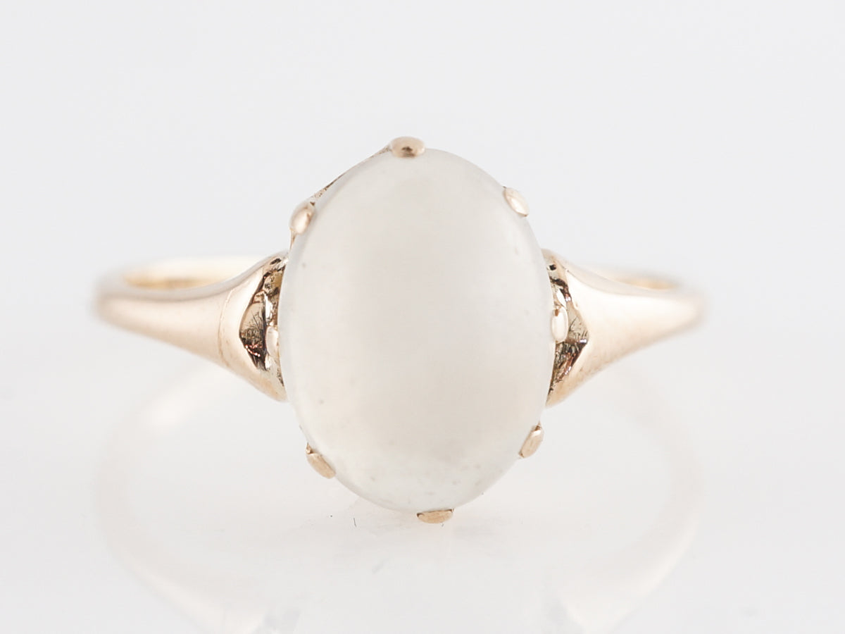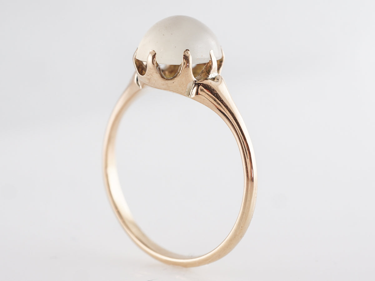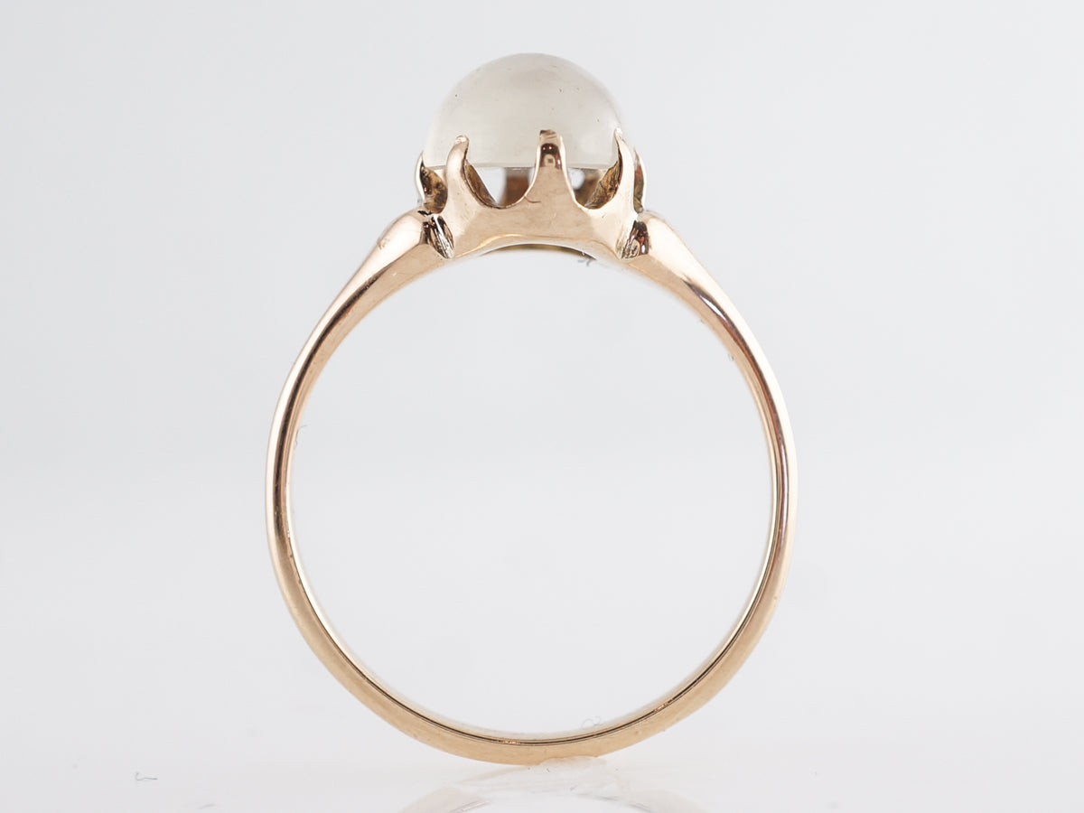Victorian Moonstone Cocktail Ring in 14k Yellow Gold. A delightful 14 karat yellow gold ring with a 2.19 carat piece of cabochon moonstone in the center! The simple Victorian prong mounting is beautifully polished and gives a subtle contrast to the cloudy moonstone. A great cocktail ring at a great price. Make it a gift for someone special.