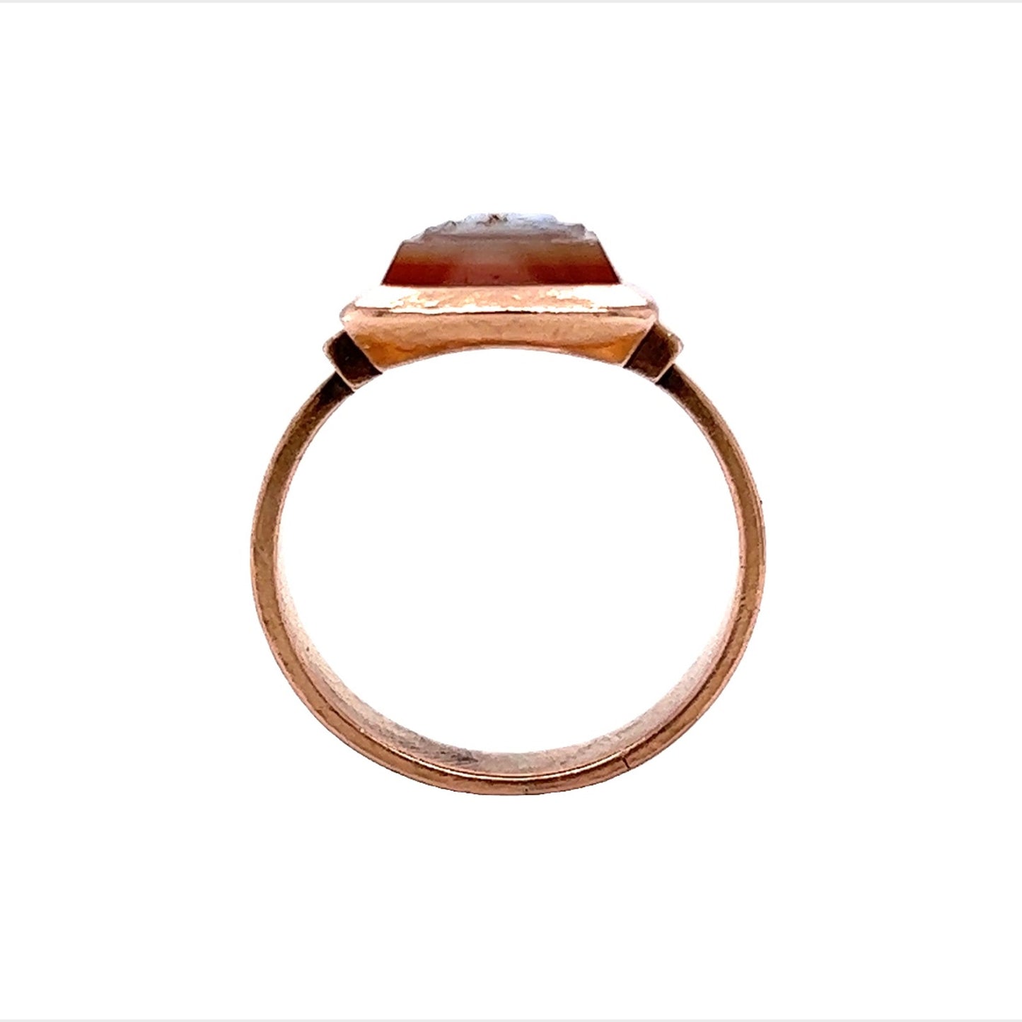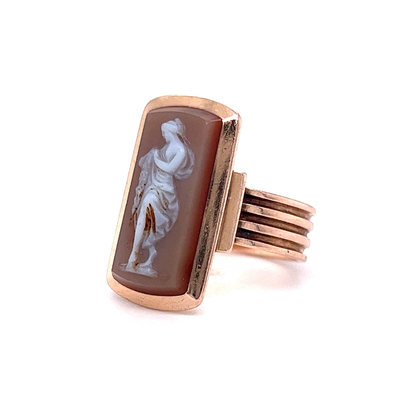 Victorian Muse Cameo Shell Ring in 14K Rose Gold. This fine Victorian shell cameo is set in 14 karat rose gold. The shell cameo was made popular during the Victorian Era so that women could wear them everyday and not worry about damaging a gemstone. This cameo shows a beautifully engraved women in the tall slab of shell. The shank of this ring is rather wide and contains deep grooves as a design element.