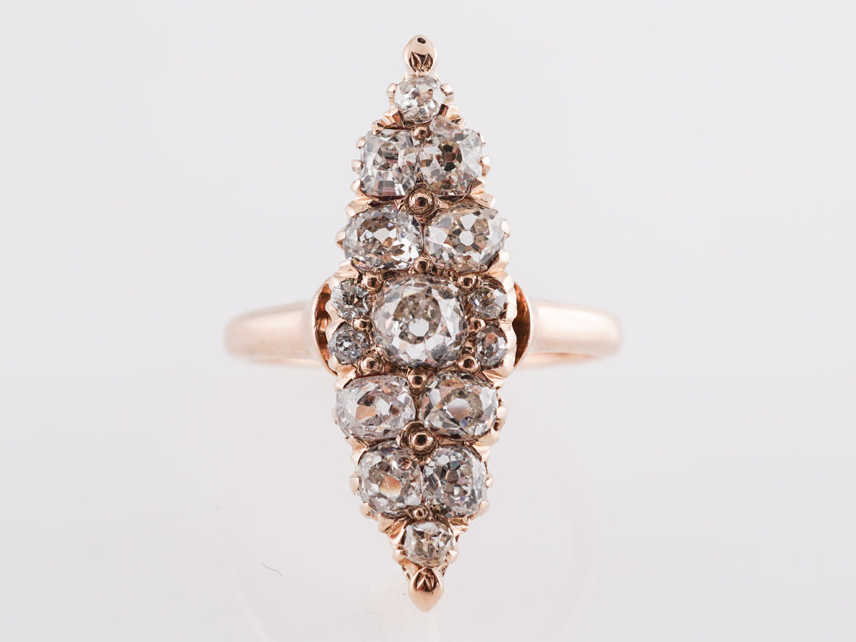 Victorian Navette Diamond Cocktail Ring in 14k Yellow Gold. This ring features a collection of Old Mine Cut diamonds on an interesting marquise shaped head. Creating a cluster of diamonds in the shape of a “little ship”, this navette ring has a beautiful antique charm. The primary diamond is a .25 carat stone with eight (8) accent stones weighing .12 carat and six (6) petite diamonds weighing .03 carats. The setting of the ring showcases a wire-work design that cradles the collection of nearly colorless diamond gemstones. Created in the Victorian era between the 1830s 1900s, this warm yellow gold ring would make a dazzling accessory for your right hand!
