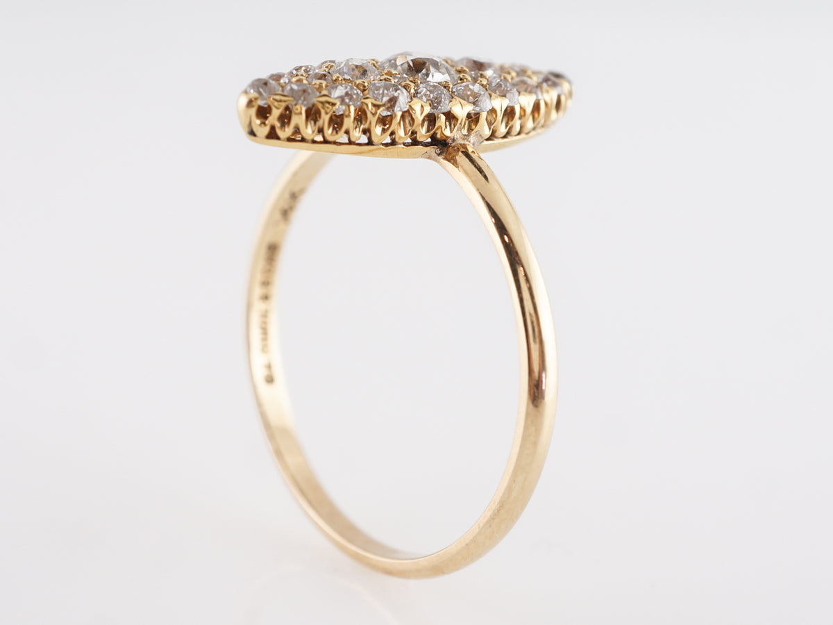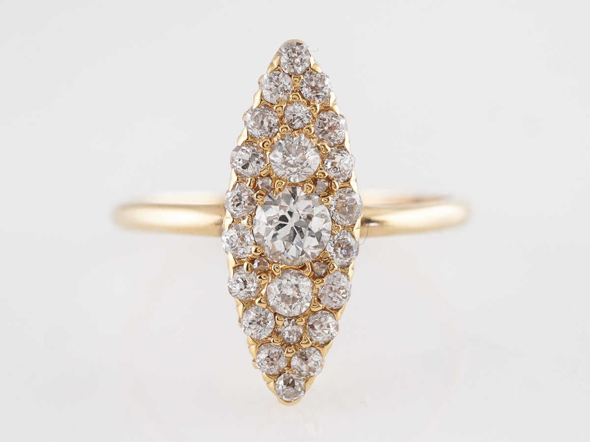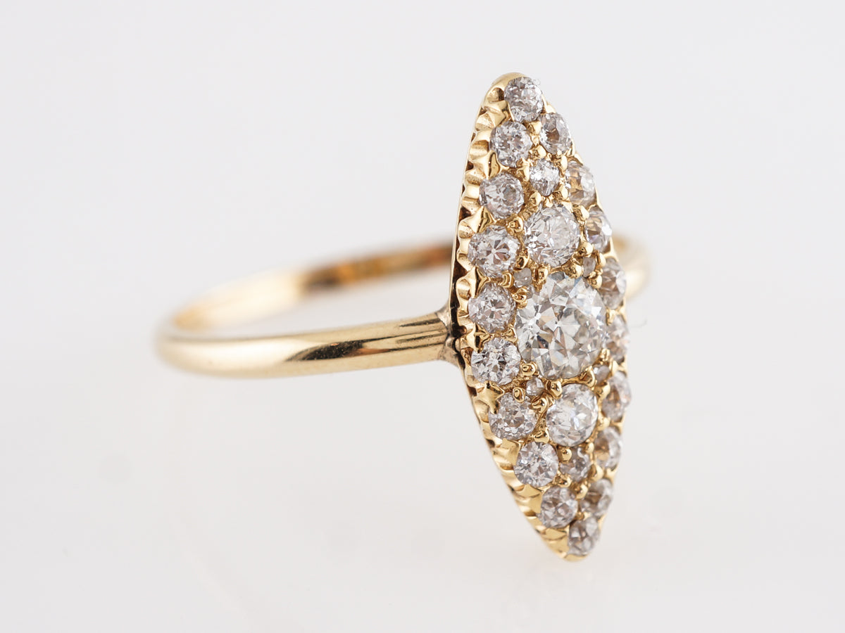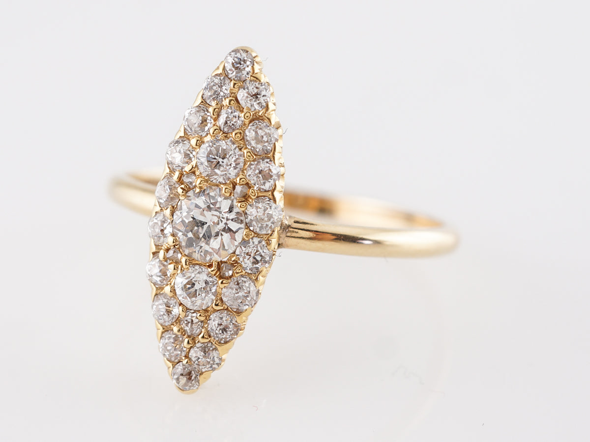 Victorian Navette Ring w/ Old European Cut Diamonds in 14k. This beautiful Victorian cocktail ring features 1.02 carats of old mine cut diamonds which are set in 14 karat yellow gold. The diamonds are set with shared prongs and mounted in a navette shape that runs lengthwise down the finger. This is a wonderful way to incorporate a big diamond look with a highly polished vintage gold mounting.