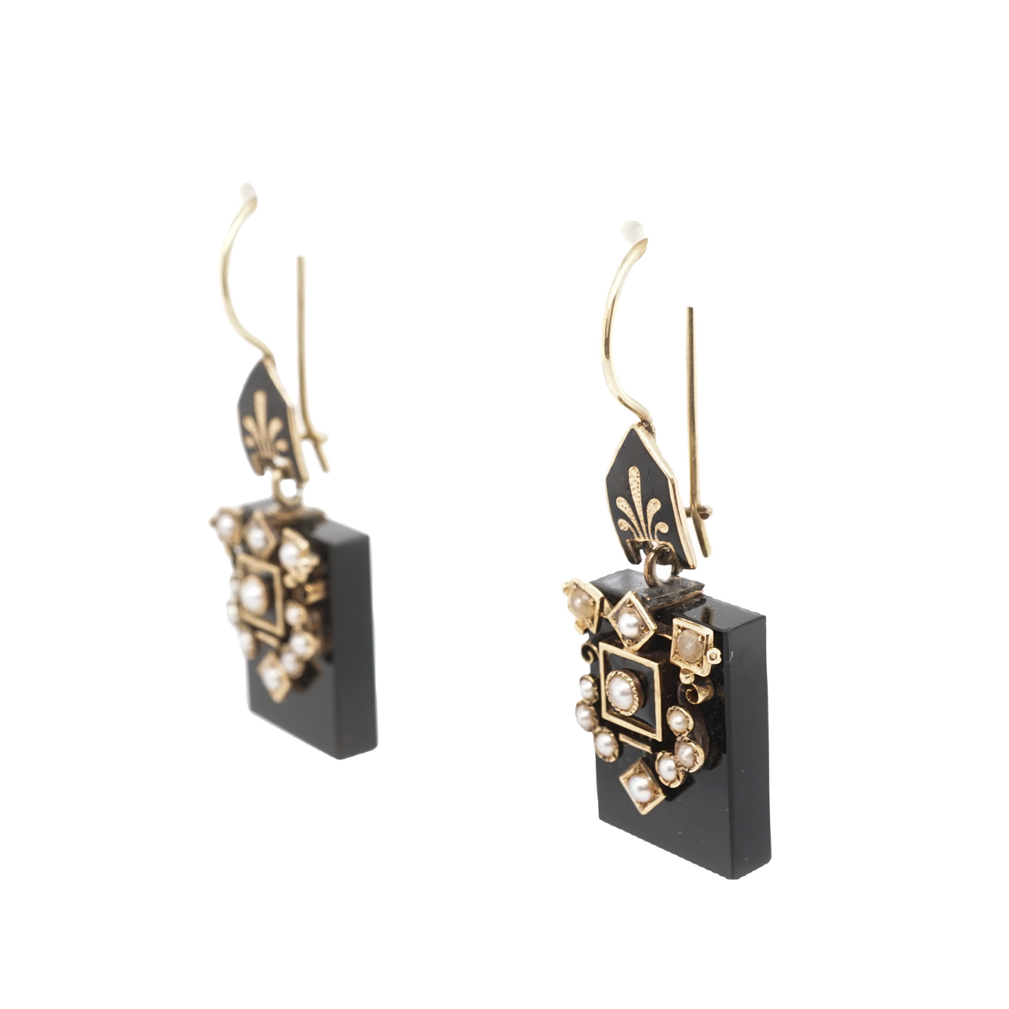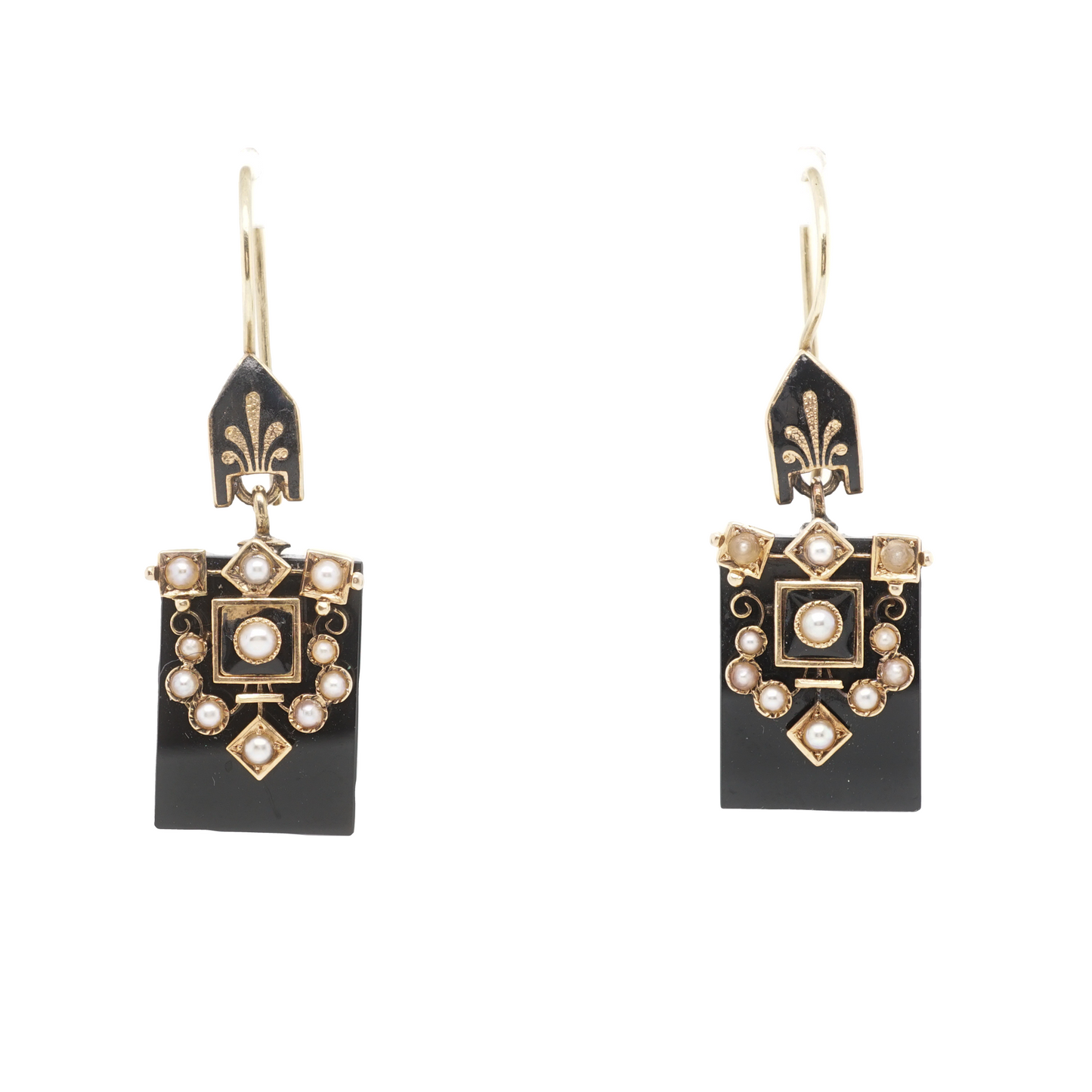 Victorian Onyx & Pearl Earrings in 14k Yellow Gold