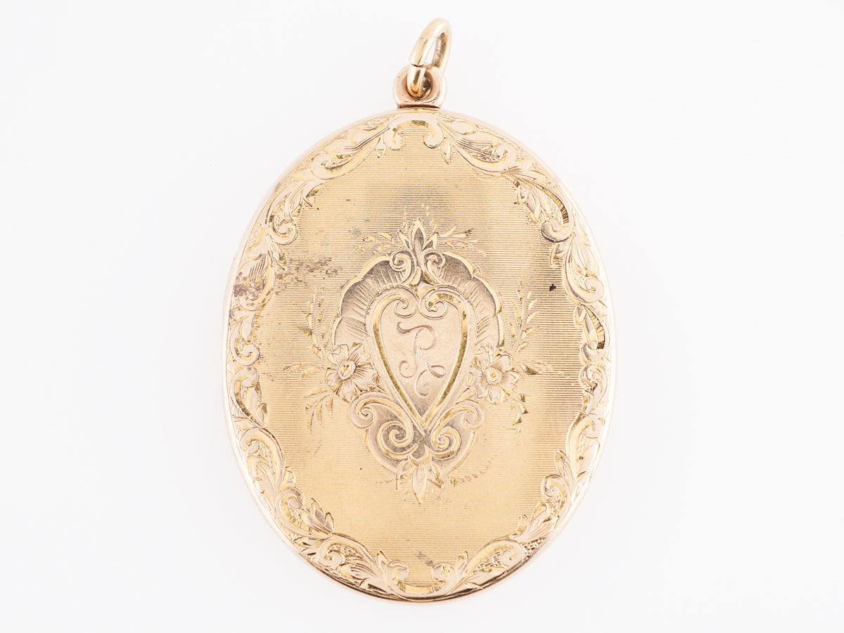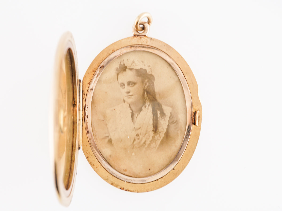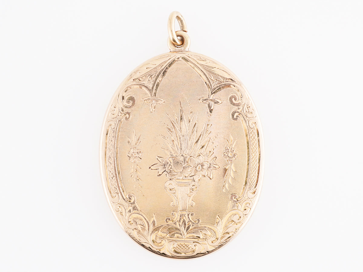 Victorian Oval Locket in 14k Yellow Gold. This stunning locket features an engraved flower bouquet and a golden sepia photograph on the inside clasp. Born in the Victorian era between the 1830s 1900s, this pendant charm is a way to keep the history of loved ones close to our hearts. Lockets were, and still very much are, a sentimental symbol of timeless love. Need help pairing a yellow gold chain for this piece? Contact one of our jewelry experts and we’d be happy to assist you!