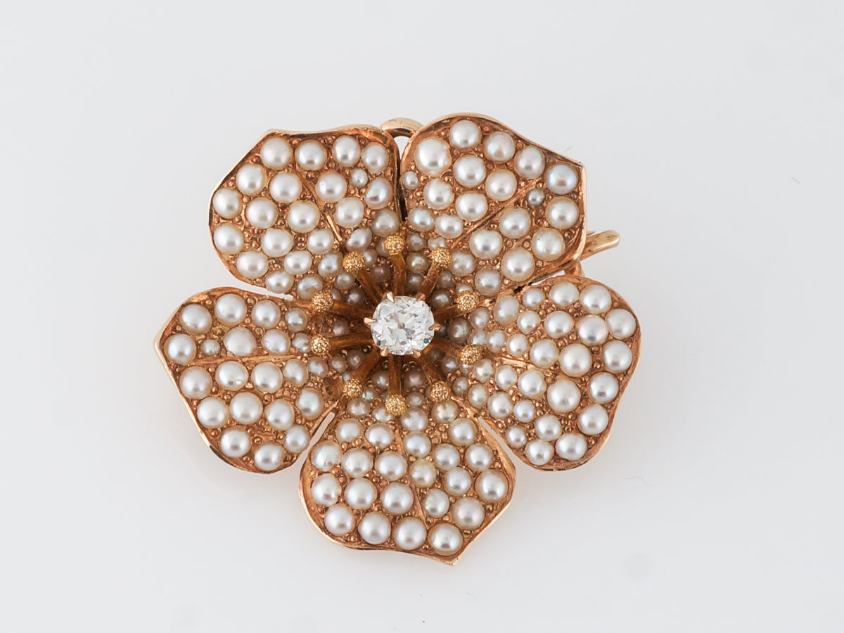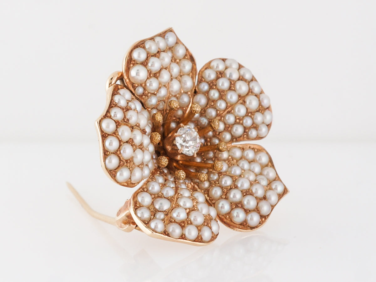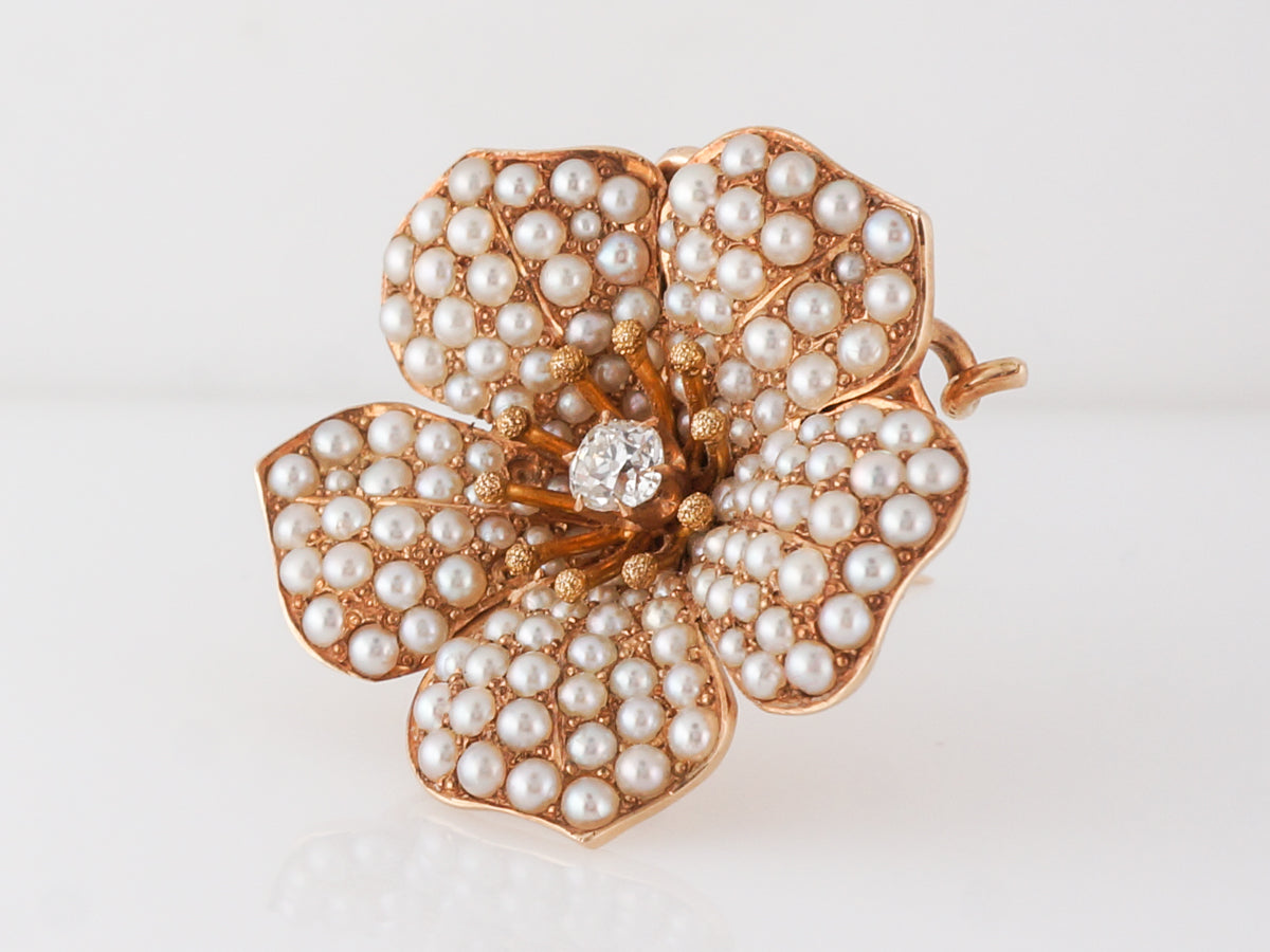 Victorian Pearl Diamond Brooch in 14k Yellow Gold. This fine Victorian brooch features a .32 carat Old European cut diamond amid five 14 karat gold petals adorned with pearls. The brooch invokes the look of a beautiful flower with its pearls creating a lovely glow among the yellow gold setting. This would be a fabulous gift for someone special who has a green thumb!