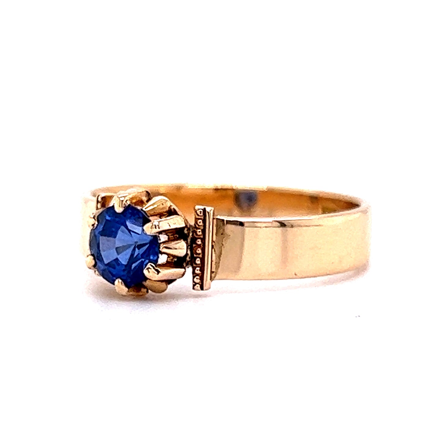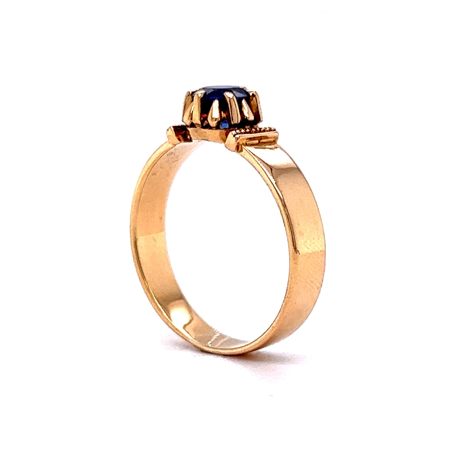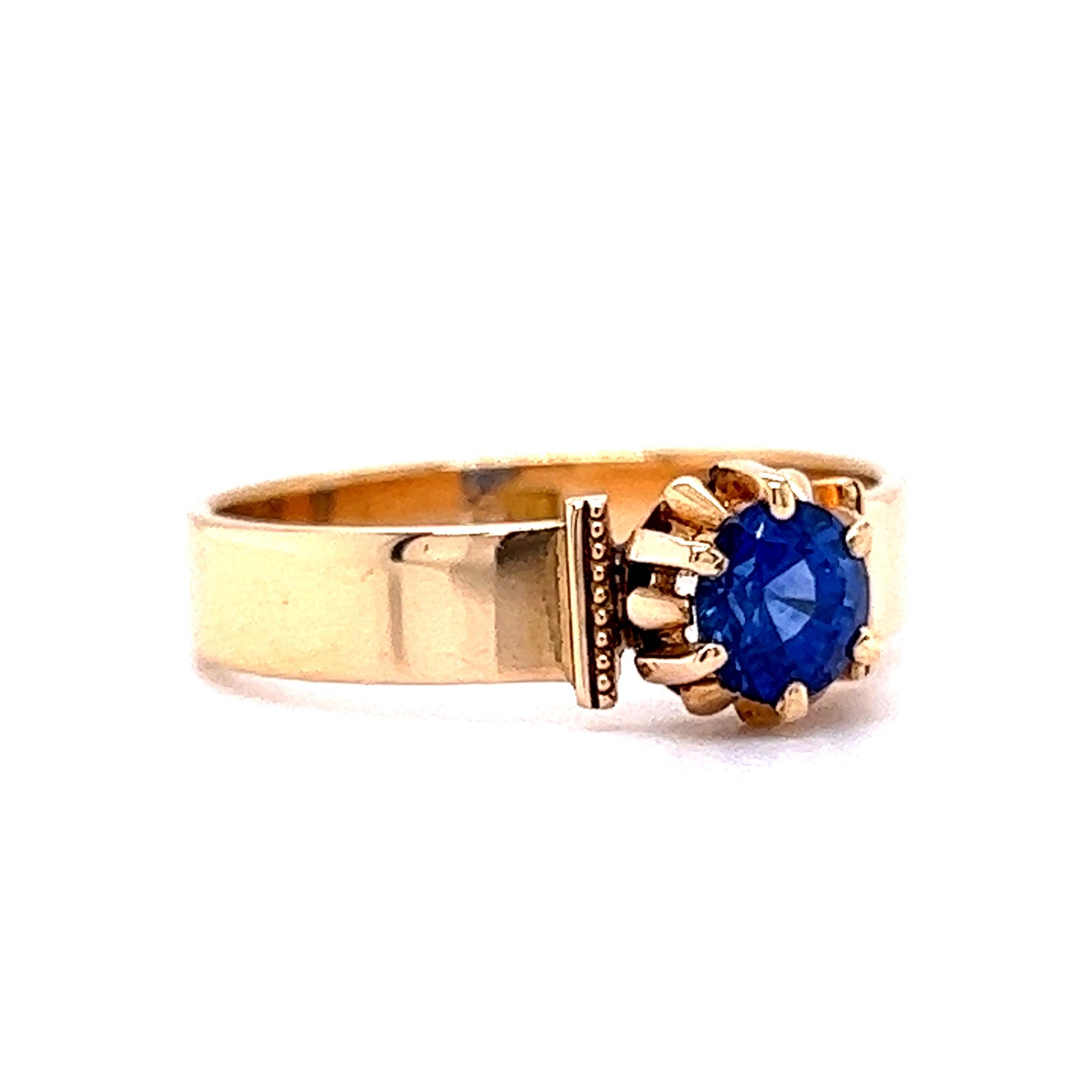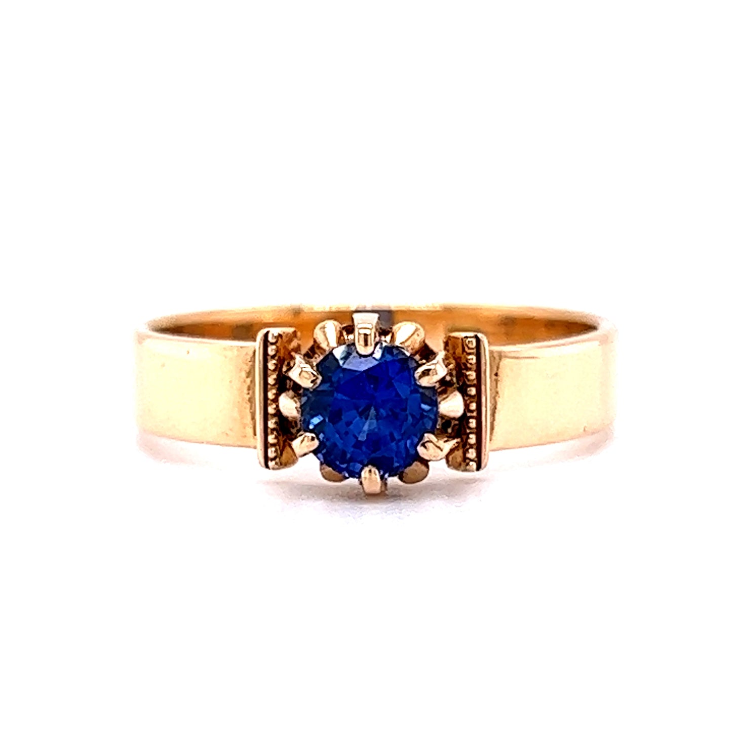 Victorian Round Cut Sapphire Engagement Ring in 18k. This fine Victorian ring features a .67 carat round cut sapphire set in 18 karat yellow gold. The sapphire has gorgeous saturation and is set with a beautiful crown of six prongs. The shank is wide and flat with a high polish, and has a nice line of milgrain on the border with the center stone.