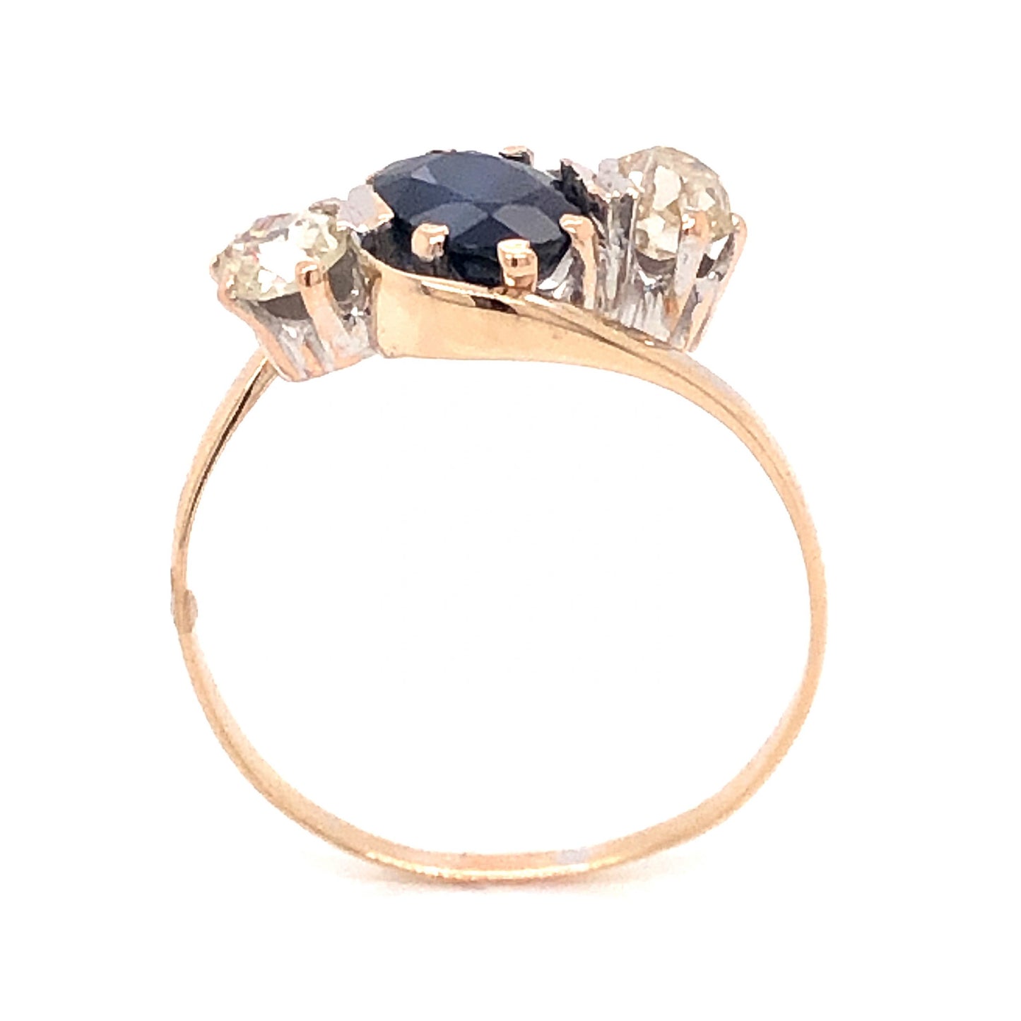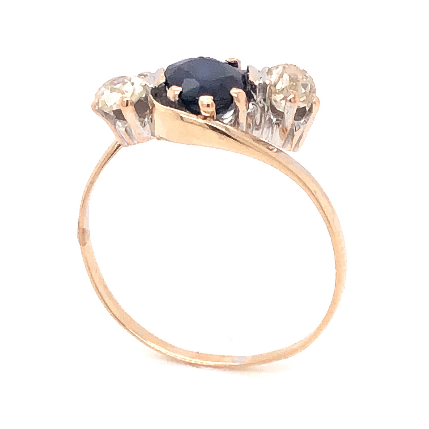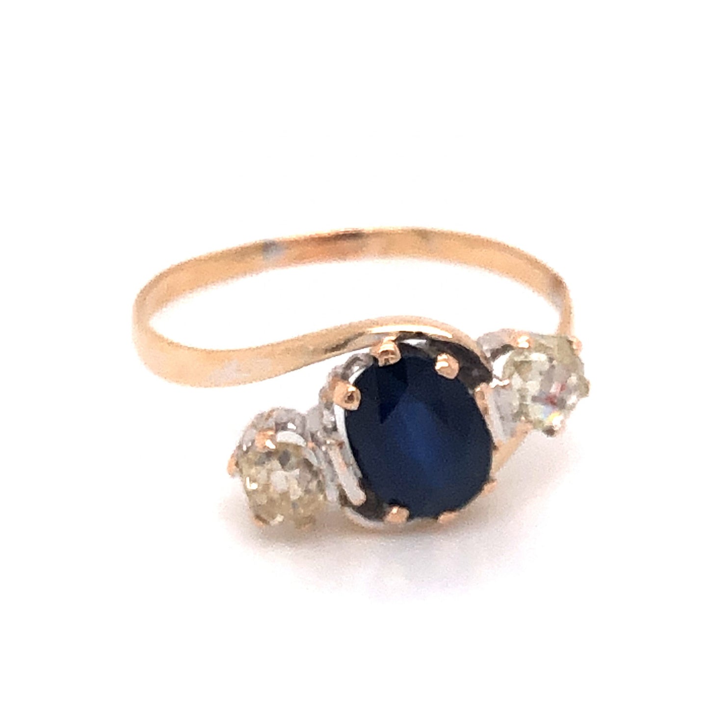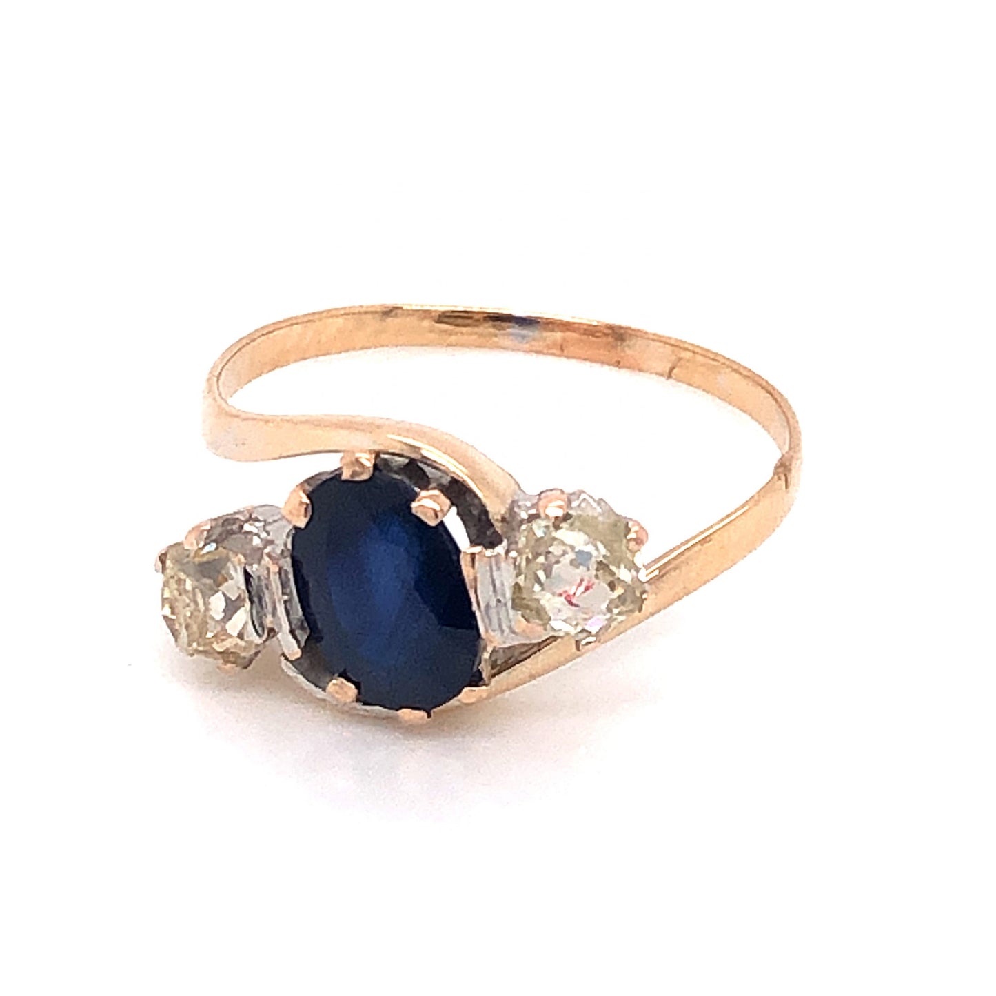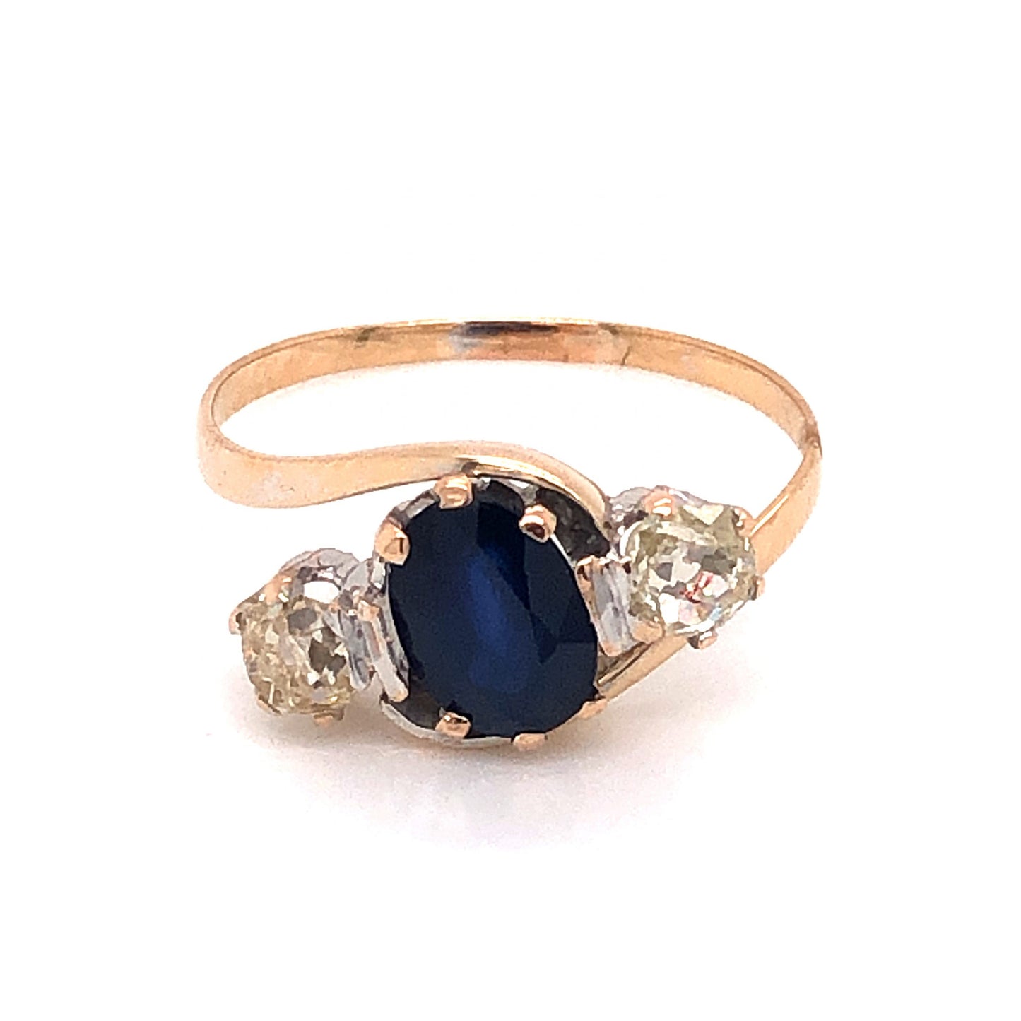 This elegant Victorian engagement ring features a .82 carat blue sapphire and .40 carats of diamonds finished in 14 karat yellow gold. The center sapphire is oval cut and has a highly saturated, dark blue hue. The deep blue sapphire is prong set and accented by two (2) .20 carat diamonds. The accent diamonds are Old Mine cut and have a soft, warm hue that complements the polished yellow gold. The elegant three stone combination is set on a thin, 14k yellow gold bypass band.