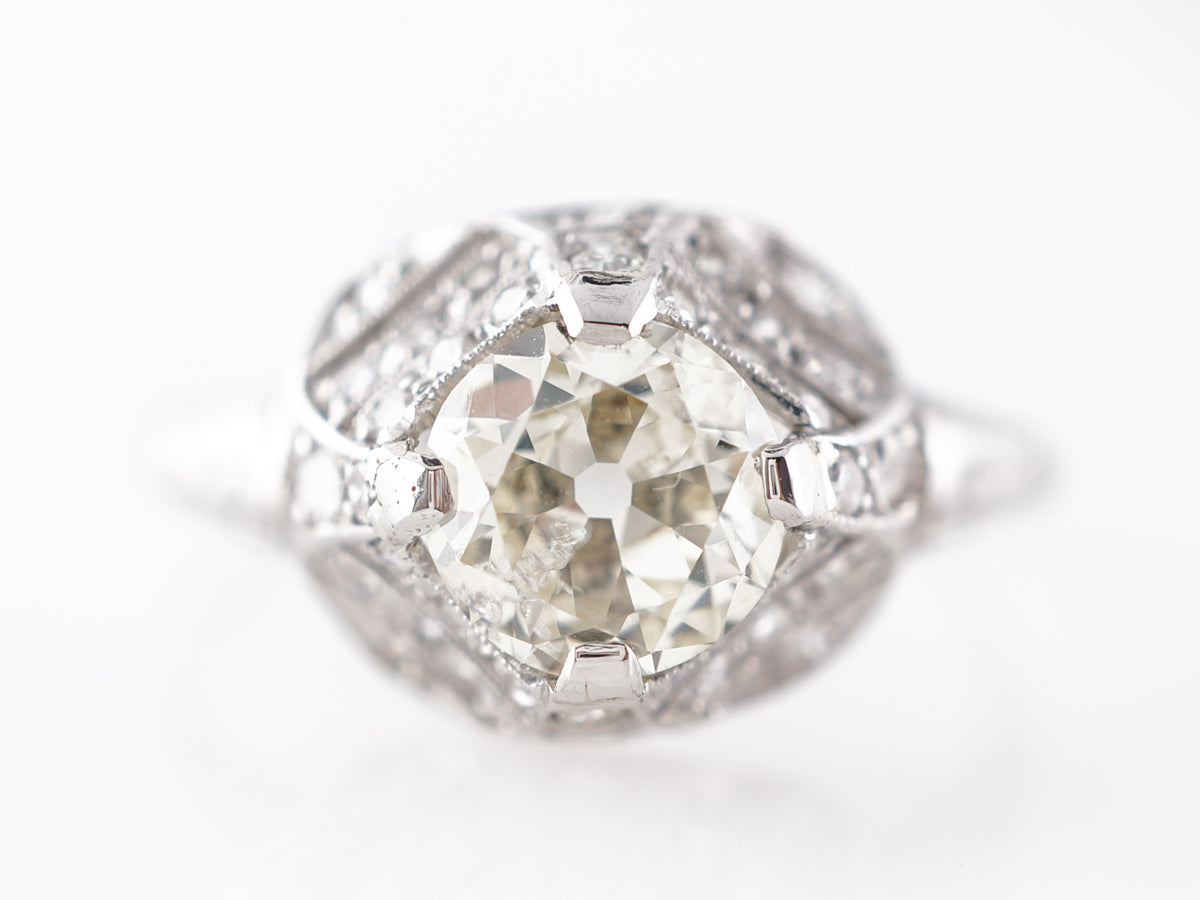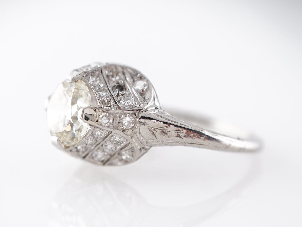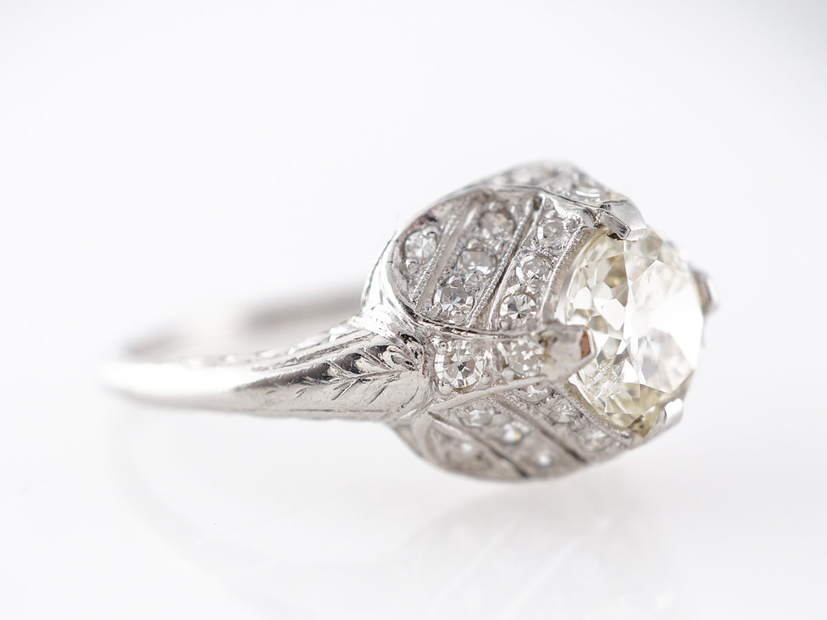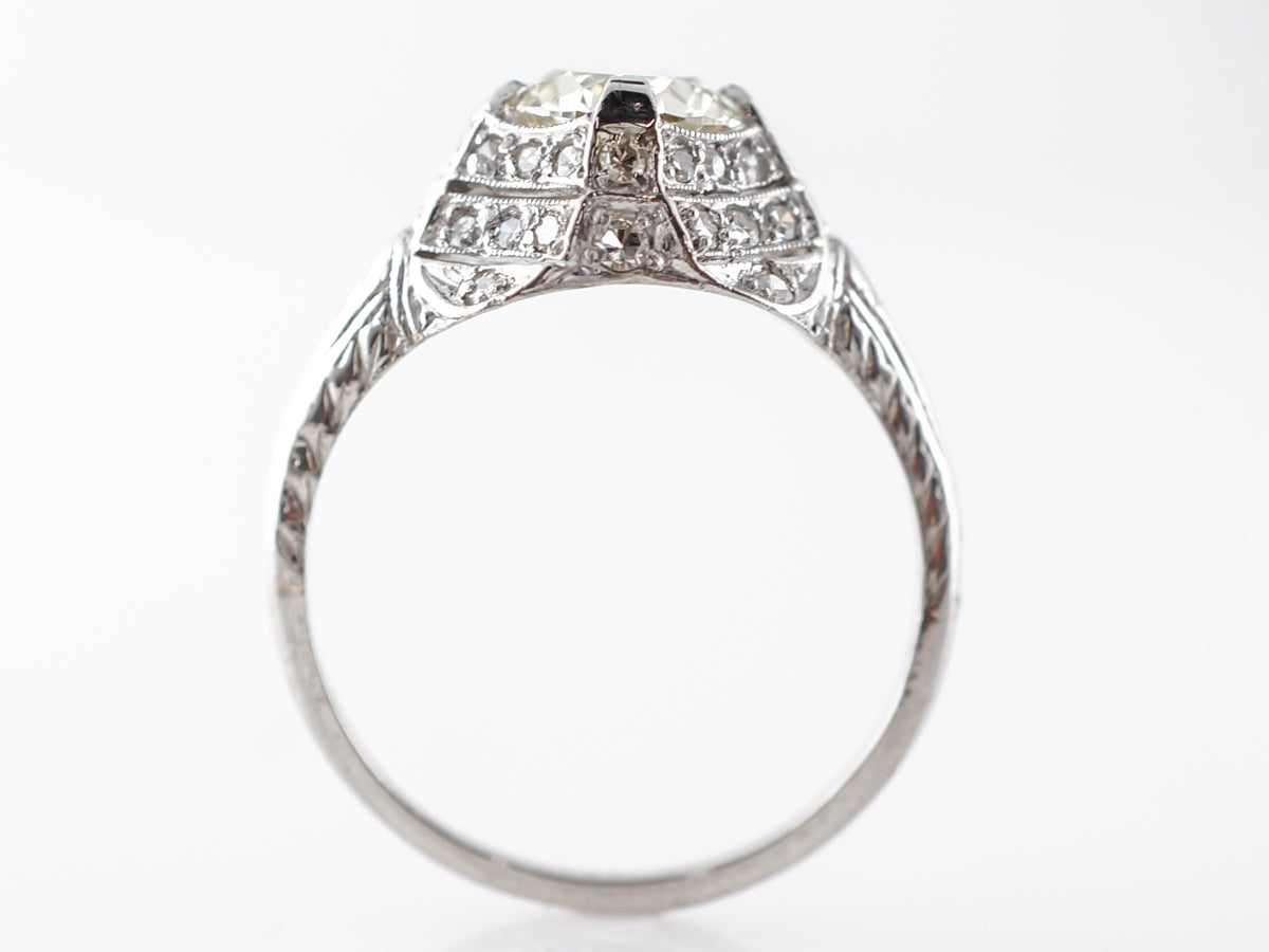 Vintage 1.00 Carat European Diamond Filigree Engagement Ring. This vintage engagement ring features 1.62 carats of Old European cut diamonds set in Platinum. The primary stone is 1.08 carats and is set with four flat prongs that reach over the pave section surrounding it. Below the prominent diamond section are shoulders with chevron engravings into a polished platinum shank. This ring sits high above the finger and succeeds in displaying an opulent Art Deco style!