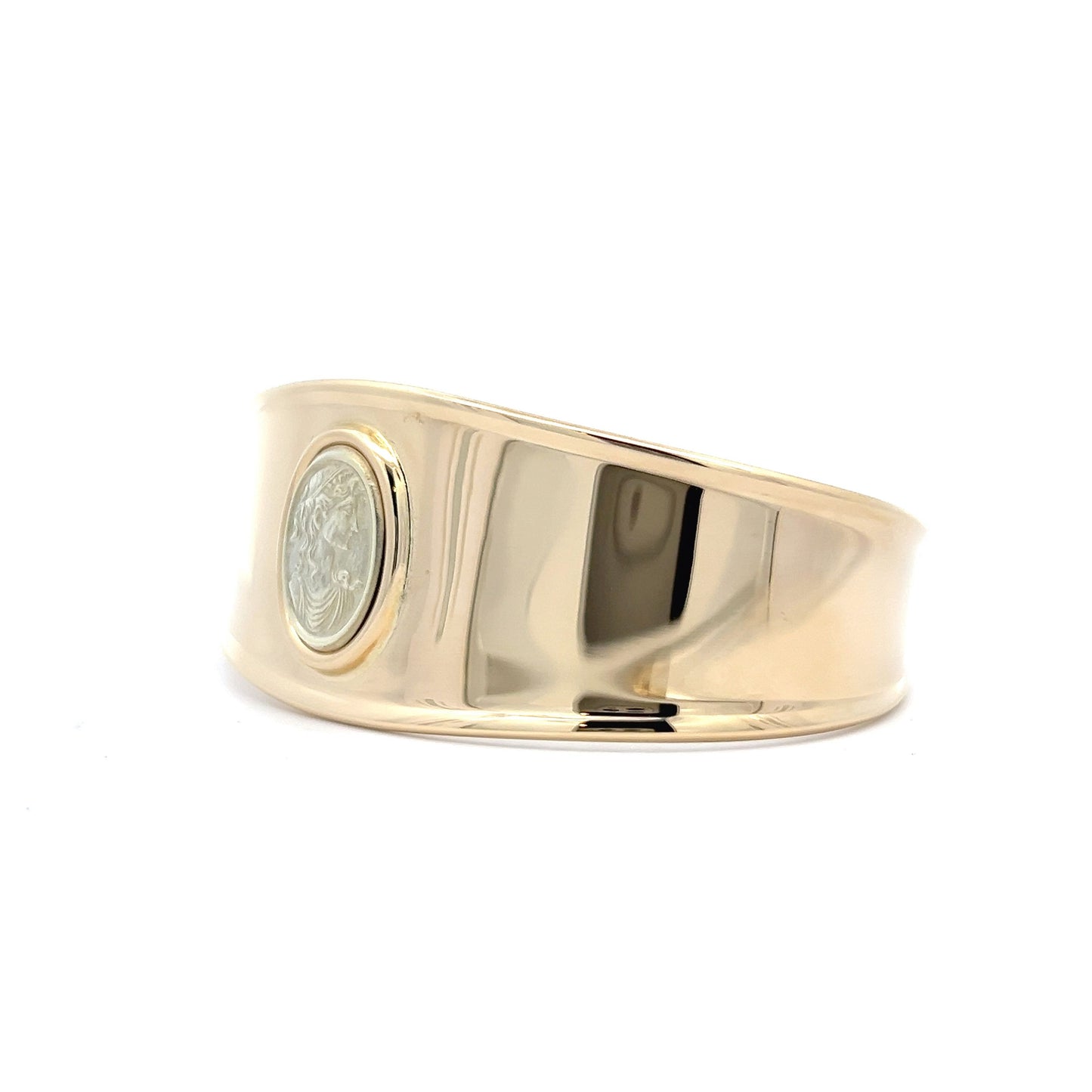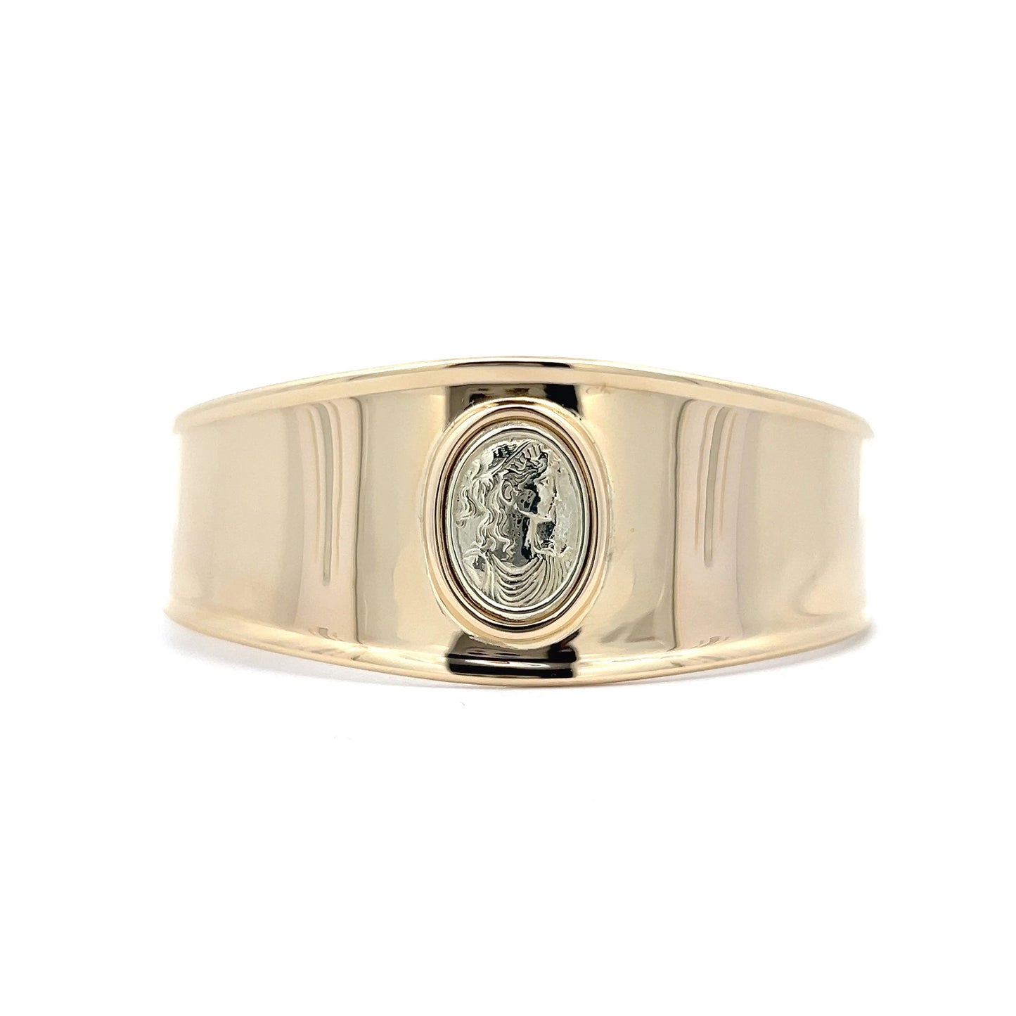 Crafted in 14 karat yellow gold, this cuff bracelet features a Greek woman depicted on a coin at its center, adding a unique touch. The polished yellow gold shines beautifully, making this bracelet the perfect accessory for a daytime or nighttime look. This vintage bangle is slightly adjustable in size, ensuring a comfortable and secure fit for any wrist. With its sleek and elegant design, this bangle is perfect for stacking with other bracelets or wearing on its own for a bold statement.
