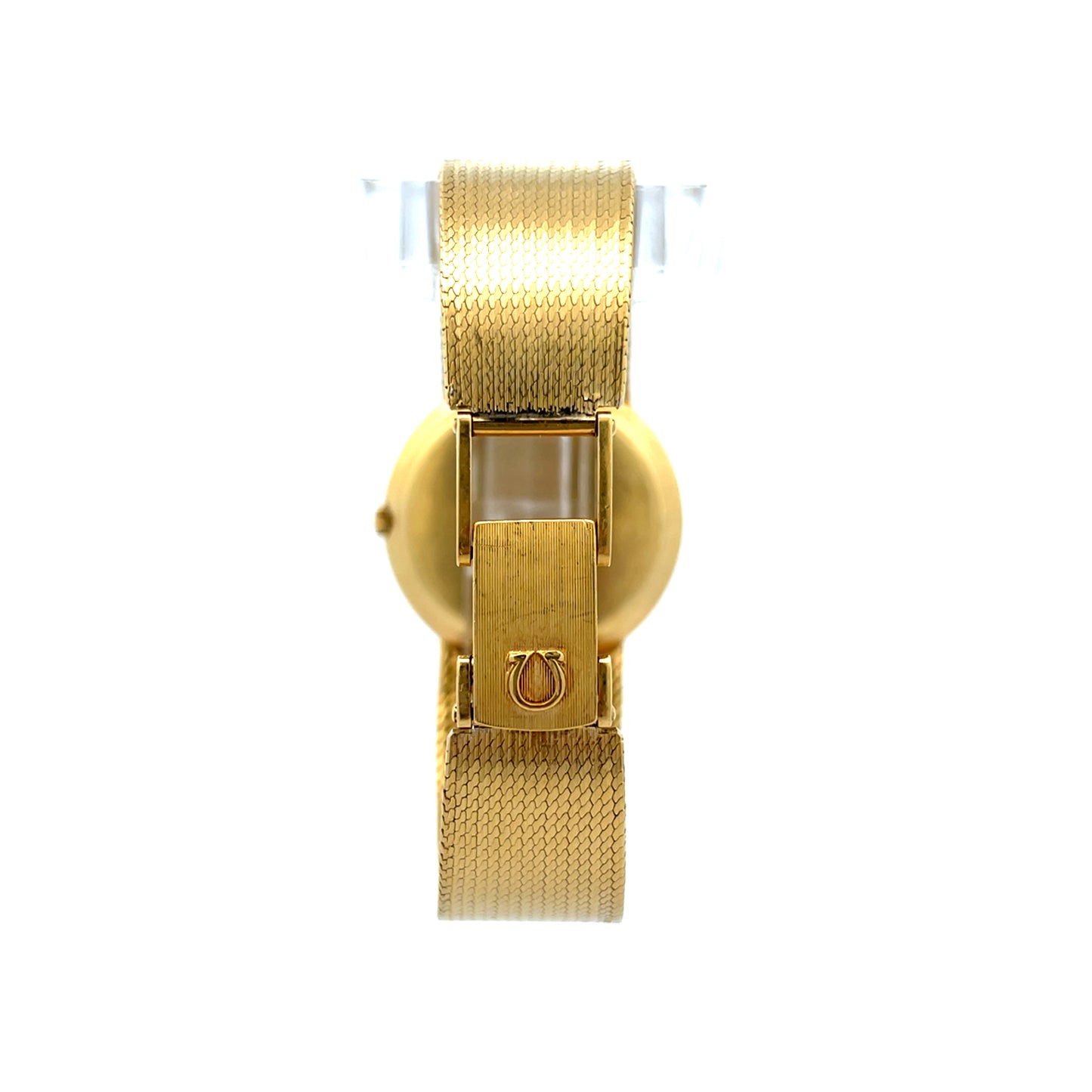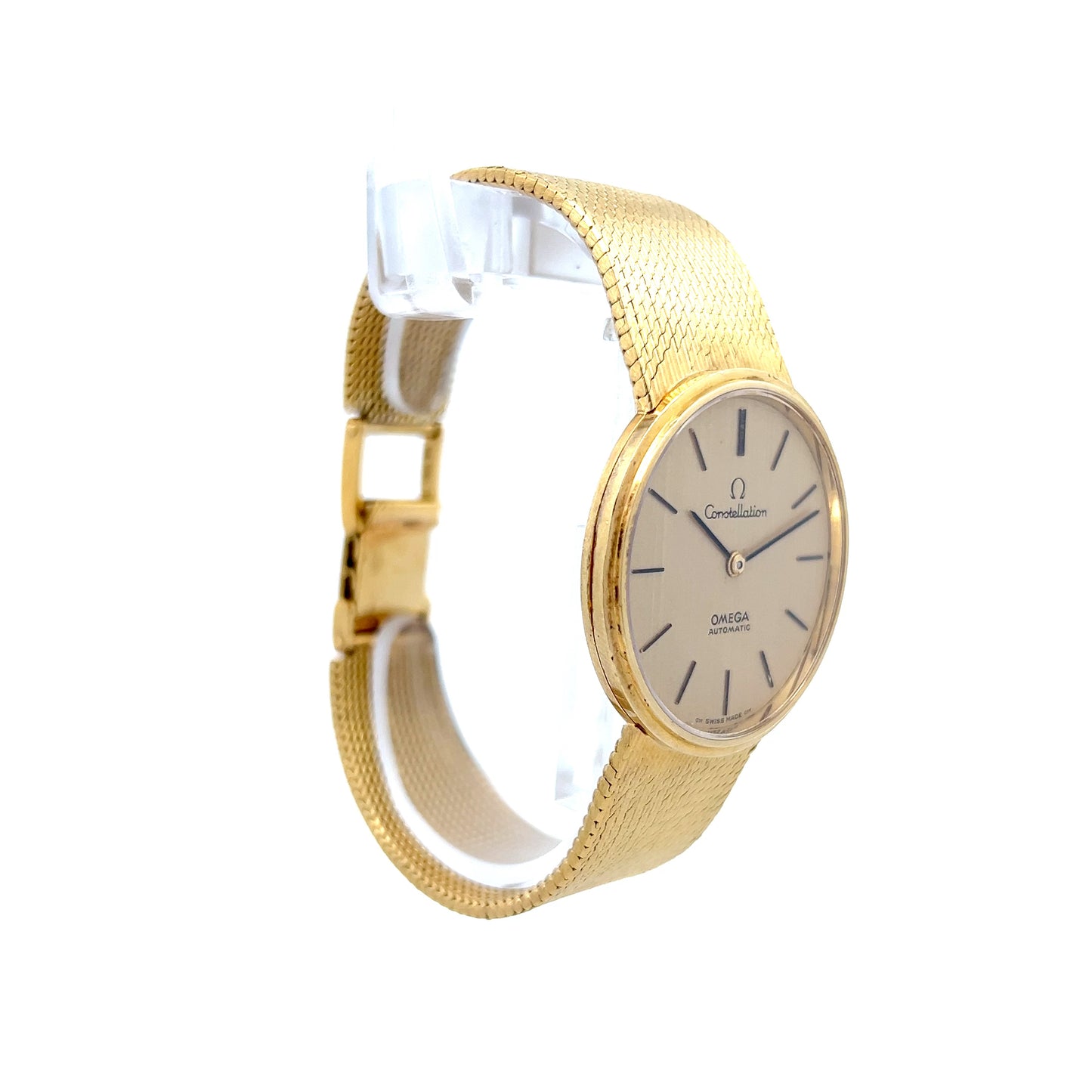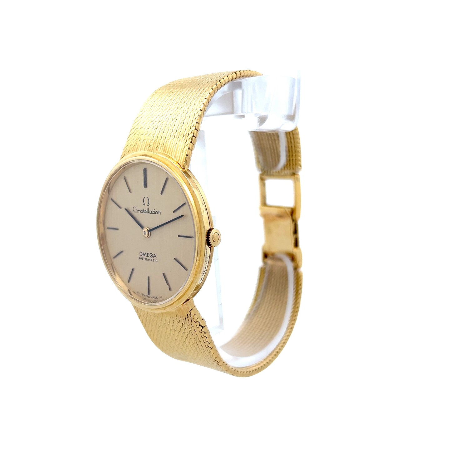 This Omega Constellation watch from the 1960s is made in 18k yellow gold with a matching gold dial that creates a cohesive look. Weighing 65.6 grams without the movement, the watch has substance while remaining comfortable for everyday wear. The watch measures 7.25 inches in length, fitting most wrist sizes without being too tight or loose.