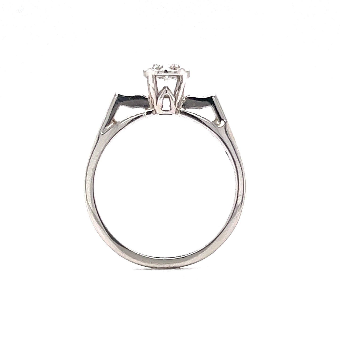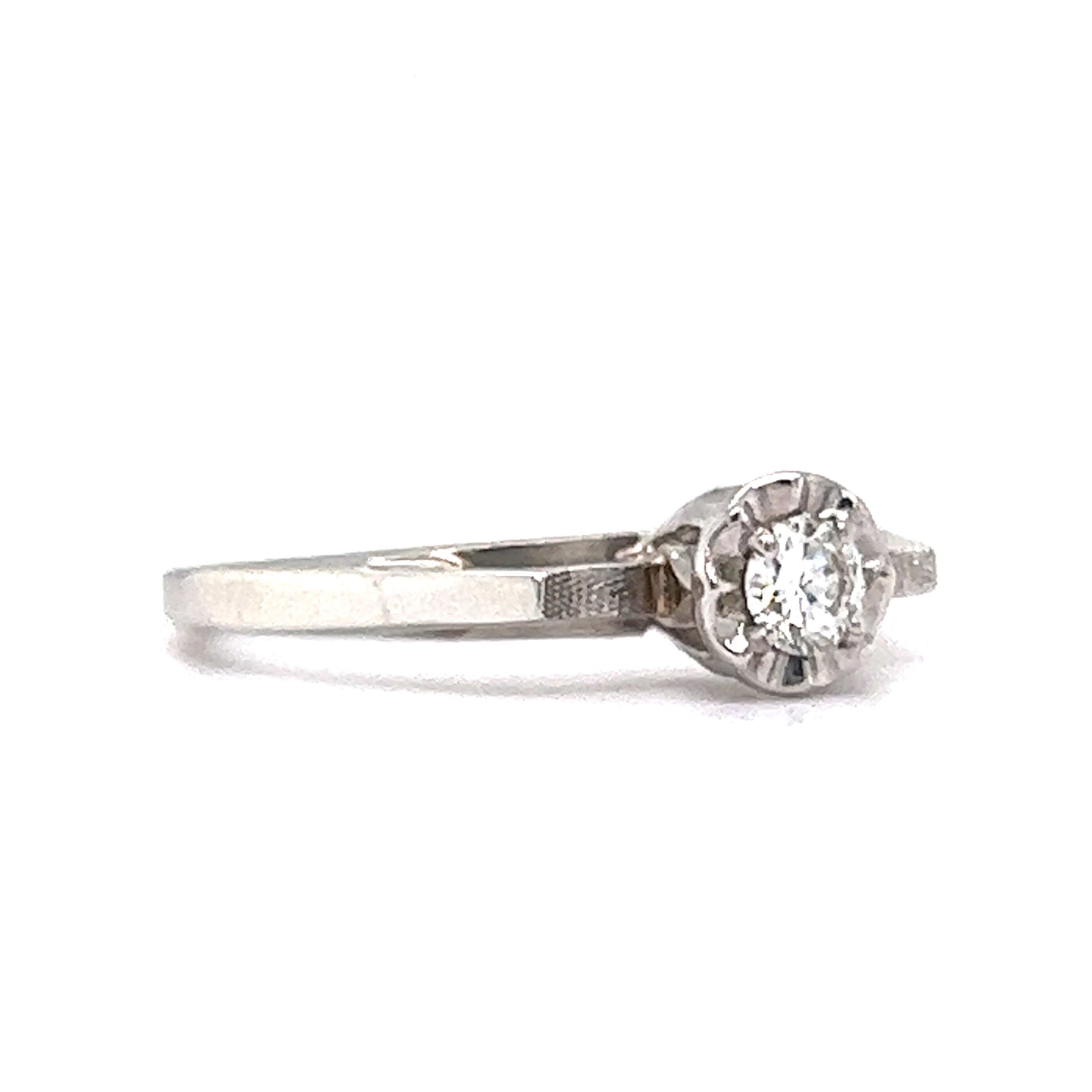 Vintage 1960s Solitaire Diamond Engagement Ring in 14k. This fine Mid-Century engagement ring features a .17 round brilliant cut diamond that is finished in 14 karat white gold. The diamond is set with four (4) prongs over a dainty disc mounting that features small grooves to enhance the brightness of the stone. The shoulders simply plateau below the stone which was a classic vintage style from the 1950s.