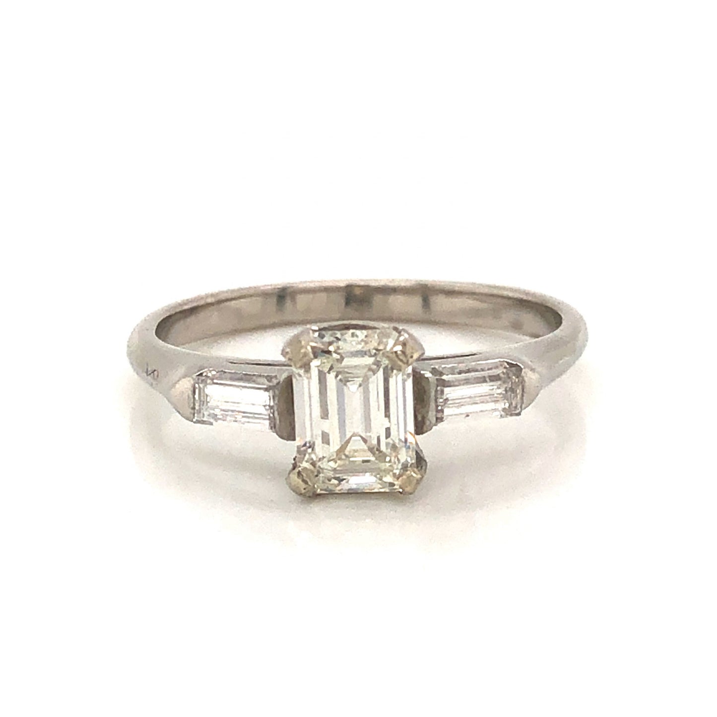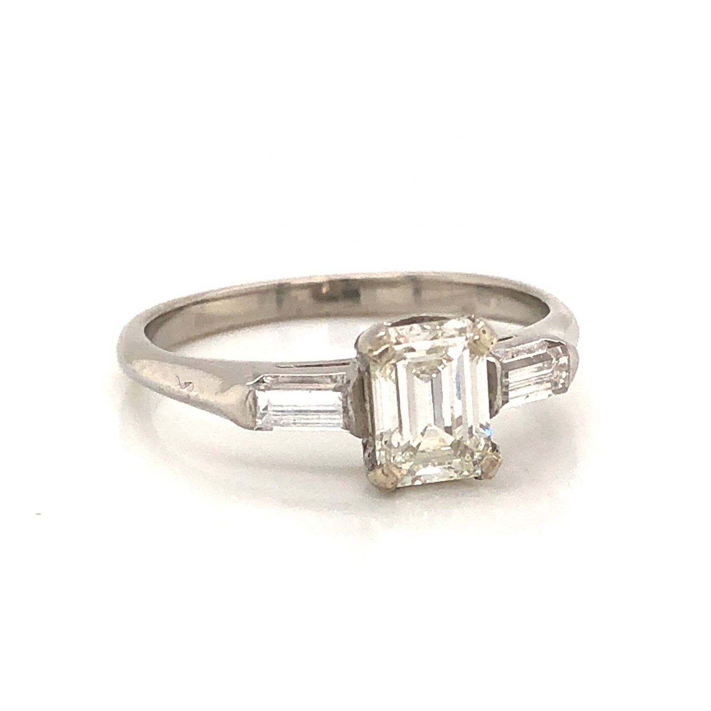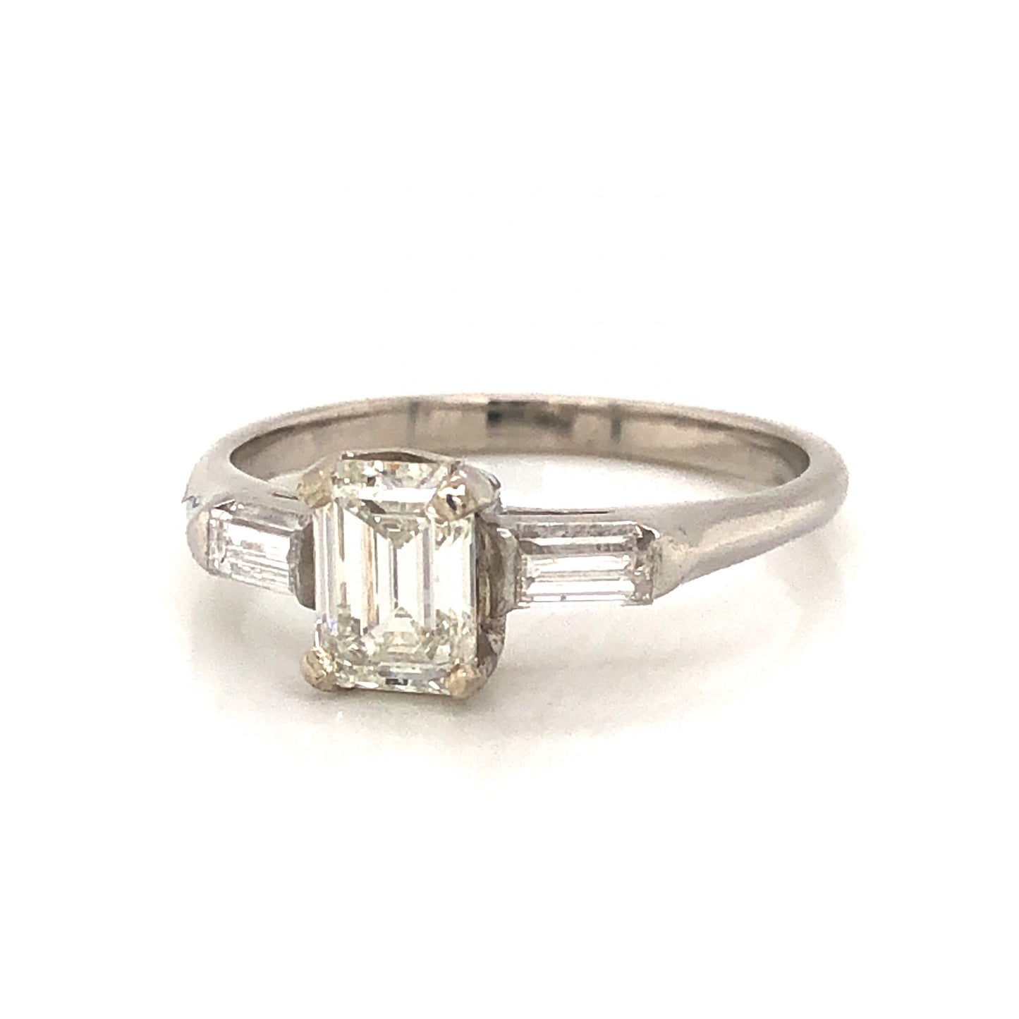 A shimmering work of art from the Mid-Century era! This beautiful vintage engagement ring features a .63 carat emerald cut diamond and diamond accents in platinum. The center near colorless diamond features elongated step facets and is protected by four platinum claw prongs. Eye clean and sparkling like a hall of mirrors, the primary diamond is flanked by two (2) .14 carat baguette diamonds. The accent diamonds are set in structured channel bars. Set in polished platinum, this vintage engagement ring is a dynamic and thoughtful choice for your special engagement!