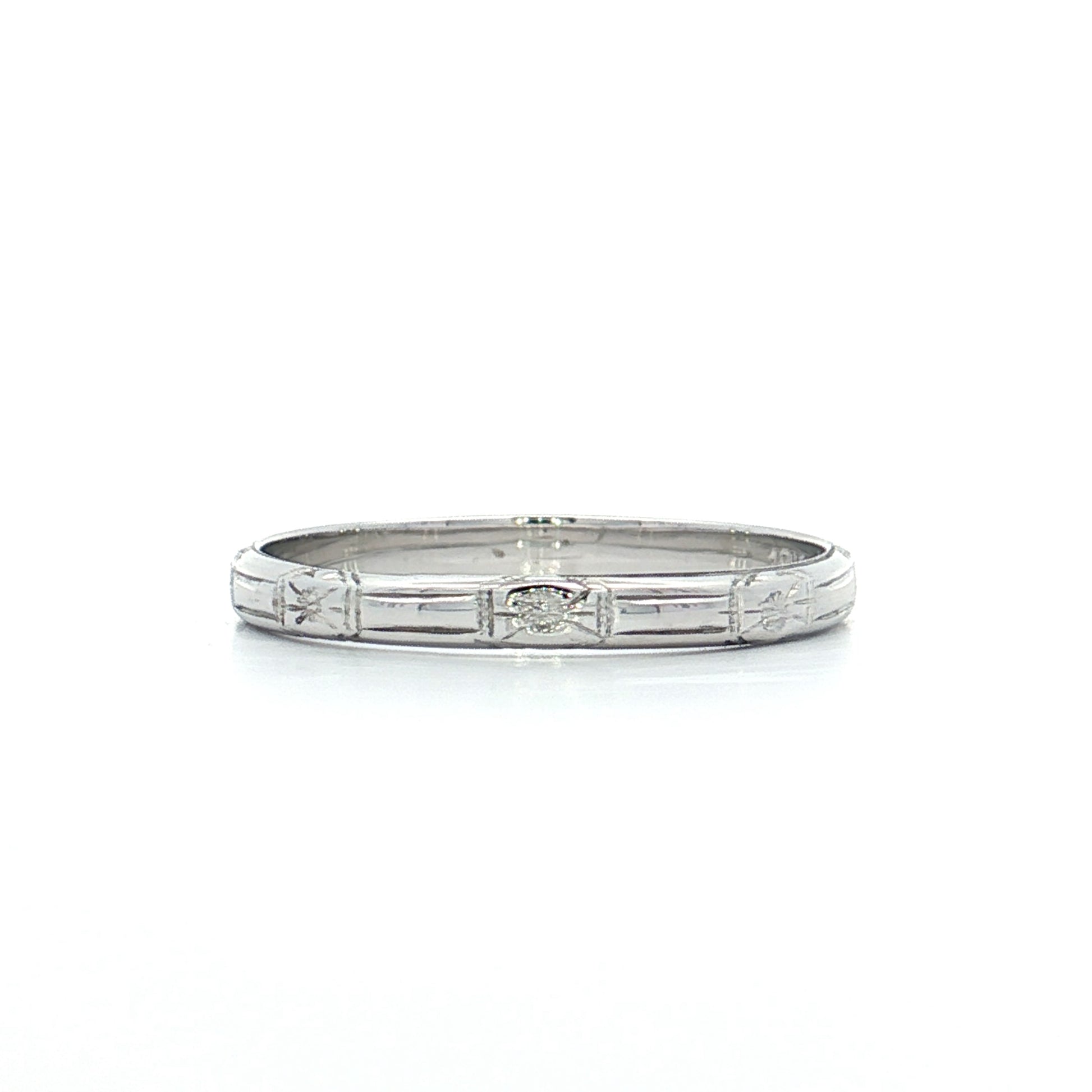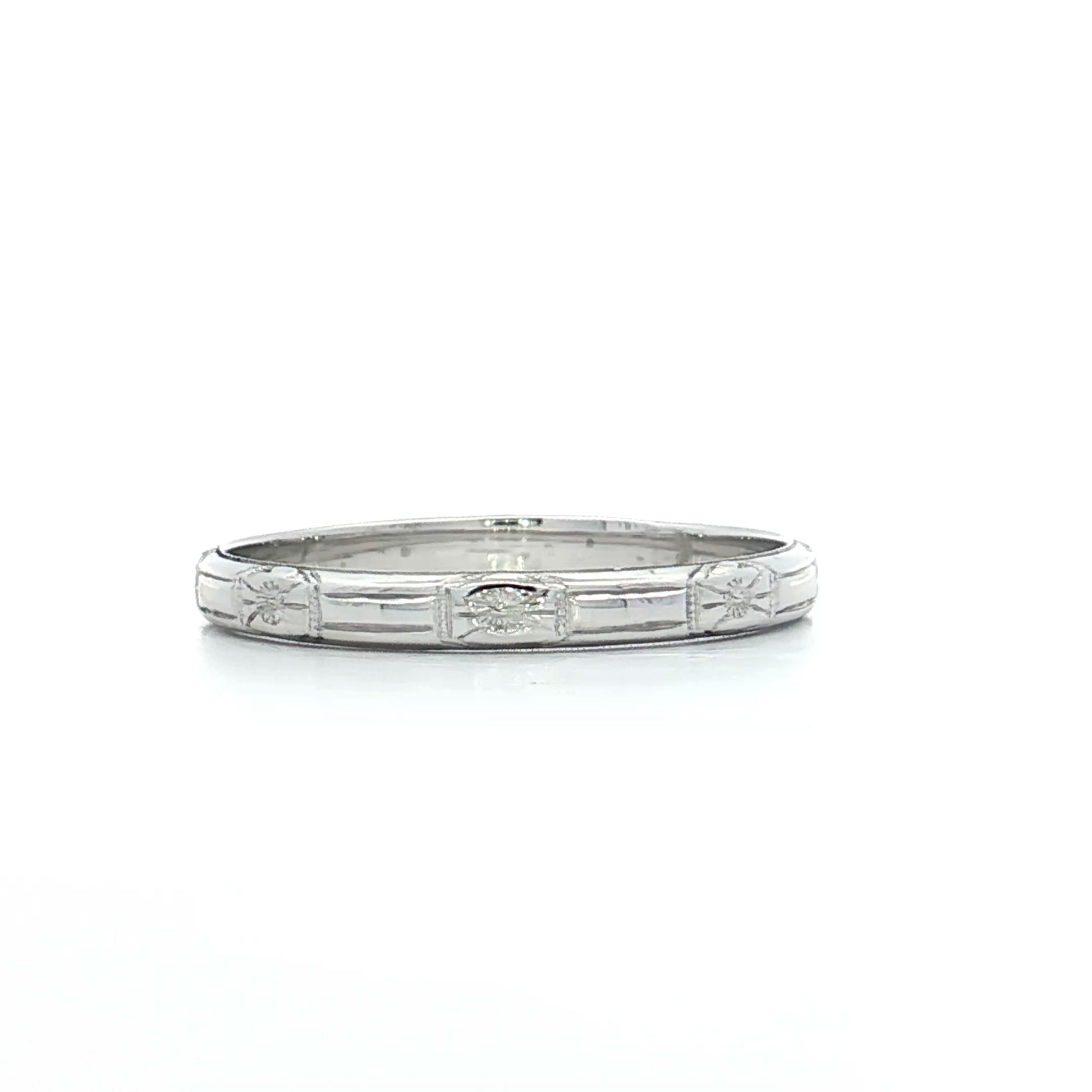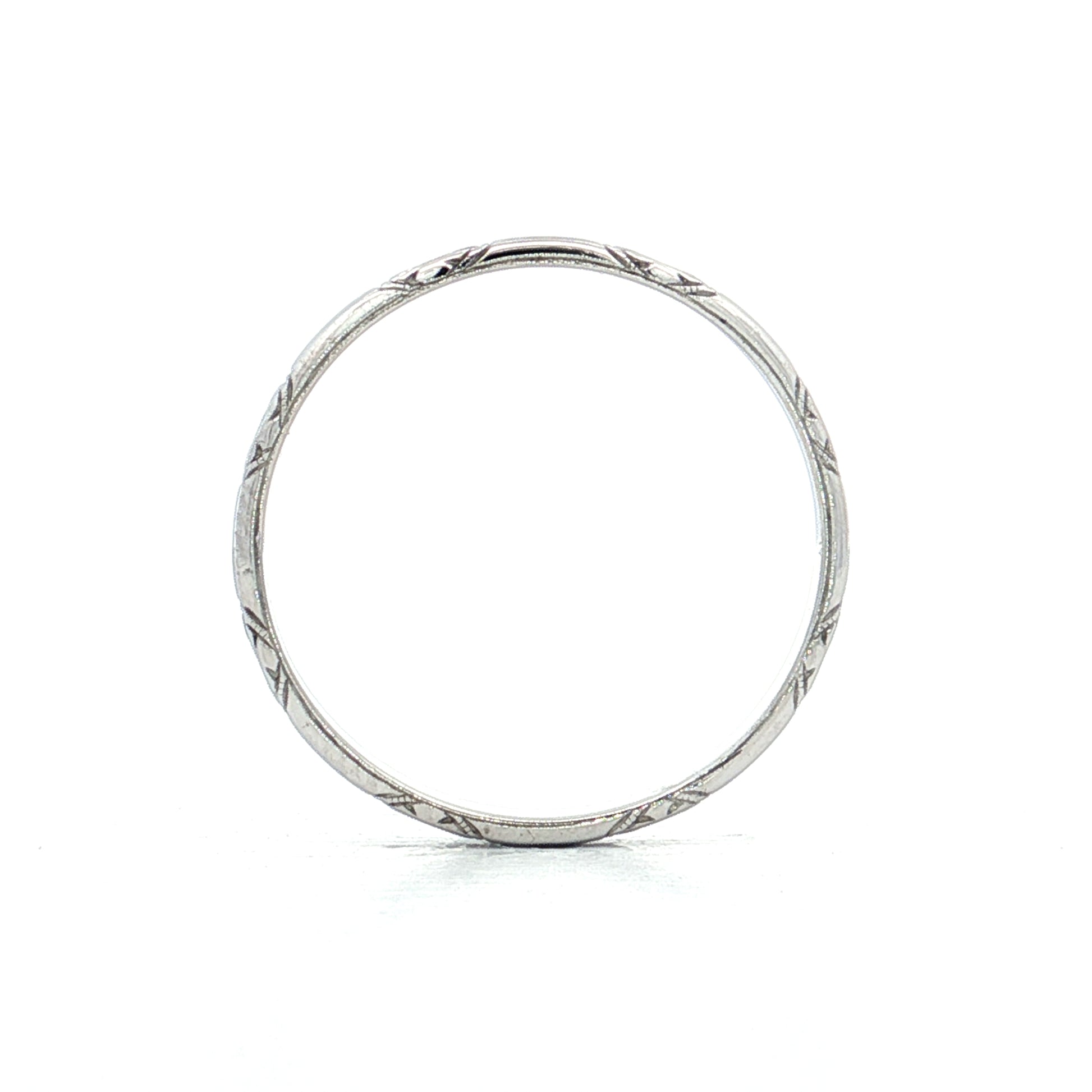The 18 karat white gold has developed a natural patina over the decades that adds to its antique character. At 2.3mm wide, this band is delicate enough for comfortable everyday wear while still showcasing the detailed engraving work.