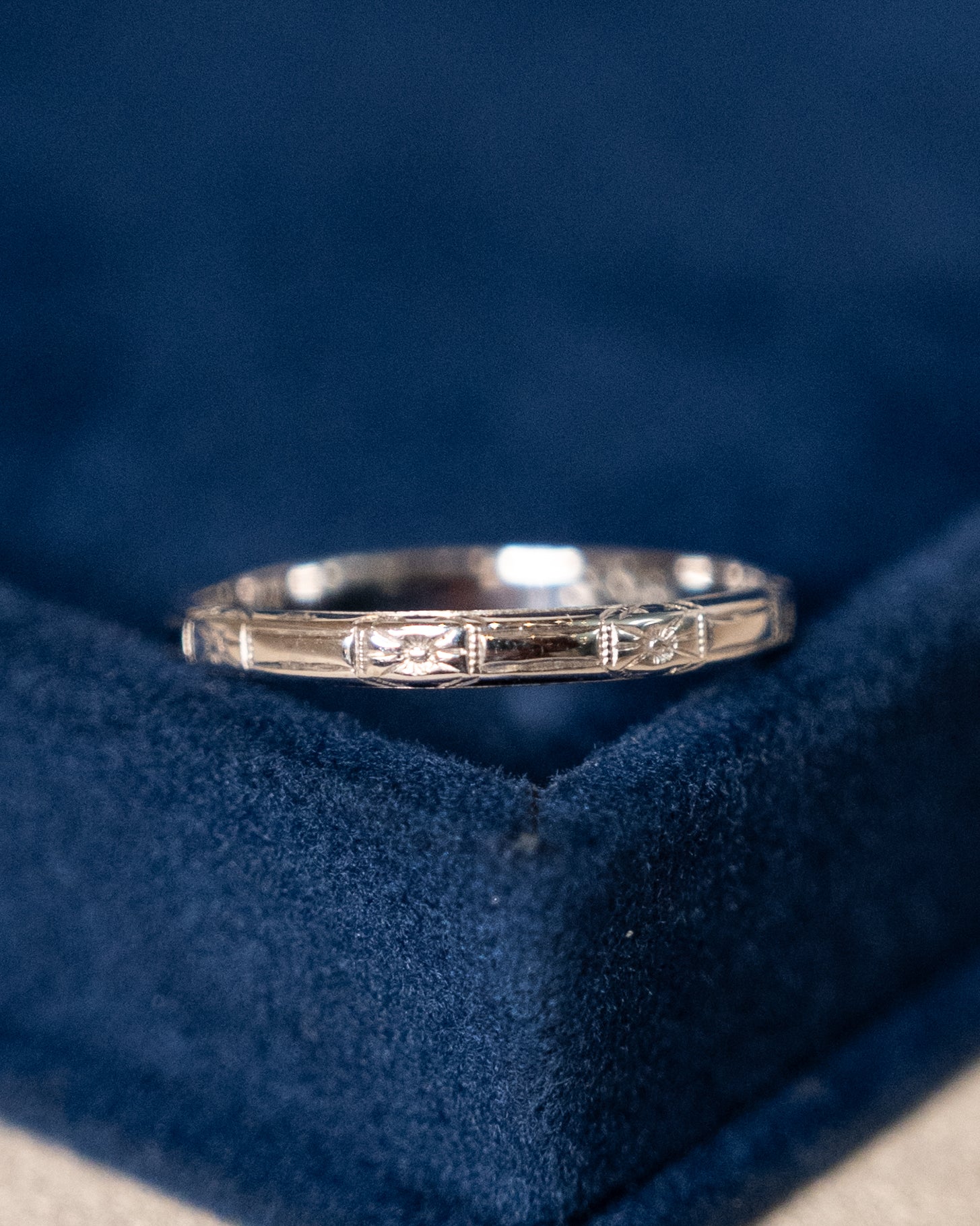 This Art Deco era antique wedding band is made from 18 karat white gold and measures 2.3mm wide. Hand-engraved orange blossom patterns cover the exterior surface, creating dimensional relief that catches light from multiple angles.