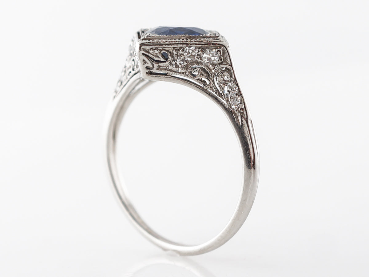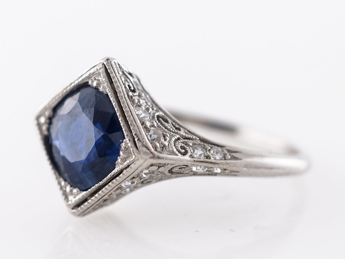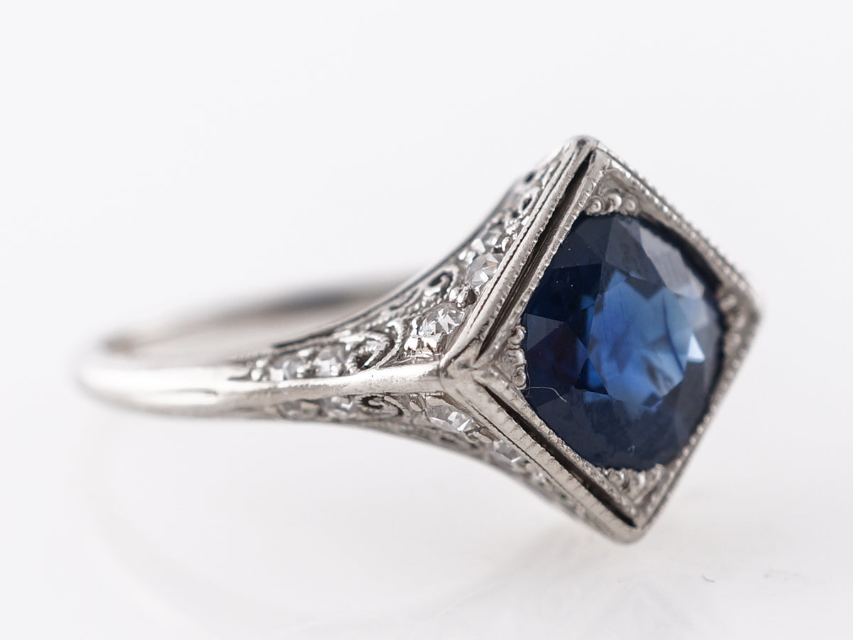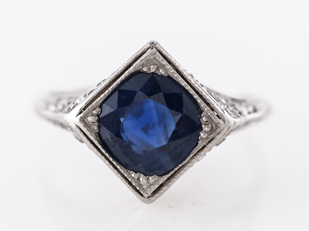 Hayden W. Wheeler Co. Sapphire Filigree Engagement Ring. This darling sapphire engagement ring features a 1.48 carat sapphire set in platinum. The design of the ring places a square in which the sapphire is set with three (3) beads in each corner. The shoulders and gallery feature beautiful filigree work, furthering this distinguished rings unique look. This ring was crafted by renowned Art Deco jeweler Hayden W. Wheeler of New York City.