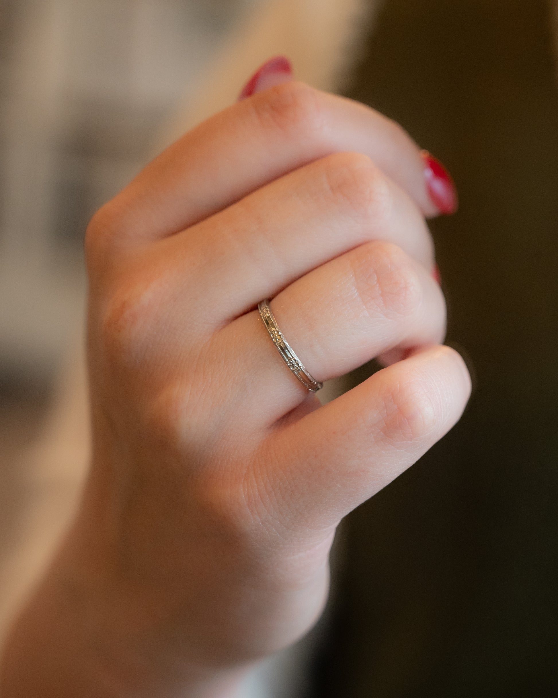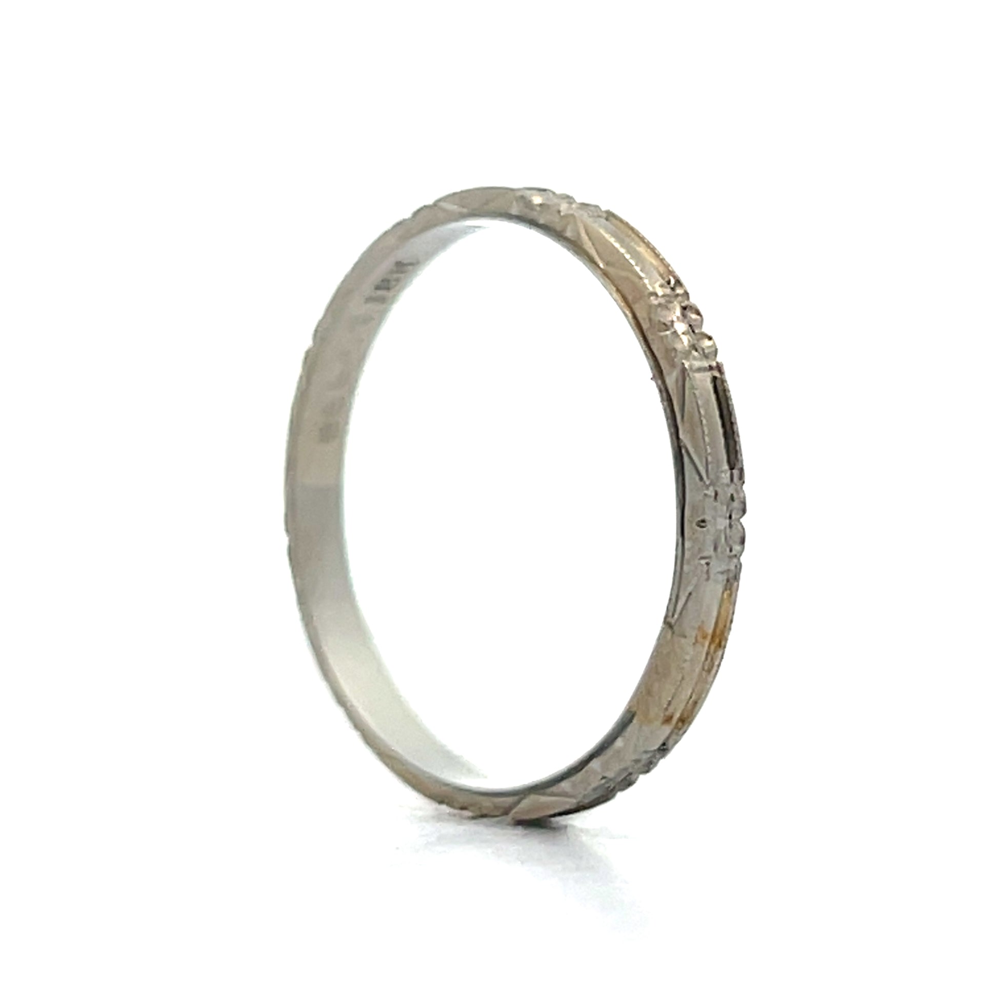 This Art Deco wedding band features orange blossom engravings and milgrain details in 18 karat white gold, with the authentic Belais Brothers signature mark. The contrasting textures create dimension while maintaining the distinctive Art Deco aesthetic that collectors value.