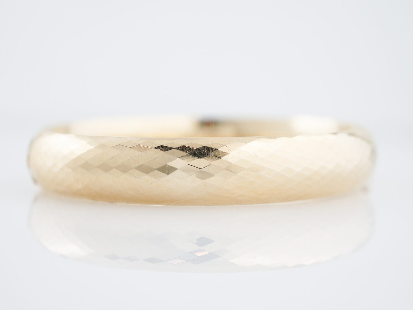 This mid-century bangle bracelet is simple yet lovely in its design. Forged in 14 karat yellow gold, the bracelet features a geometric diamond pattern that creates both texture and definition. The bangle is hinged, allowing for a secure fit.