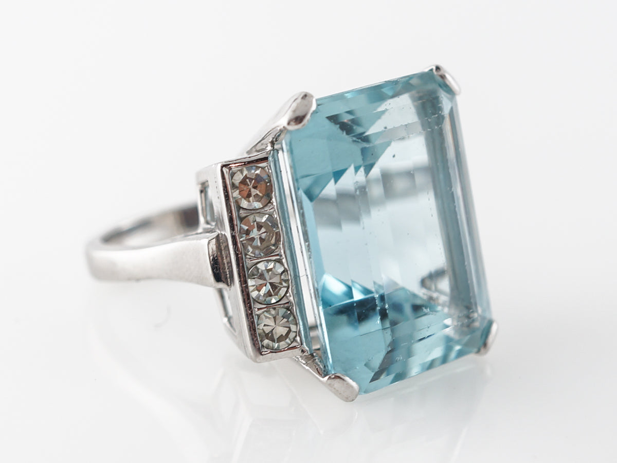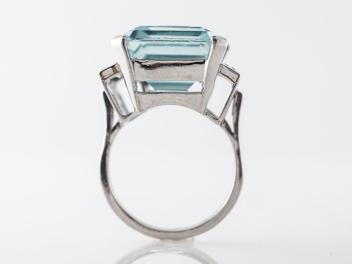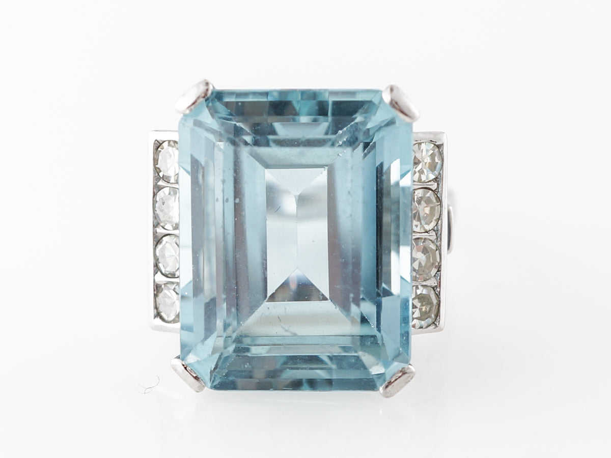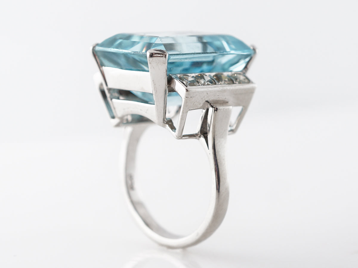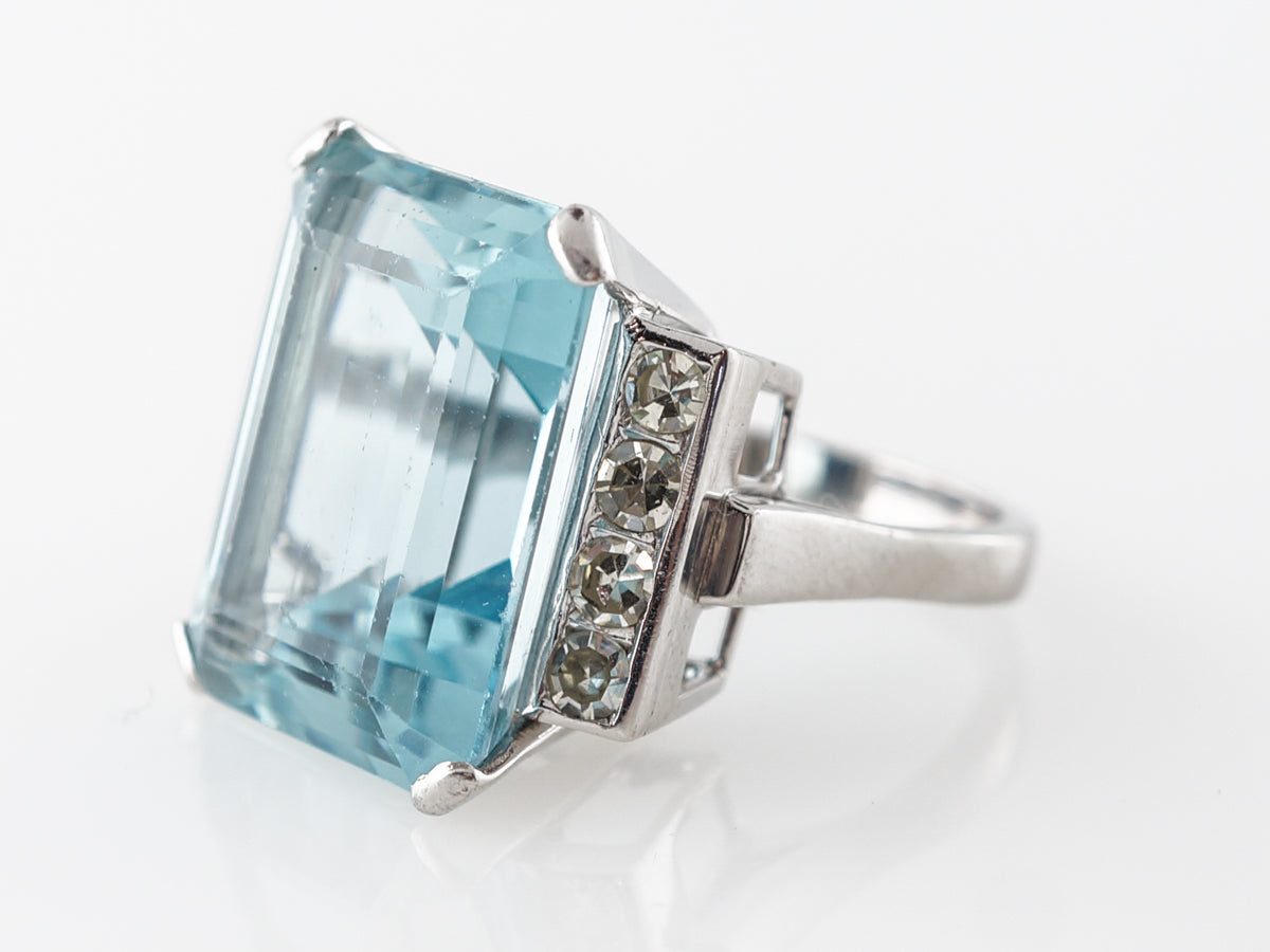 Vintage Deco Aquamarine Diamond Ring in Platinum. This Art Deco cocktail ring features a 16.80 carat emerald cut aquamarine with .50 carats of round accent diamonds and set in platinum. The size and setting of this ring make it a perfect cocktail party companion, but you could always wear this on a normal day out. The diamond accents provide a just enough extra sparkle to make this a dazzling piece that showcases the natural beauty of aquamarine.