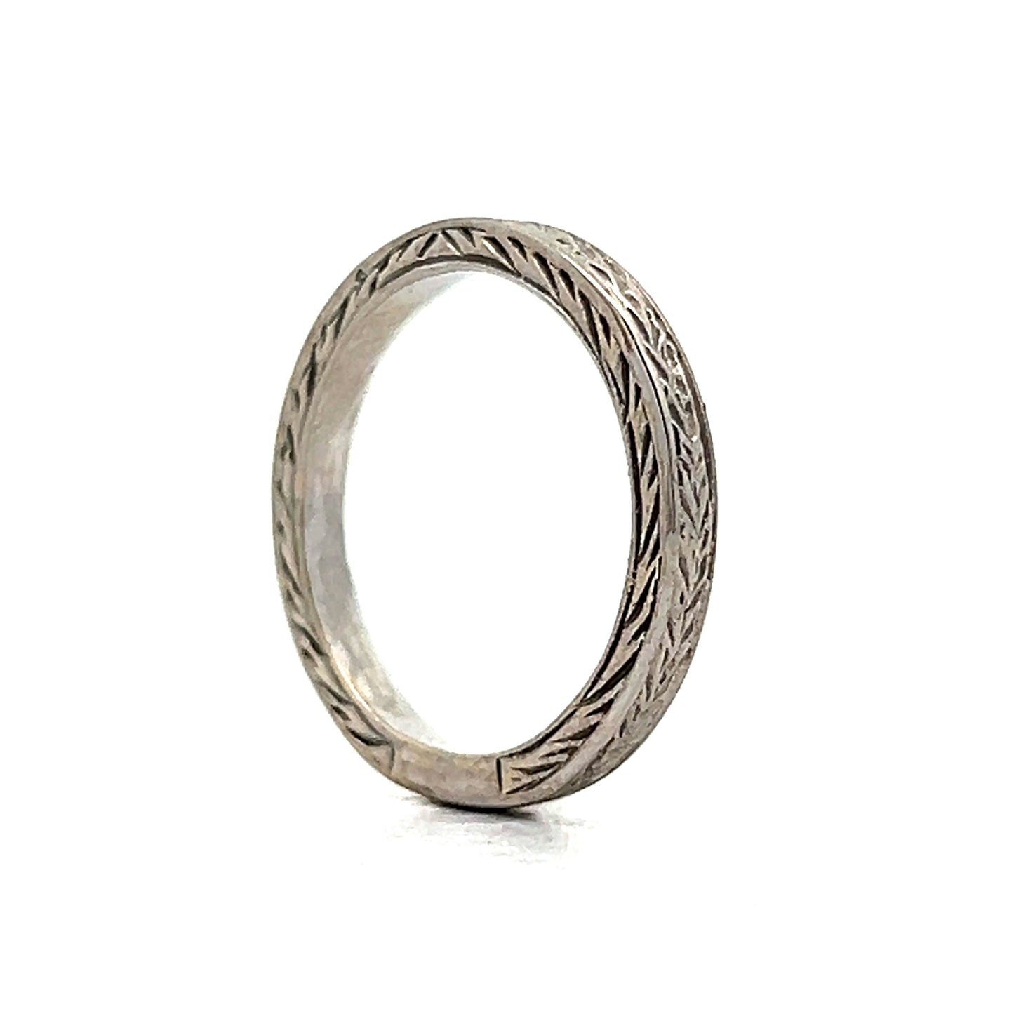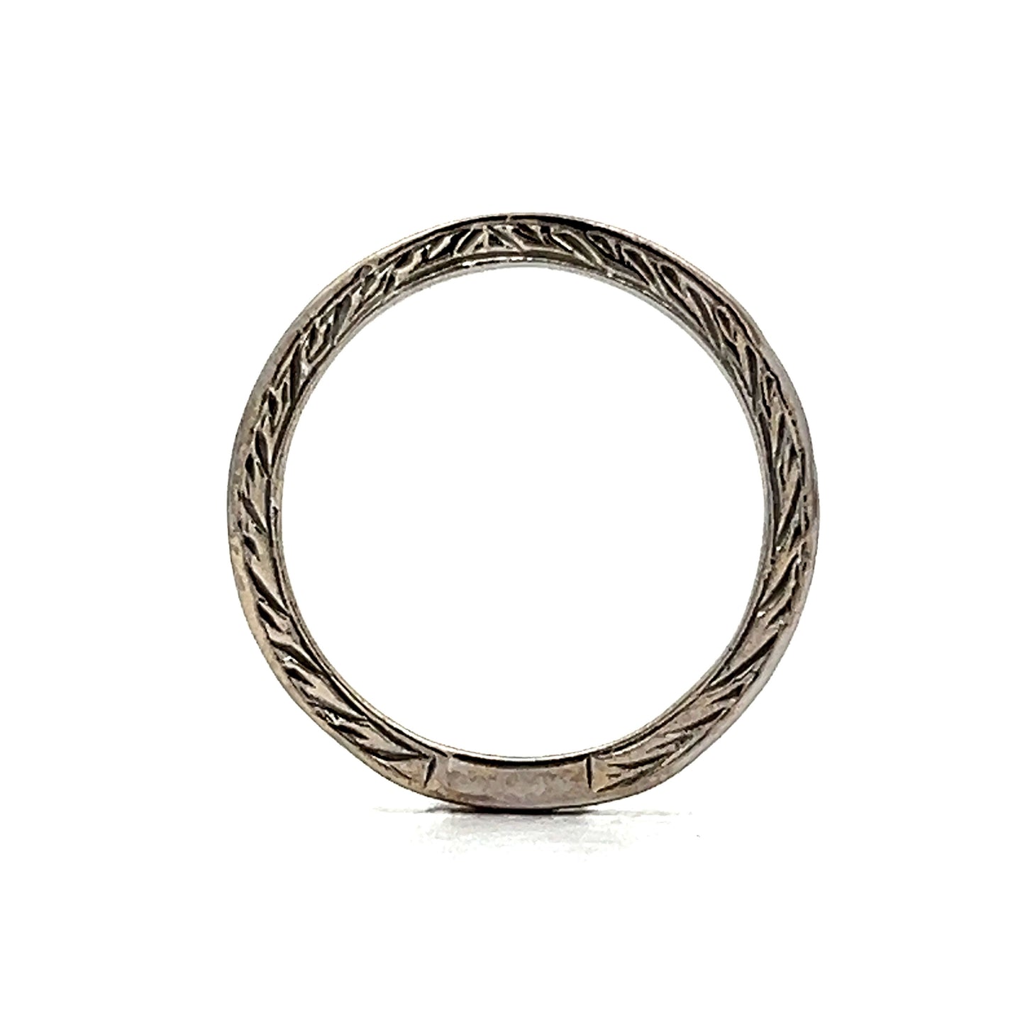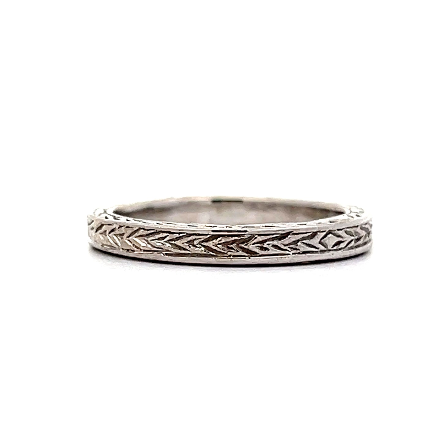 This one-of-a-kind vintage wedding band features an Art Deco design with hand-engraved chevron patterning. Expertly crafted in 14 karat white gold, this chic wedding band is the perfect choice for those who appreciate timeless fashion. The chevron pattern is delicately carved into the metal, adding subtle texture to the ring and making it truly unique.